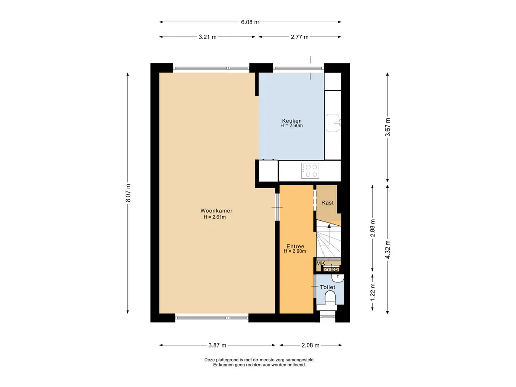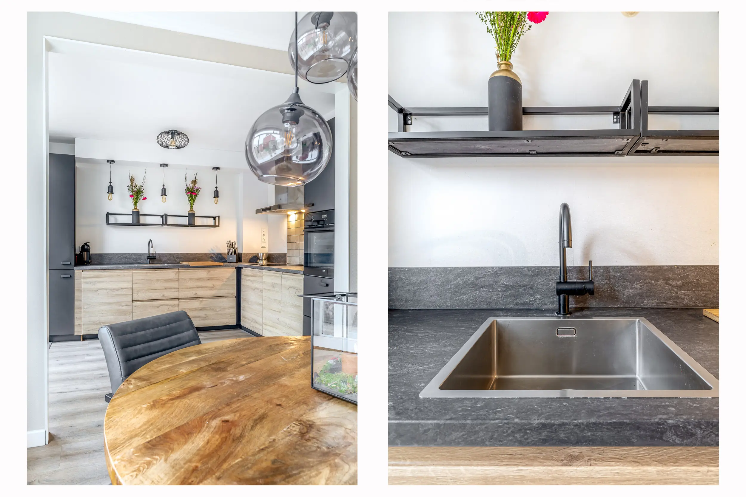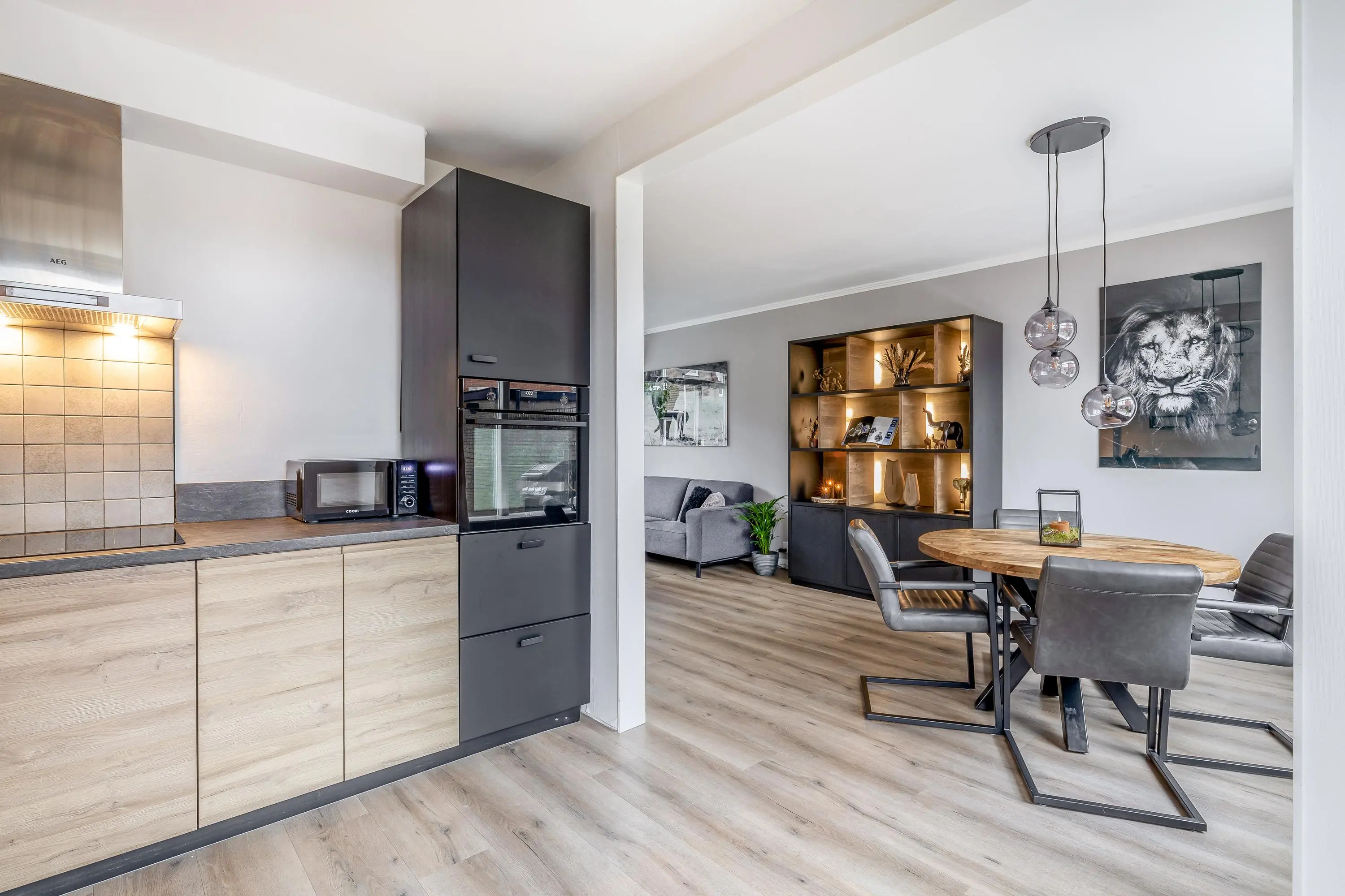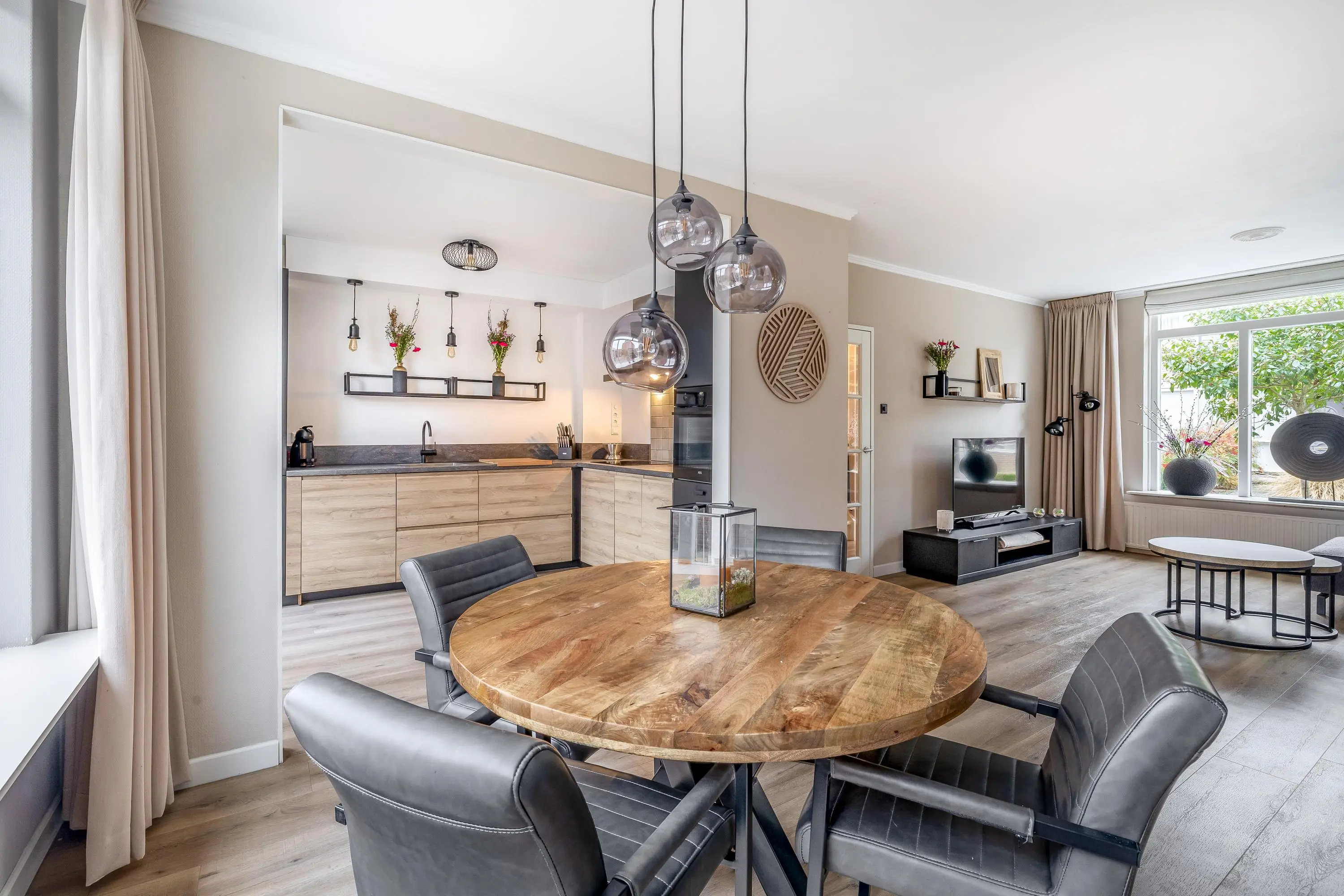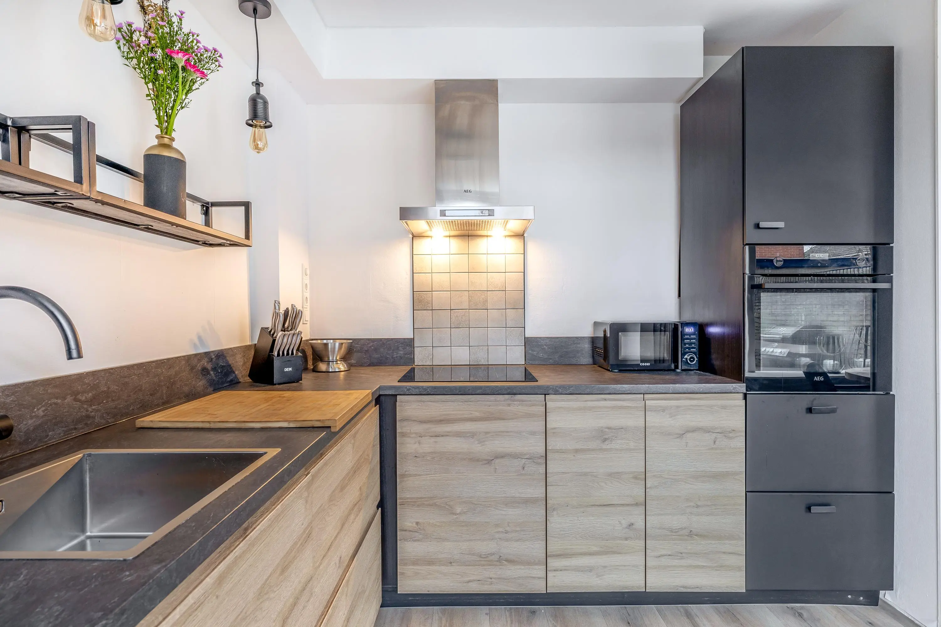 De open keuken heeft een warme uitstraling en is geplaatst in een praktische L-opstelling. De keuken is compleet uitgerust met een inductiekookplaat, afzuigkap, oven, vaatwasser en een koel-/vriescombinatie. Vanuit de keuken is er via een enkele deur directe toegang tot de achtertuin.