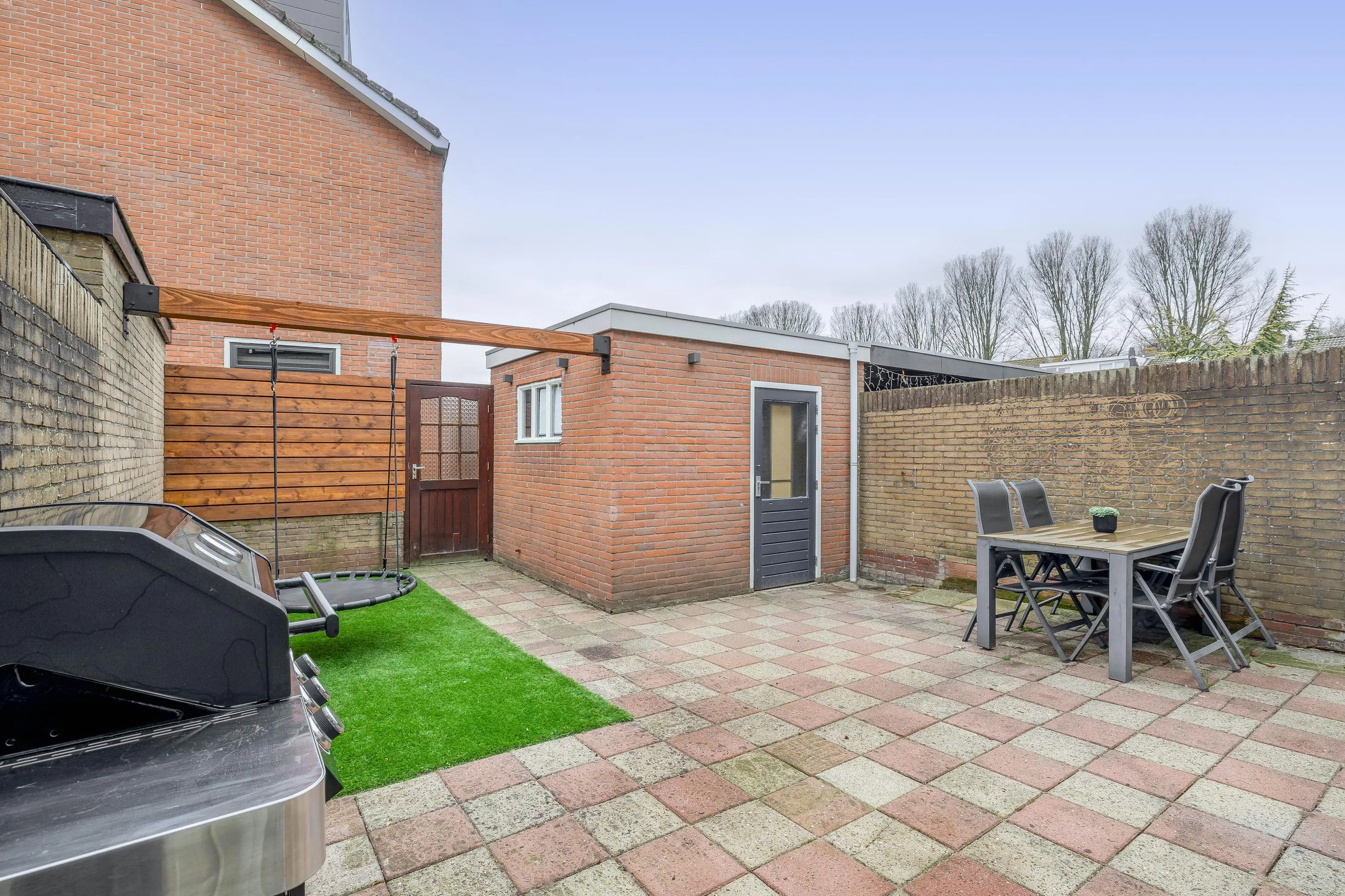 De ruime achtertuin is onderhoudsvriendelijk aangelegd met sierbestrating en een gedeelte kunstgras. Dankzij de gunstige ligging op het zuidwesten geniet u hier de hele dag van de zon. Aan de achtergevel is een zonnescherm aanwezig voor extra comfort. Achterin de tuin bevindt zich een praktische stenen berging voorzien van elektra. Daarnaast is de tuin bereikbaar via een achterom.