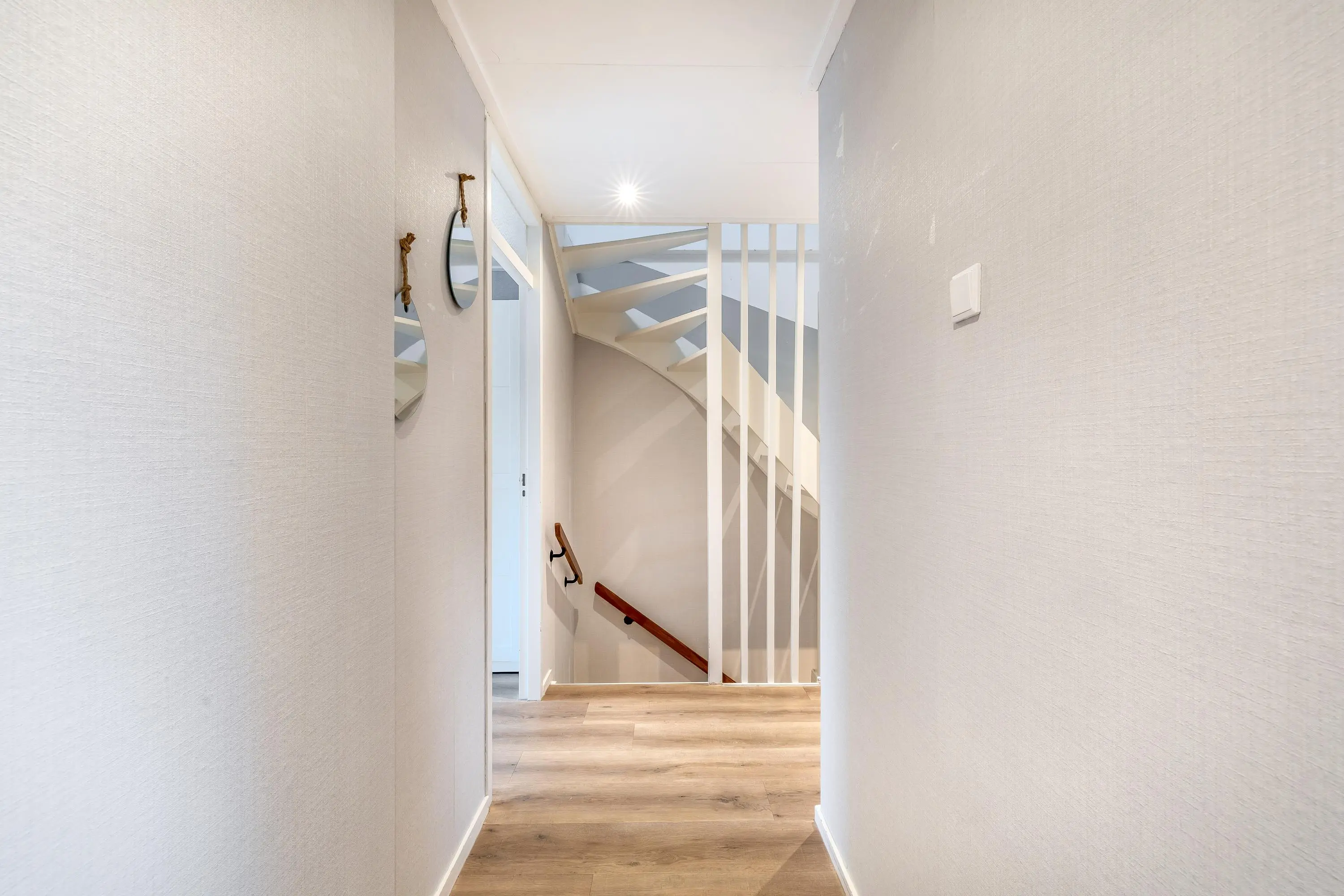 De overloop is afgewerkt met dezelfde vloer als op de begane grond en biedt toegang tot drie slaapkamers, de badkamer en de trapopgang naar de tweede verdieping.