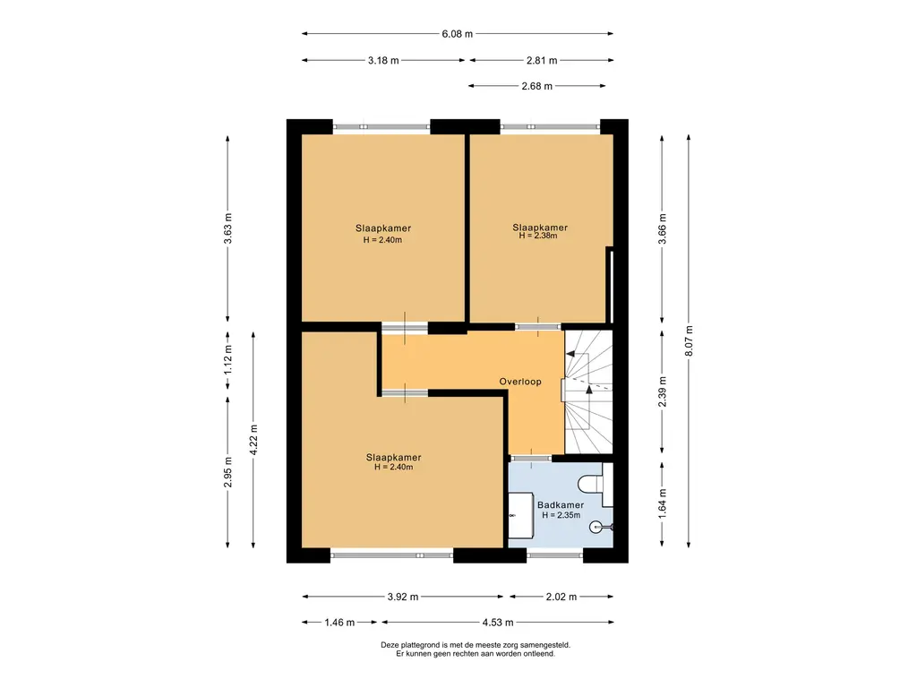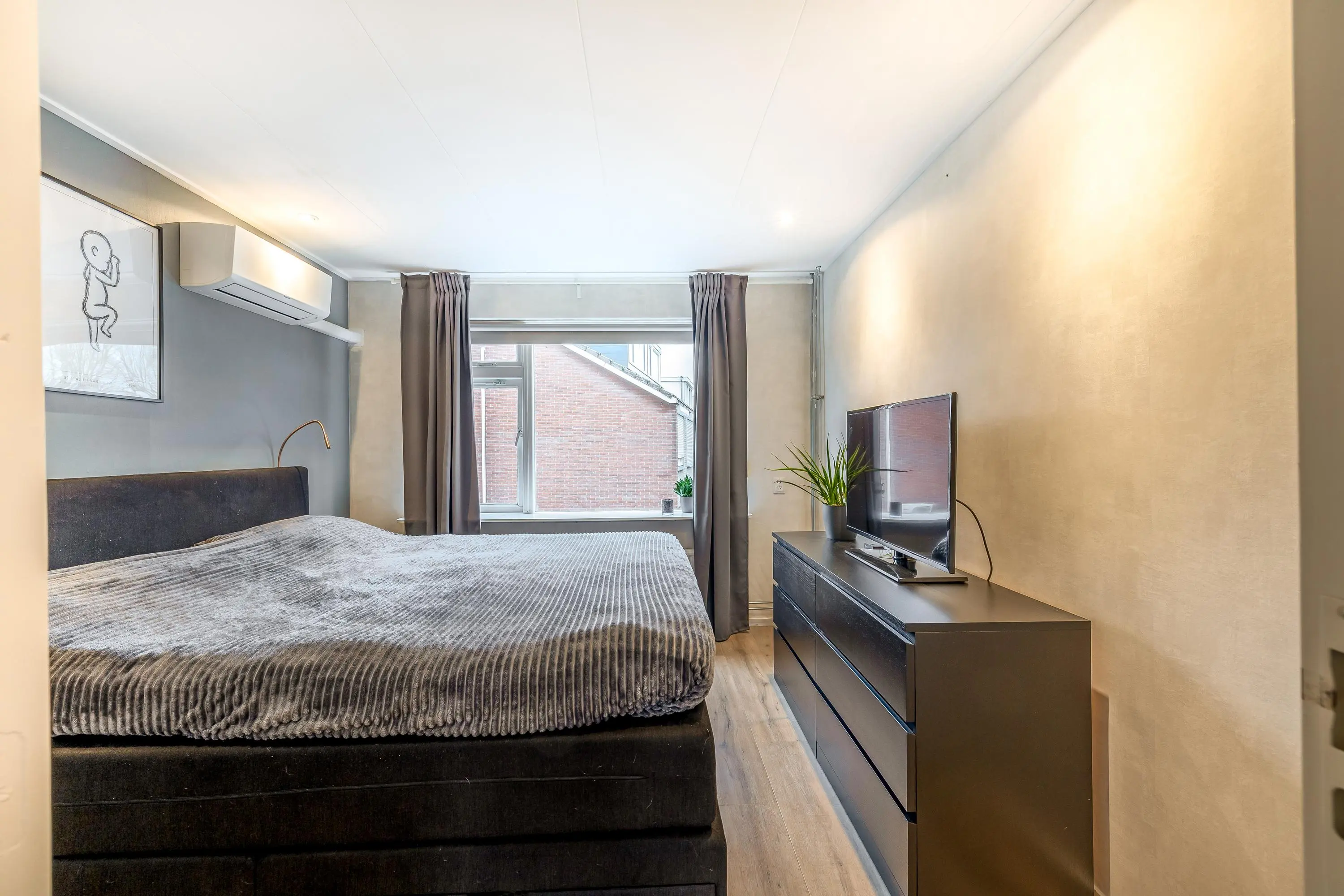 De hoofdslaapkamer bevindt zich aan de voorzijde van de woning en heeft een oppervlakte van circa 16m². De tweede en derde slaapkamer liggen aan de achterzijde van de woning. De tweede slaapkamer meet ongeveer 11,5m² en is voorzien van airconditioning, wat zorgt voor extra comfort. De derde slaapkamer heeft een oppervlakte van circa 10m². Alle slaapkamers zijn uitgerust met praktische rolluiken.