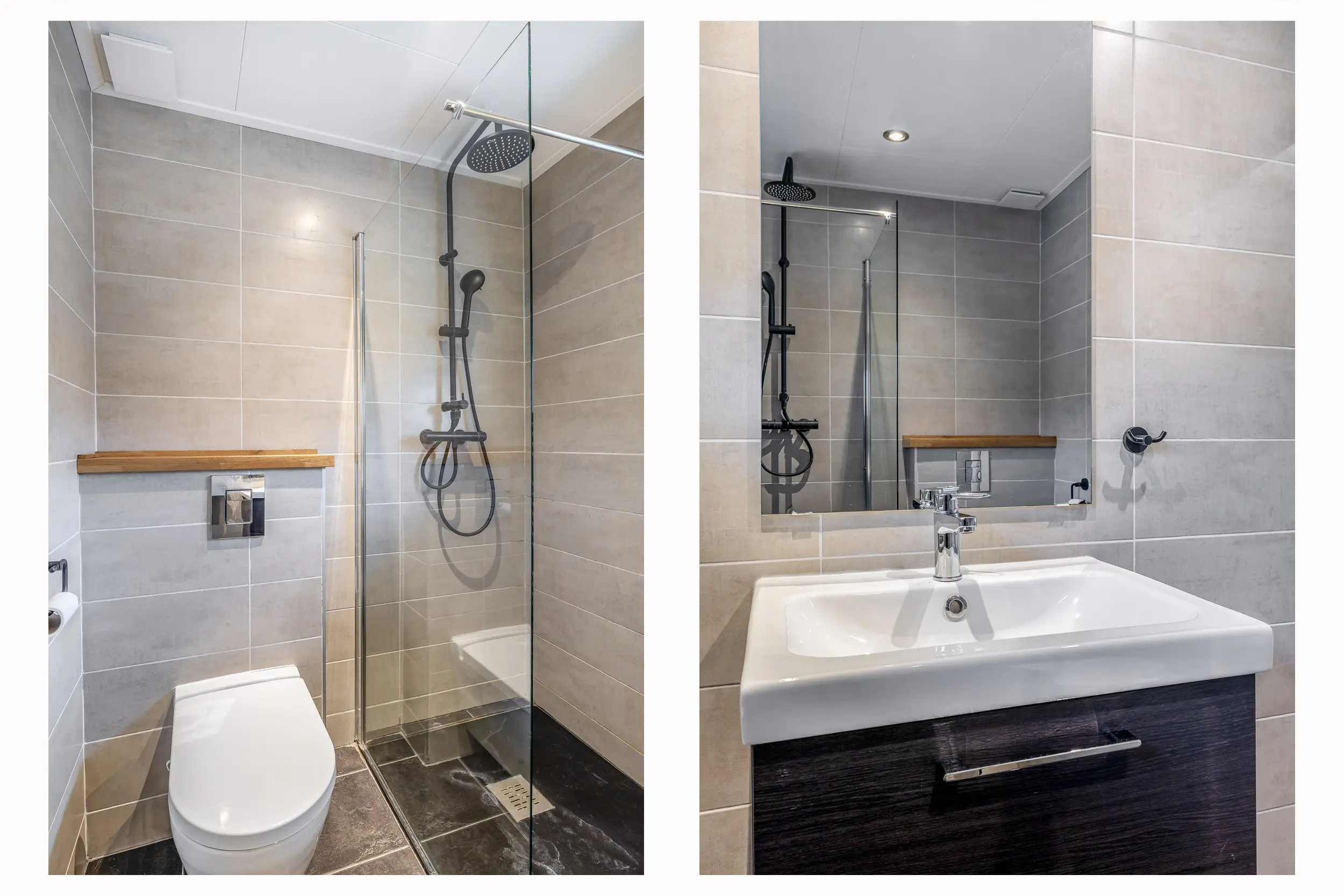 De moderne badkamer is volledig betegeld en voorzien van een inloopdouche, toilet, wastafelmeubel en een designradiator. Daarnaast beschikt de badkamer over een raam voor natuurlijke ventilatie en daglicht.