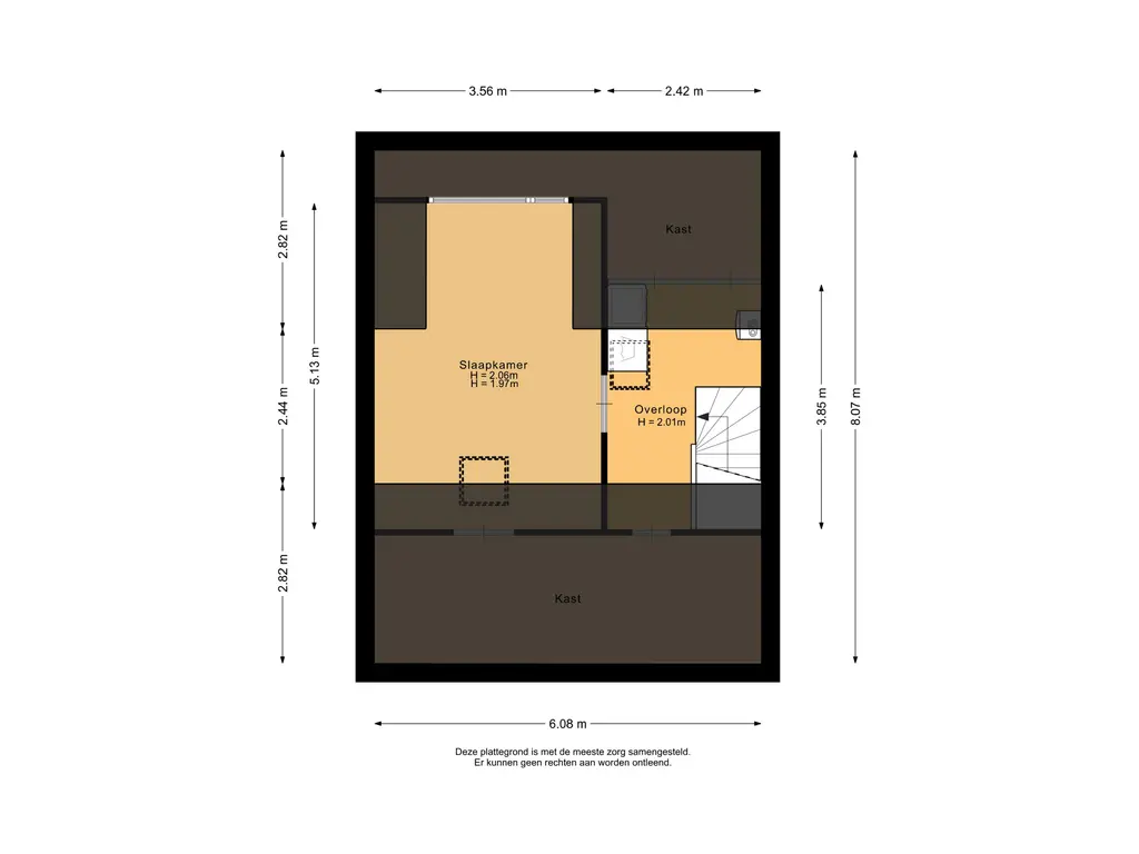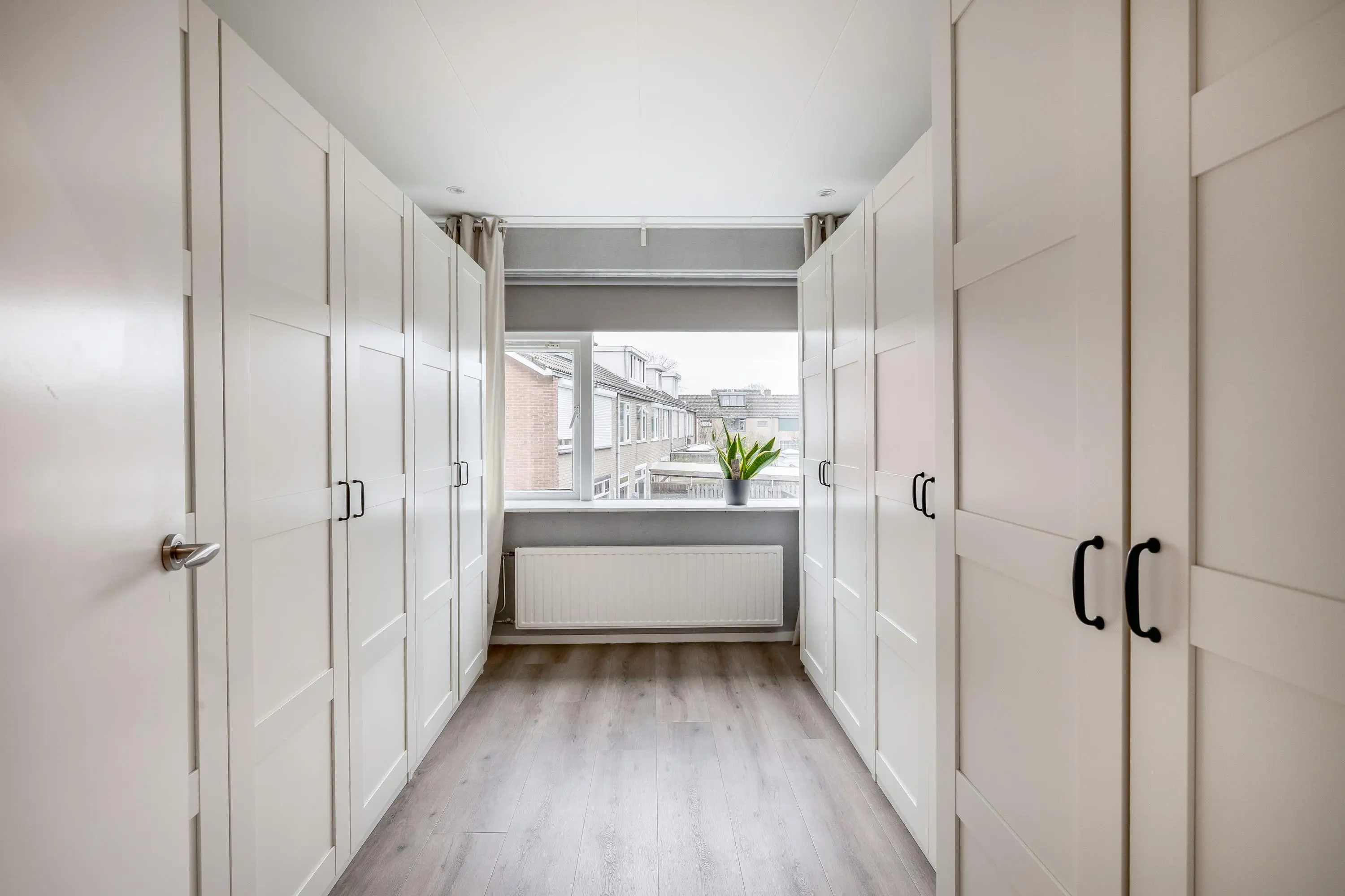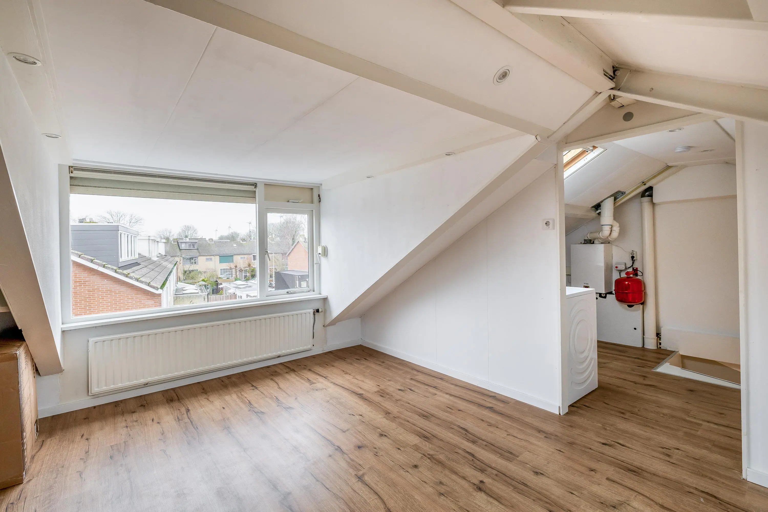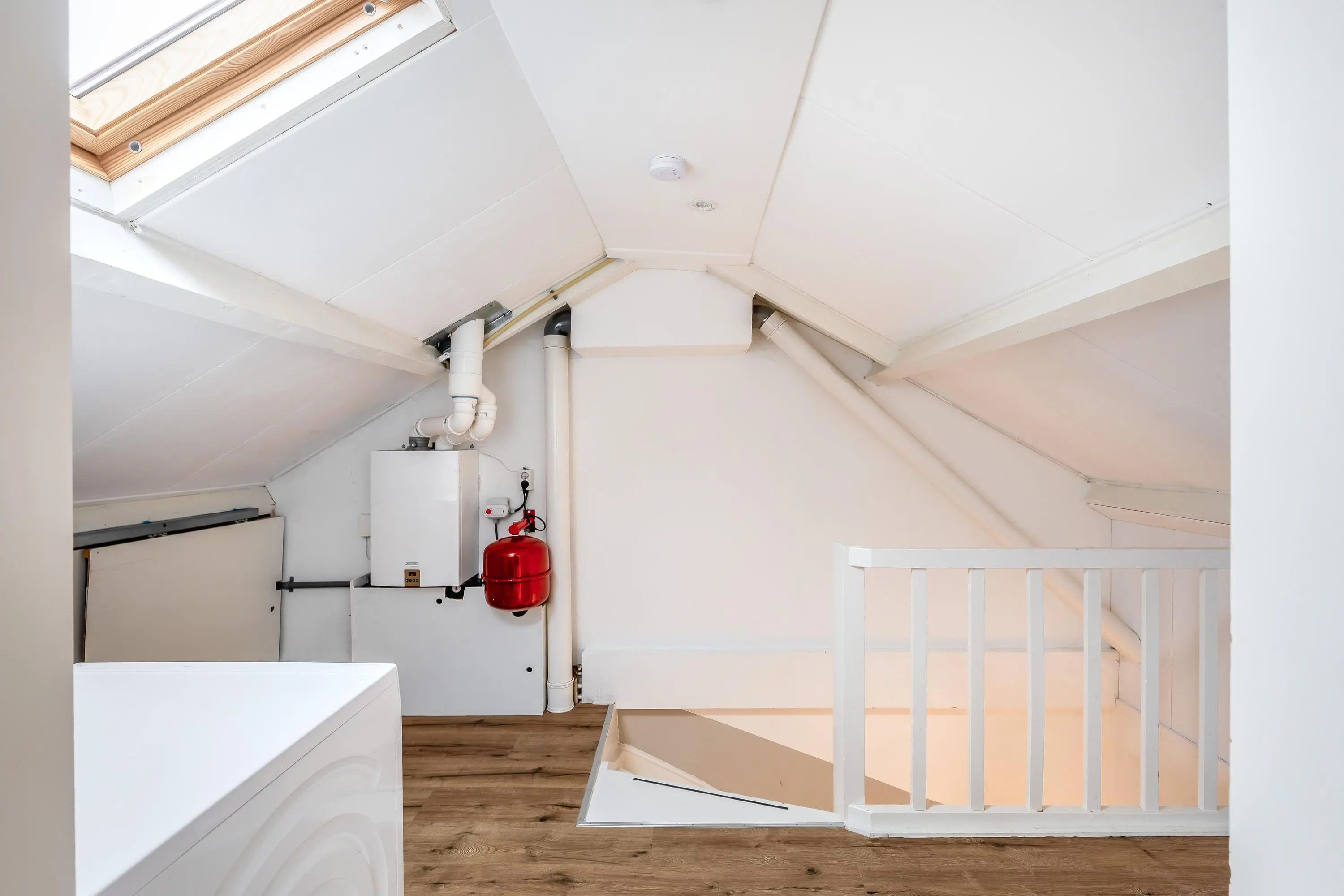 De overloop is afgewerkt met een nette laminaatvloer die doorloopt in de slaapkamer. Hier bevinden zich de CV-opstelling en de aansluitingen voor wasmachine en droger. Achter de knieschotten aan beide zijden is extra bergruimte gerealiseerd.