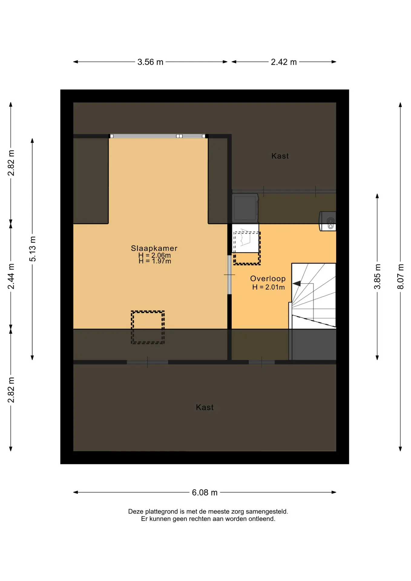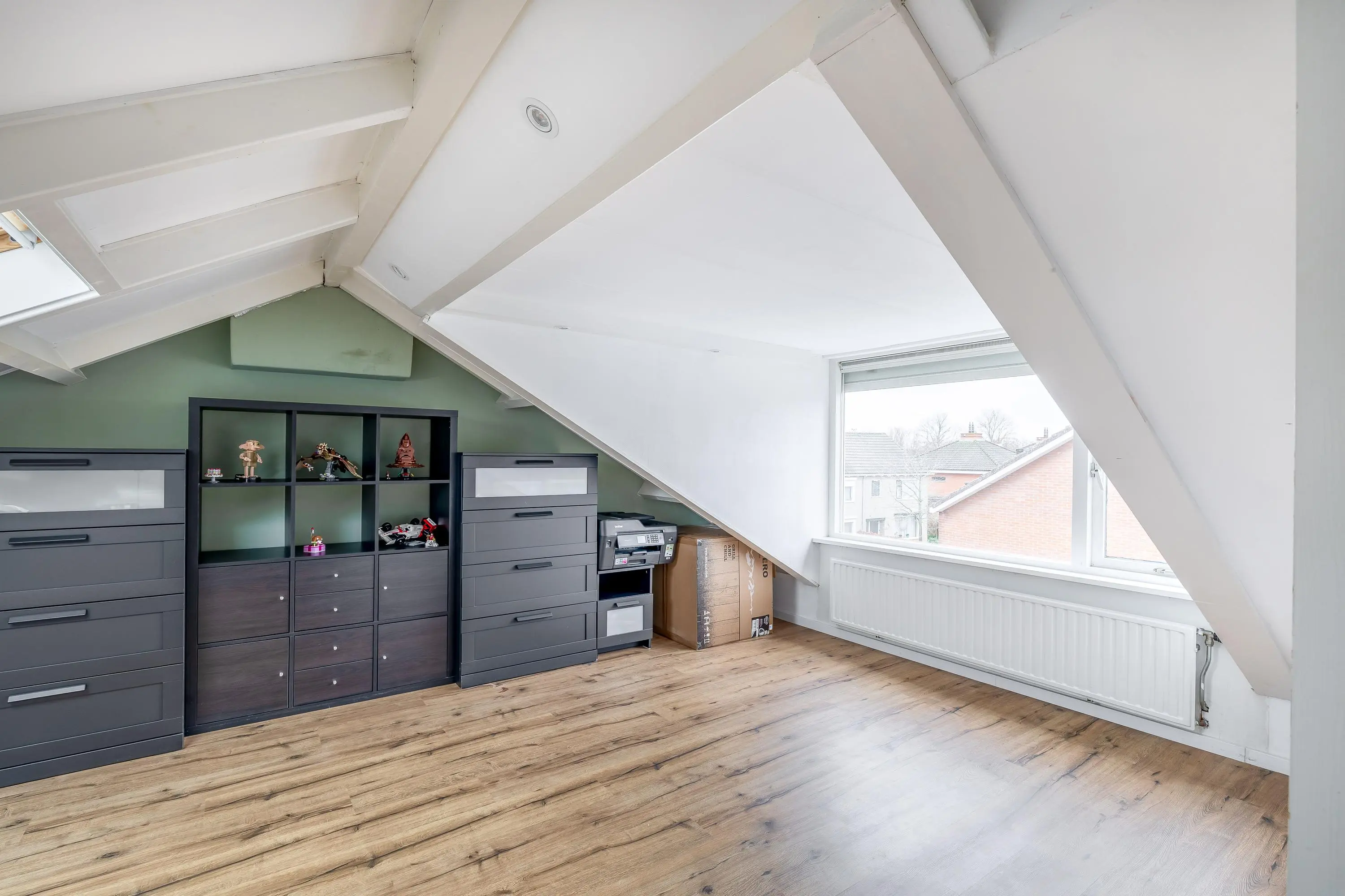 De slaapkamer is ruim van opzet dankzij de dakkapel. In combinatie met het dakraam zorgt dit voor een prettige hoeveelheid daglicht. Het raam van de dakkapel is voorzien van een rolluik. Ook hier is extra bergruimte aanwezig achter een schot.