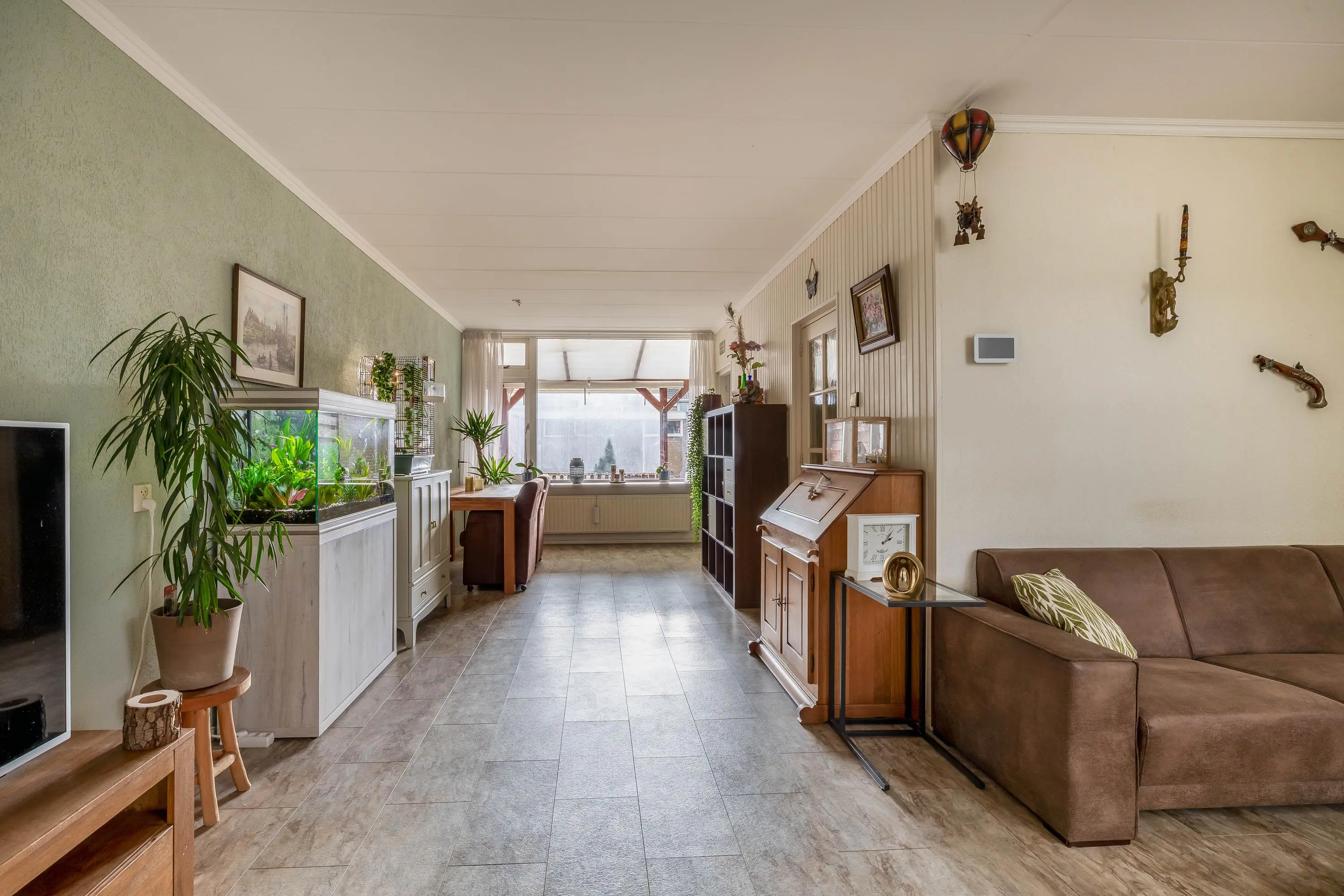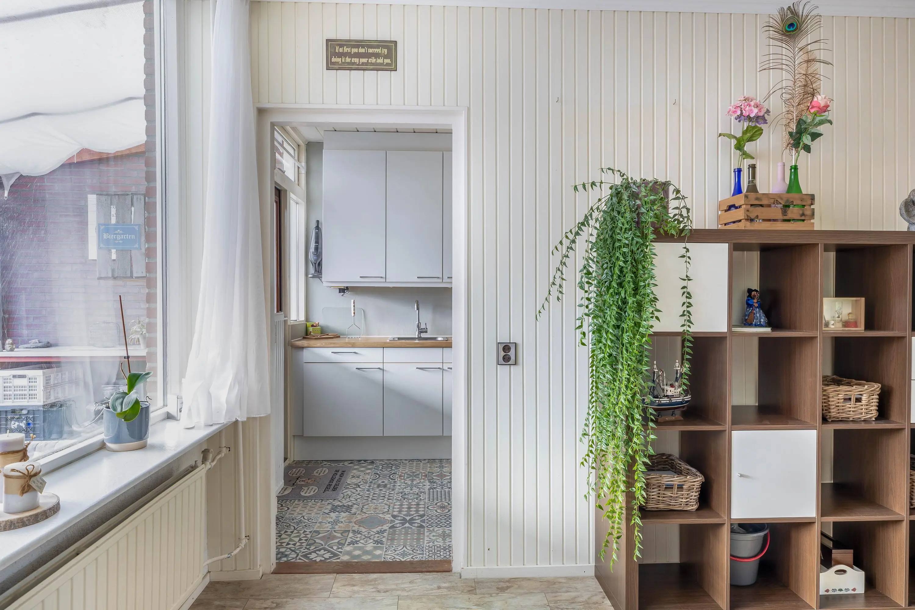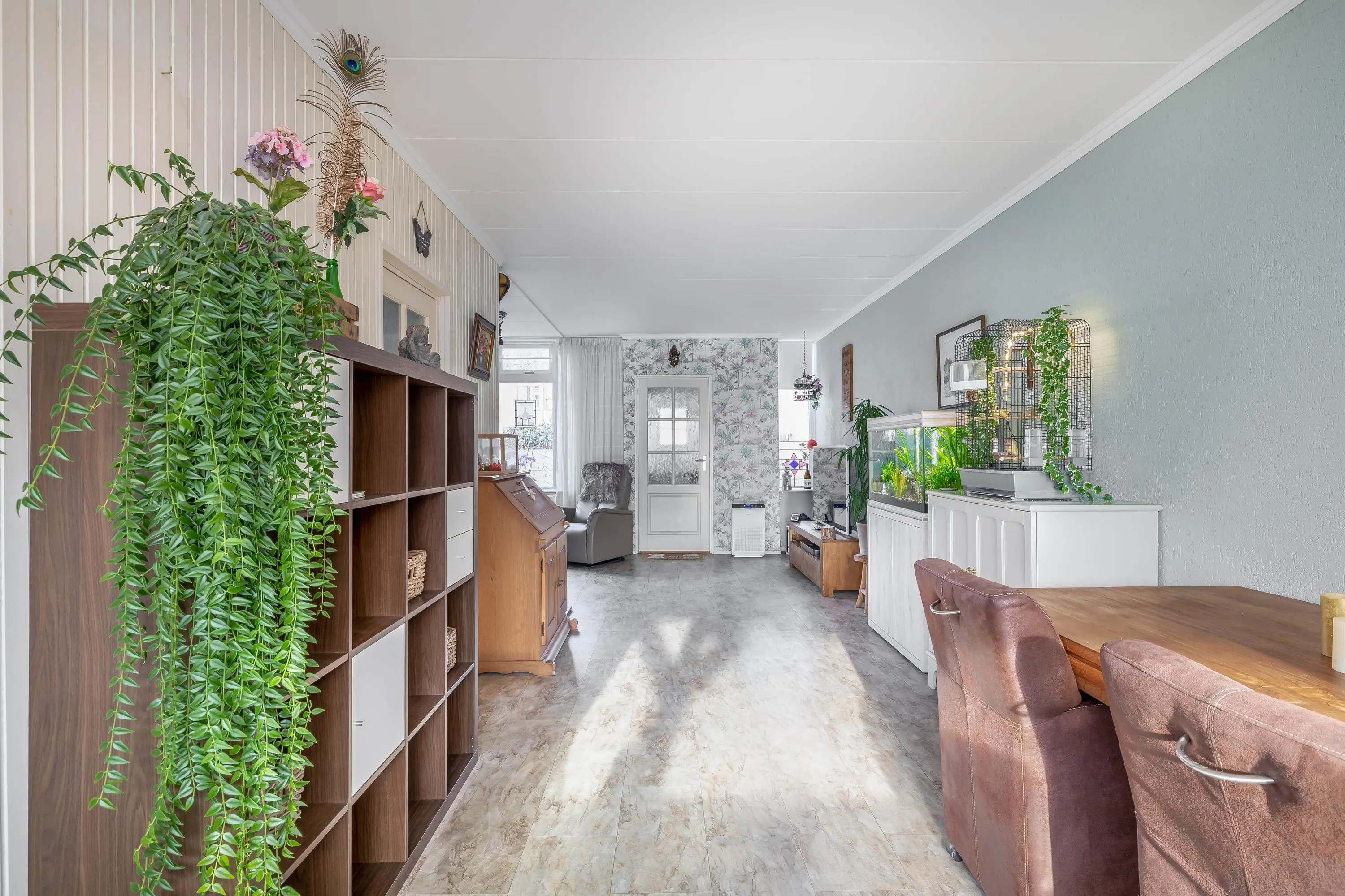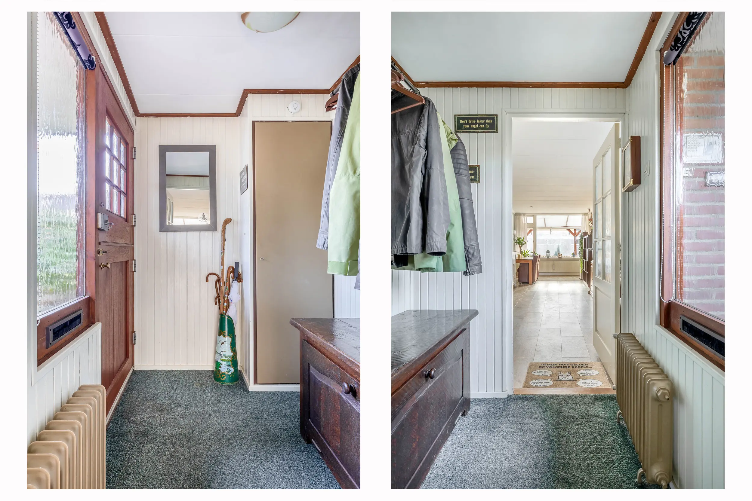 Entree/hal met vloerbedekking en toegang tot de meterkast. Vanuit de hal stap je de lichte doorzonwoonkamer binnen, waar het daglicht van beide zijden rijkelijk naar binnen valt. De leefruimte is afgewerkt met een nette laminaatvloer, wat zorgt voor een warme en rustige uitstraling.