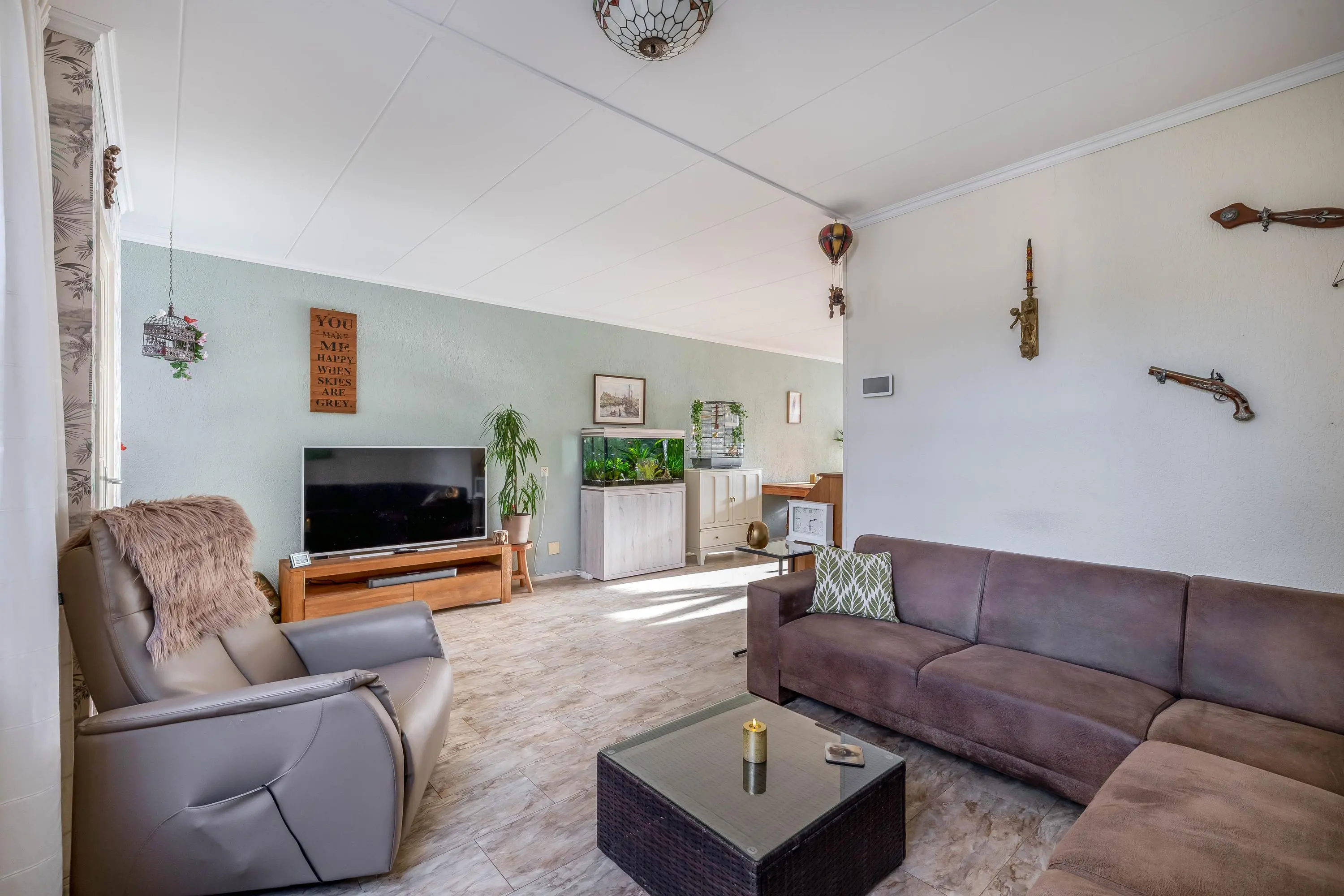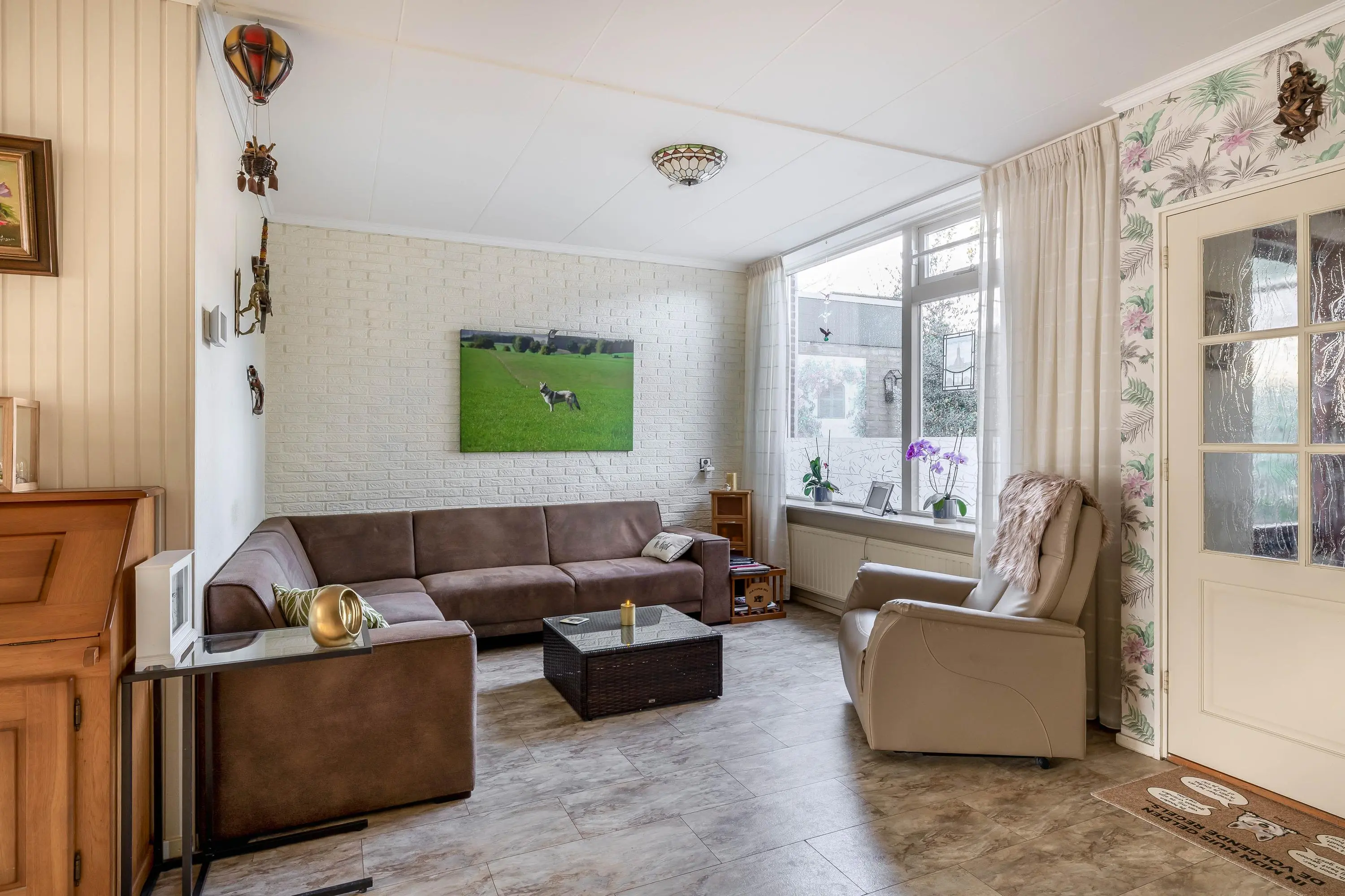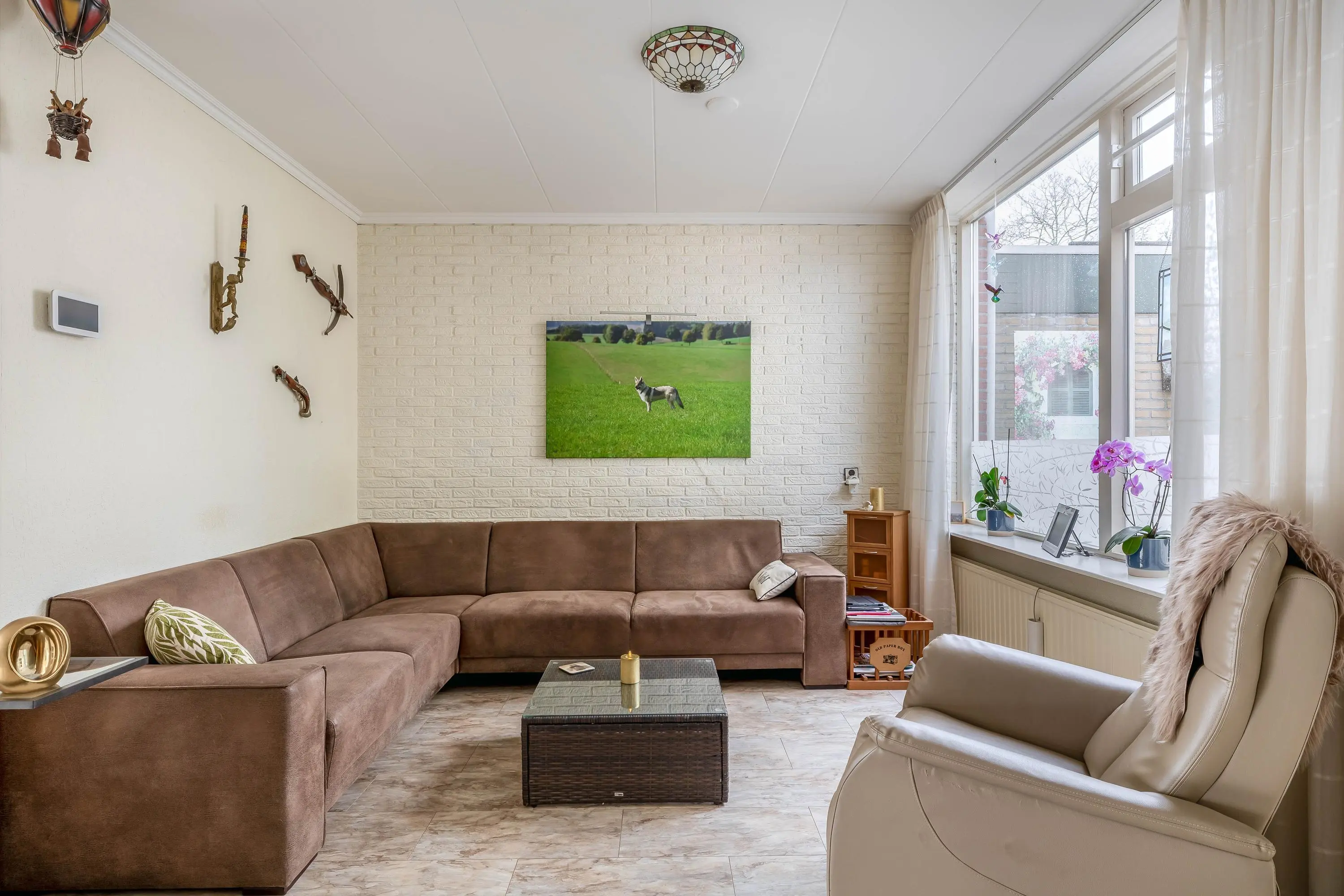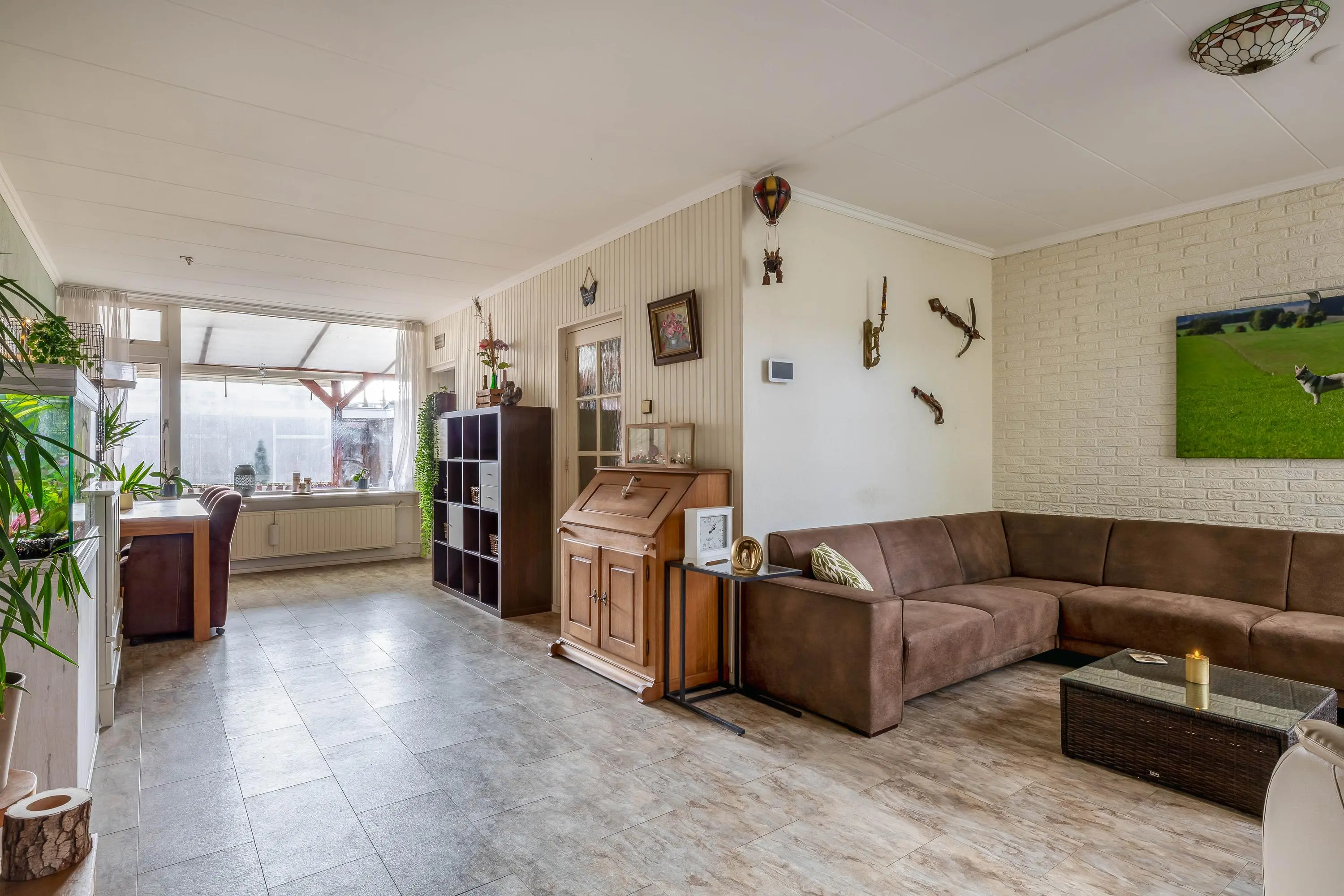 Entree/hal met vloerbedekking en toegang tot de meterkast. Vanuit de hal stap je de lichte doorzonwoonkamer binnen, waar het daglicht van beide zijden rijkelijk naar binnen valt. De leefruimte is afgewerkt met een nette laminaatvloer, wat zorgt voor een warme en rustige uitstraling.