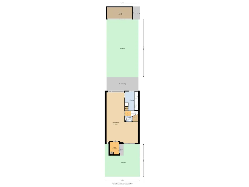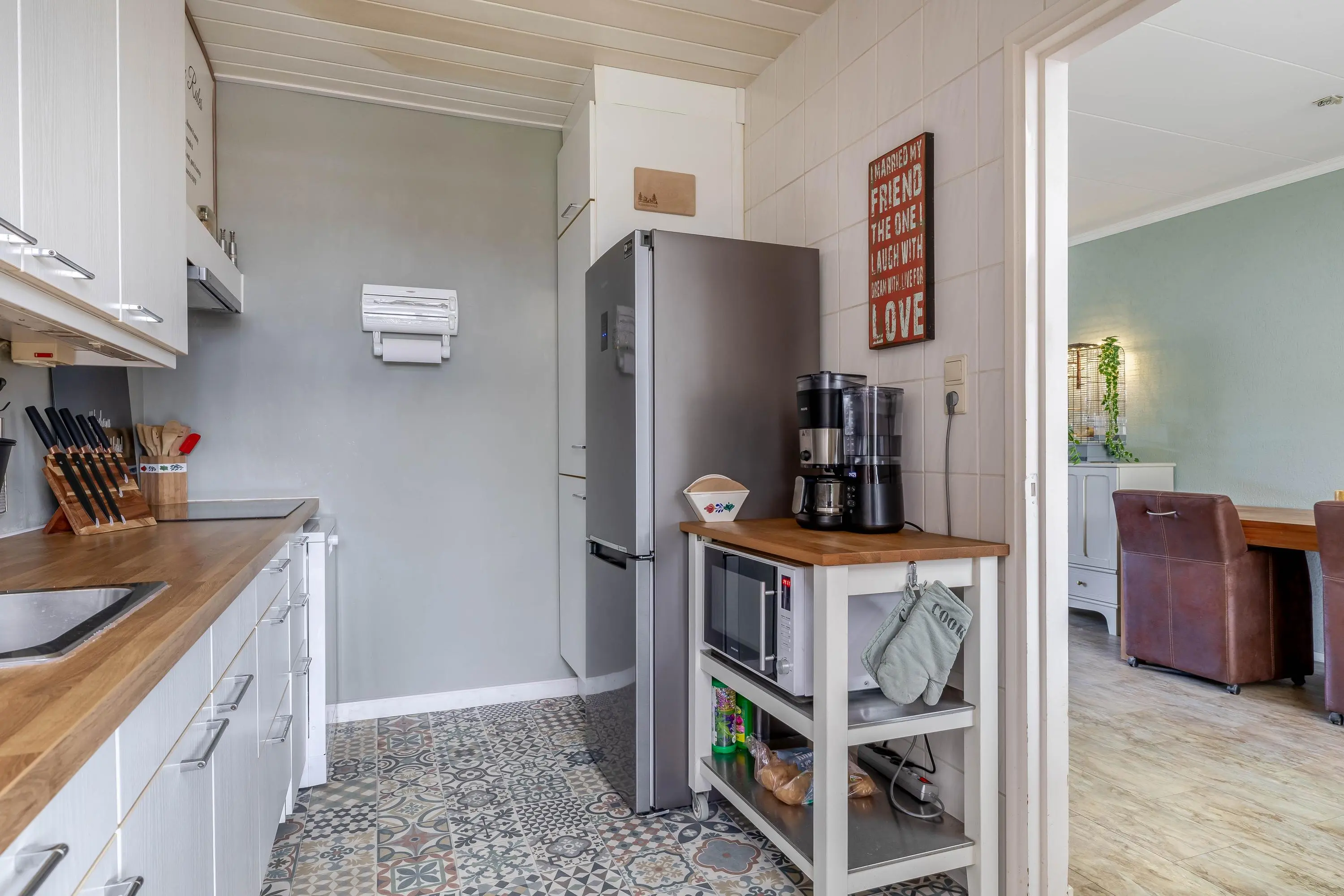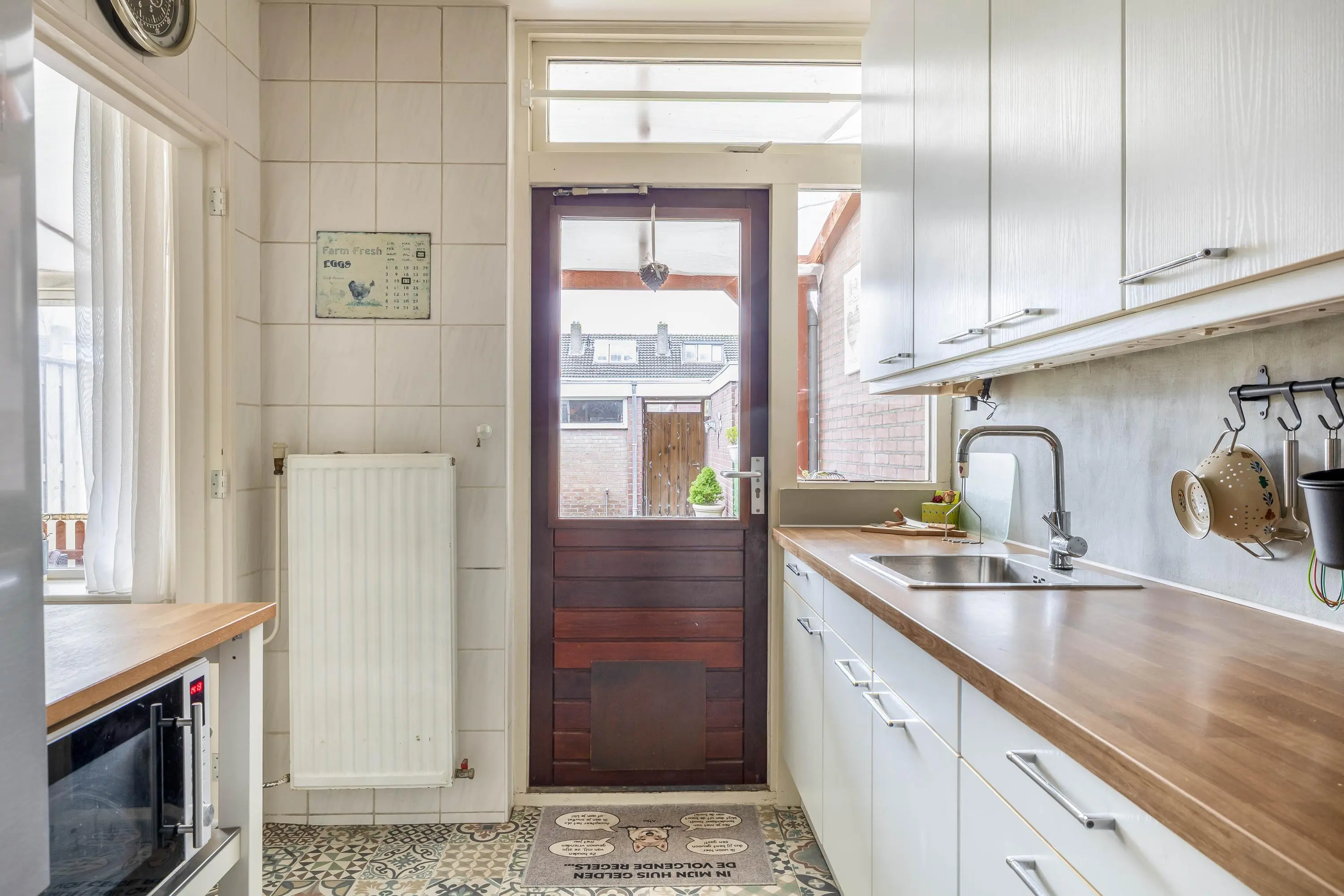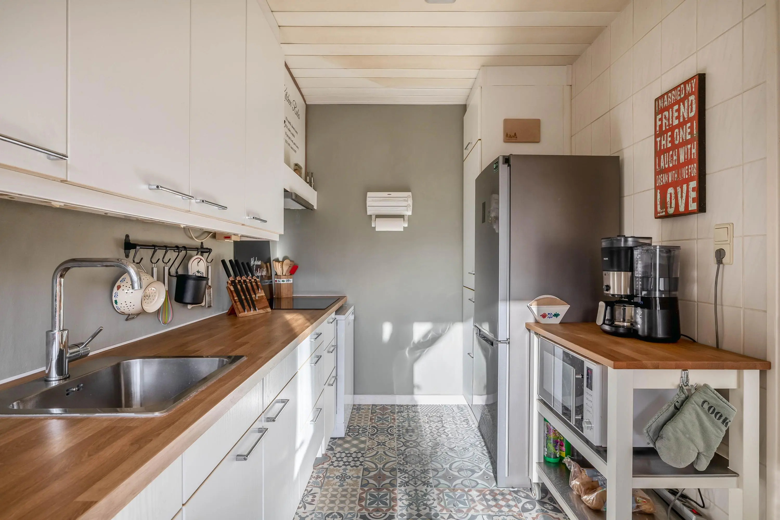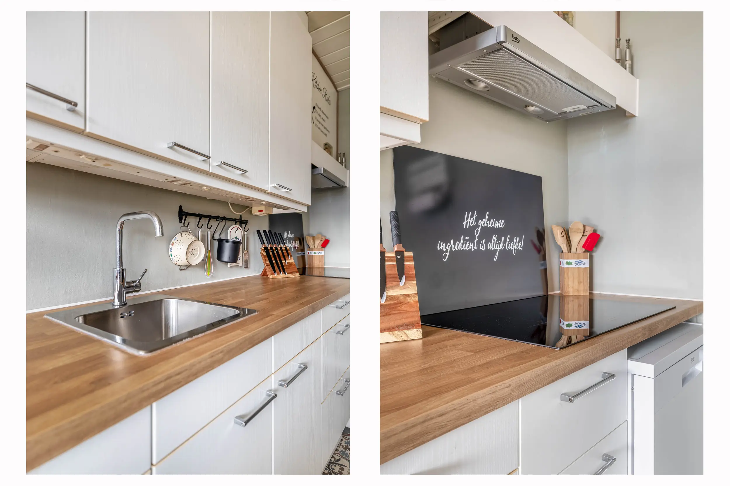 De halfopen keuken in rechte opstelling is voorzien van een inductiekookplaat, afzuiging en losse apparatuur. Via een enkele deur is er toegang tot de royale achtertuin.