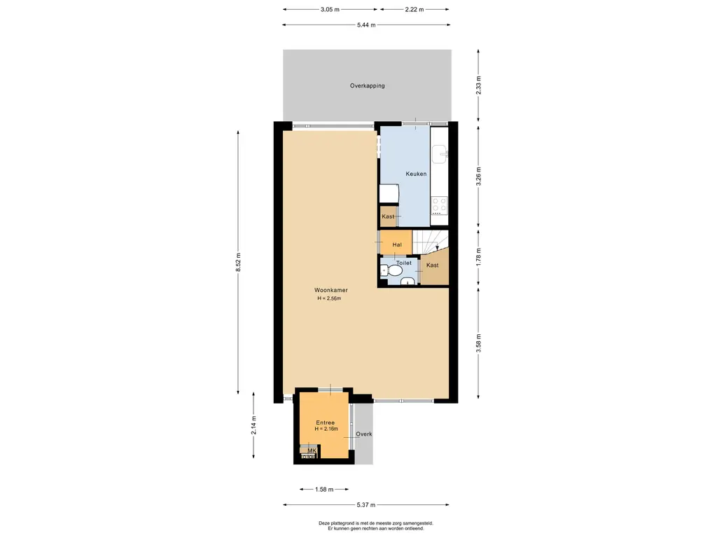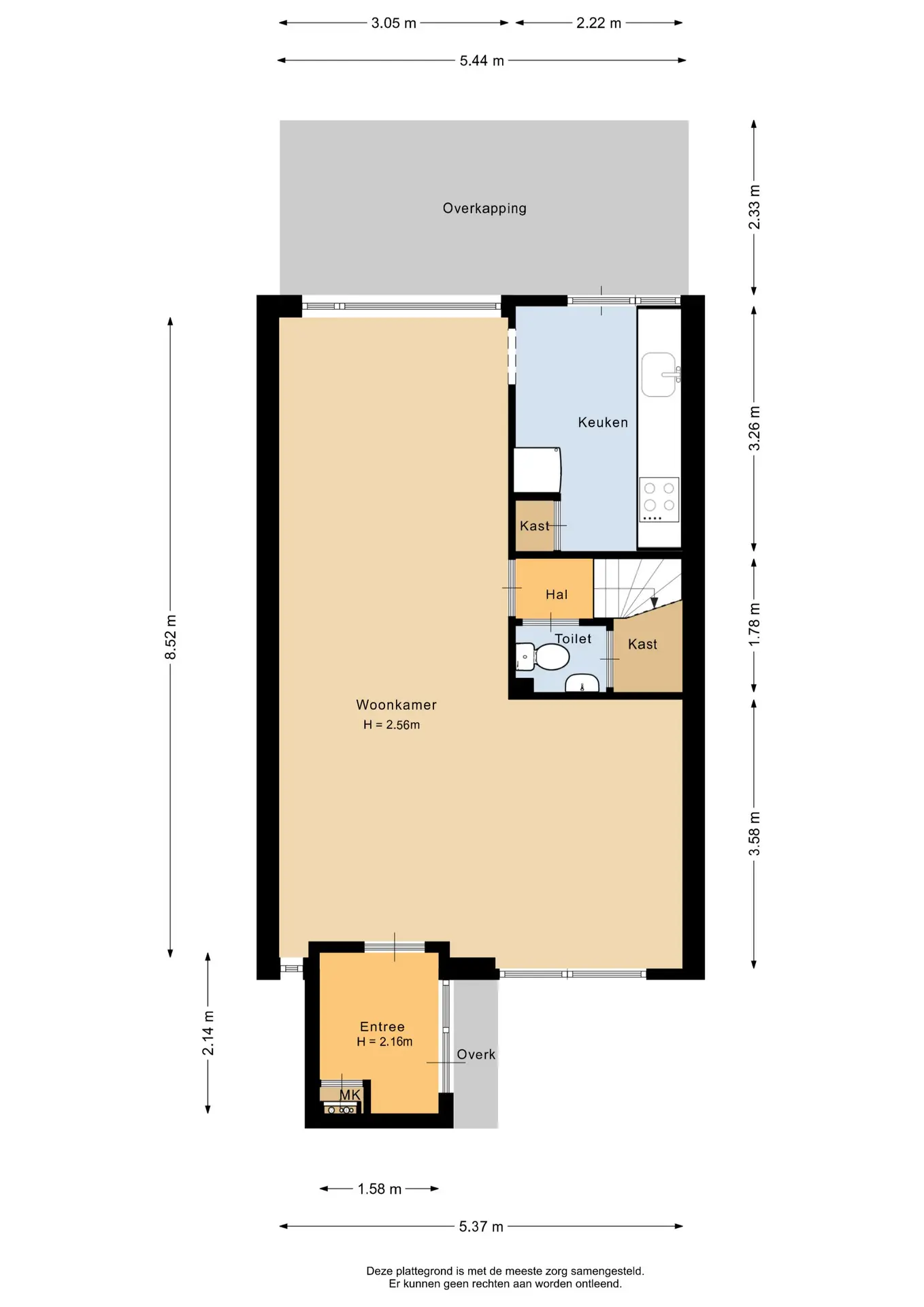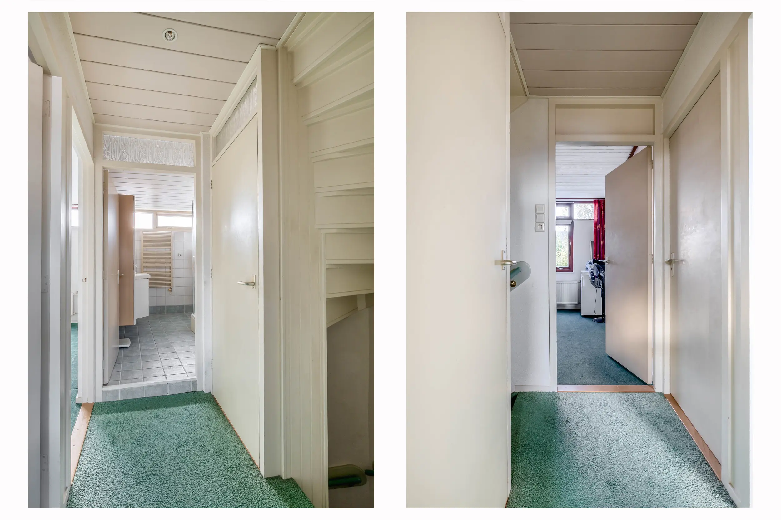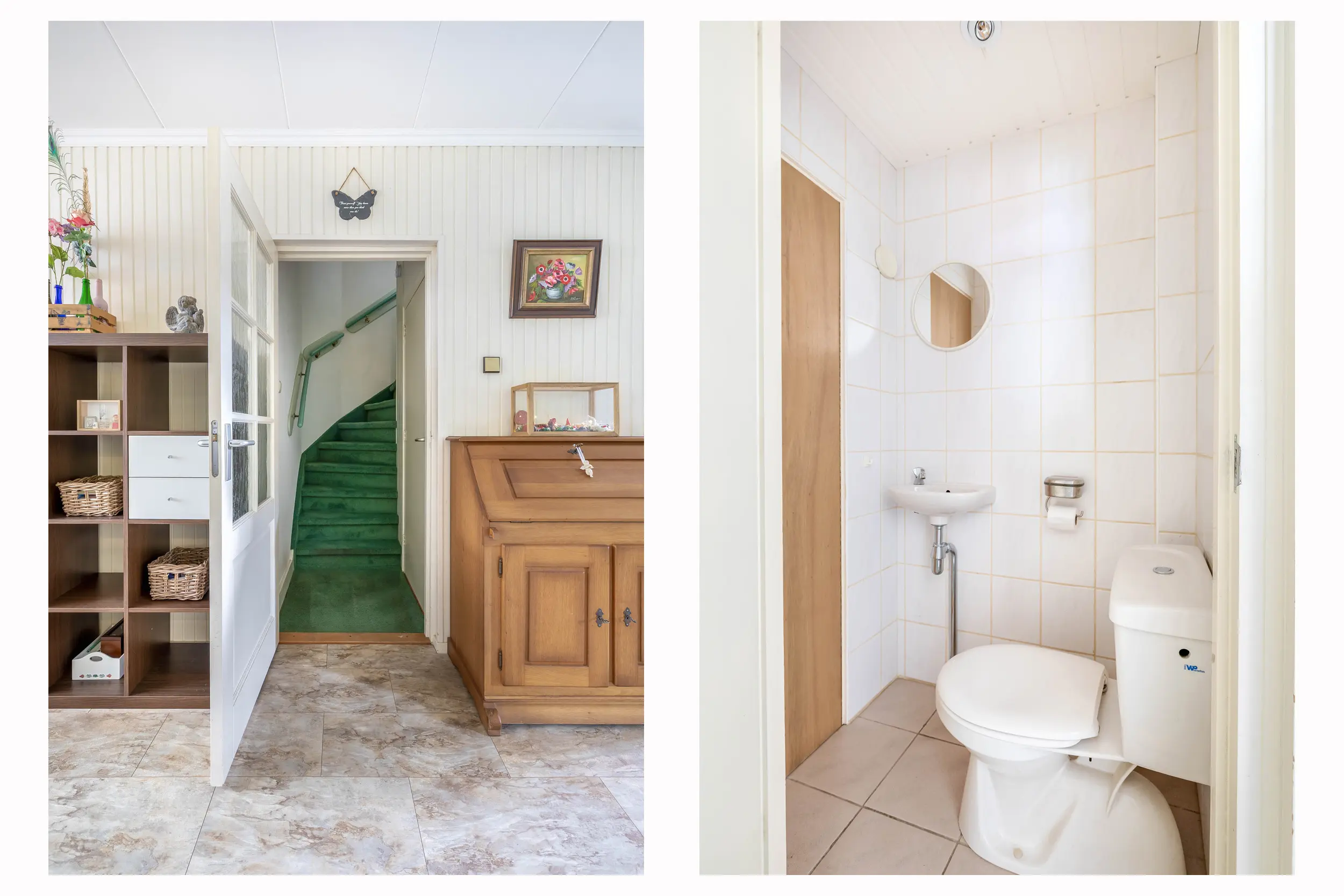 Centraal in de woonkamer bevindt zich een afgesloten tussenhal met de trapopgang naar de eerste verdieping. Hier vind je tevens het separate toilet met fonteintje én toegang tot de praktische trapkast.