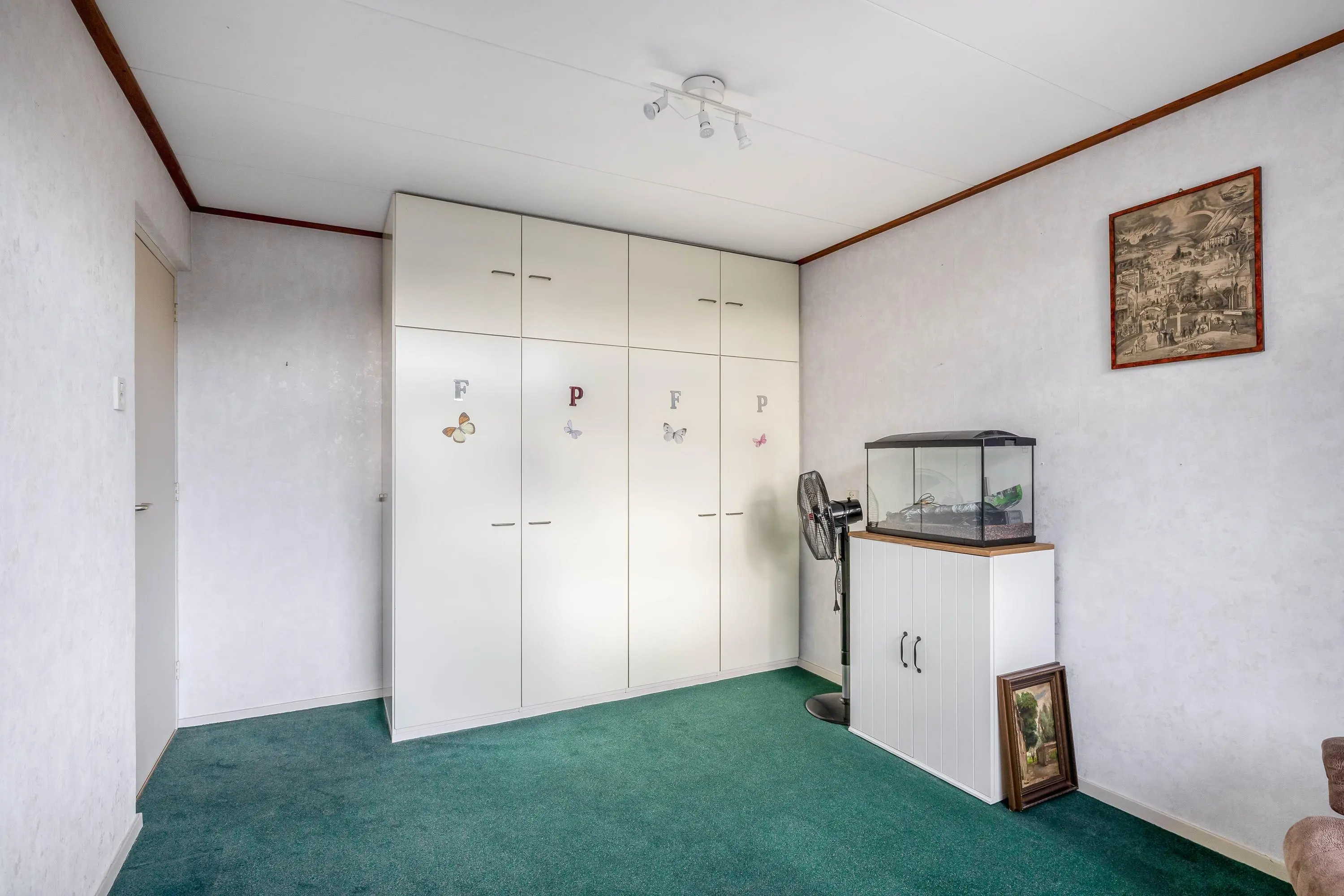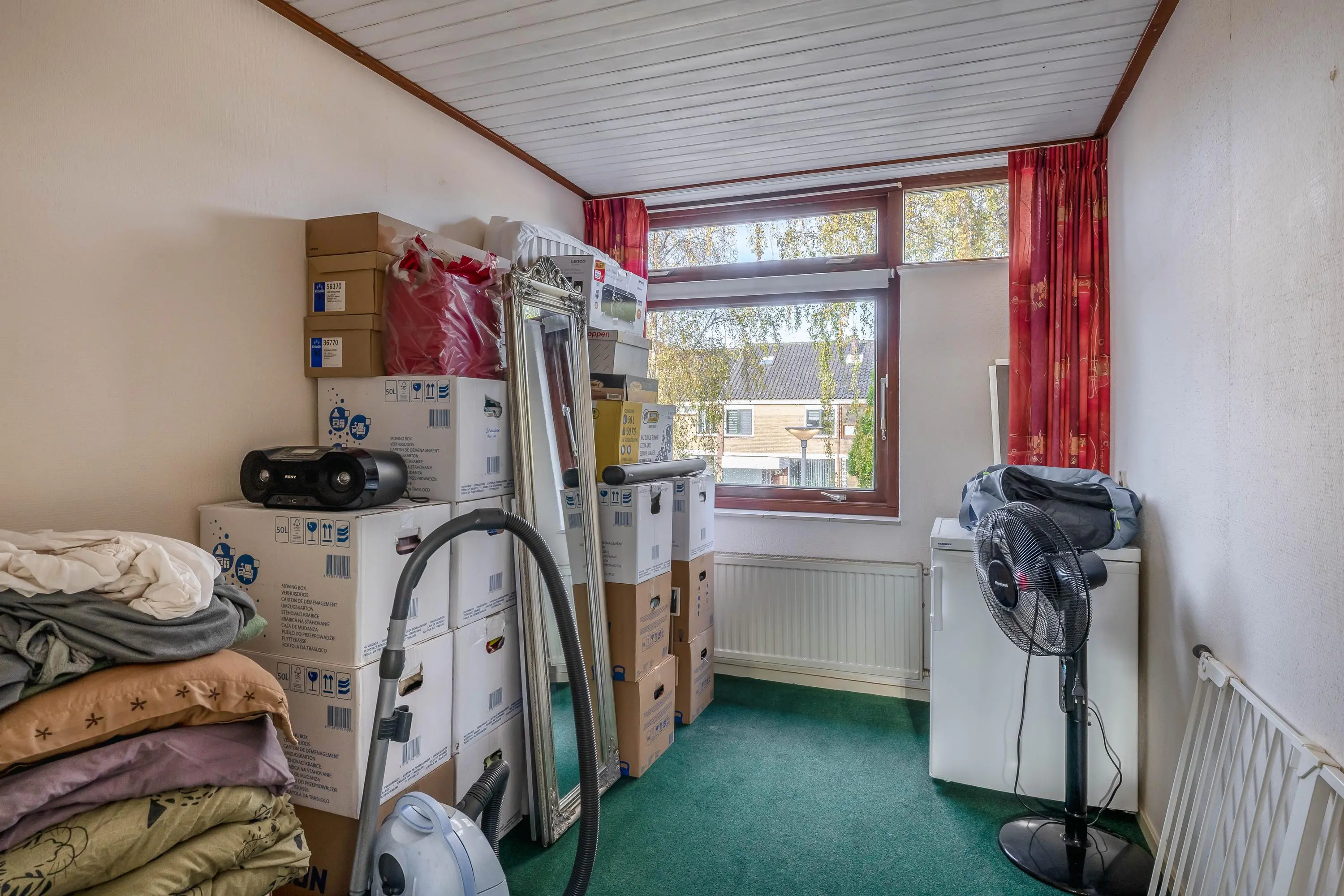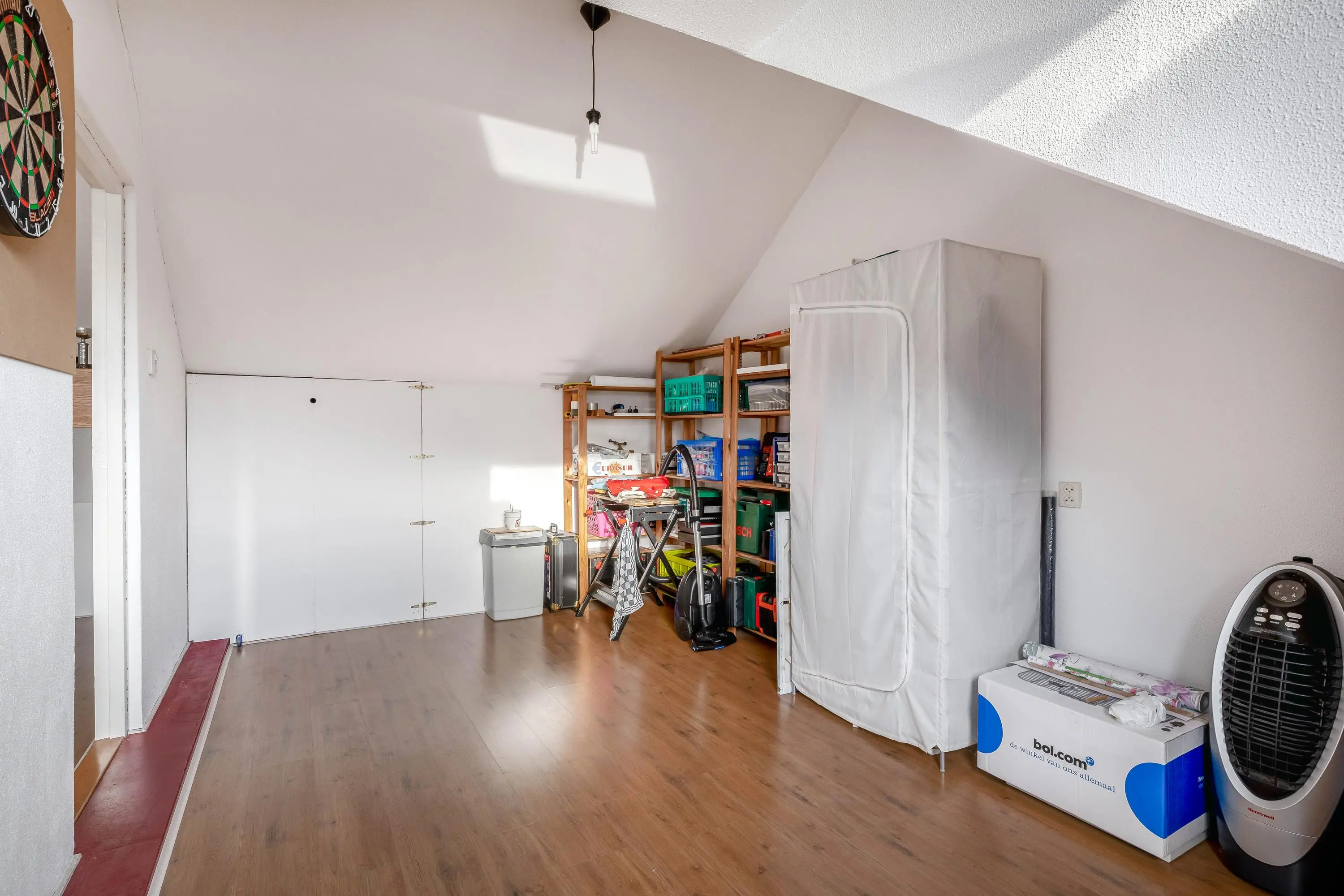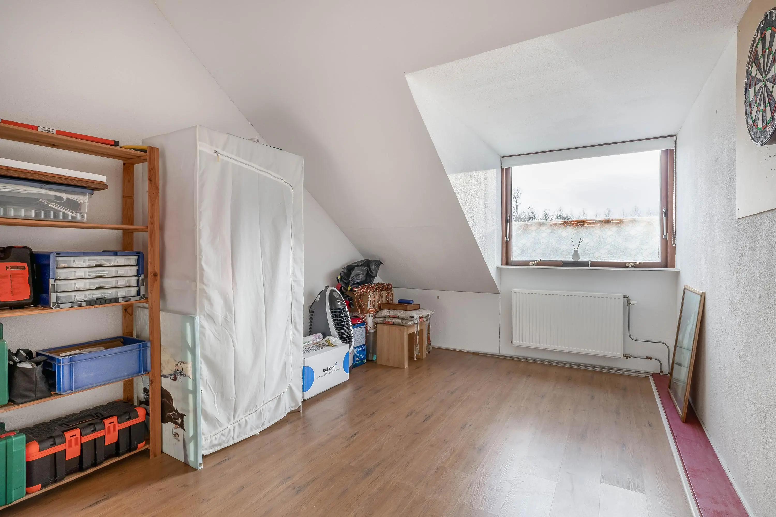 De vierde slaapkamer is vergroot dankzij een dakkapel en beschikt over een oppervlakte van circa 12m². Ook hier is extra bergruimte aanwezig, netjes weggewerkt achter een knieschot in de muur.