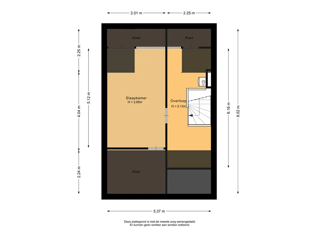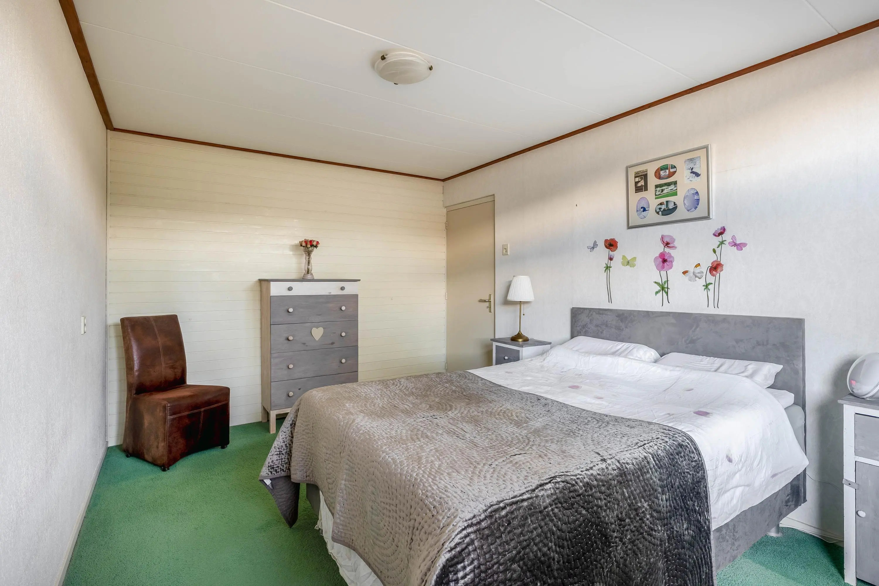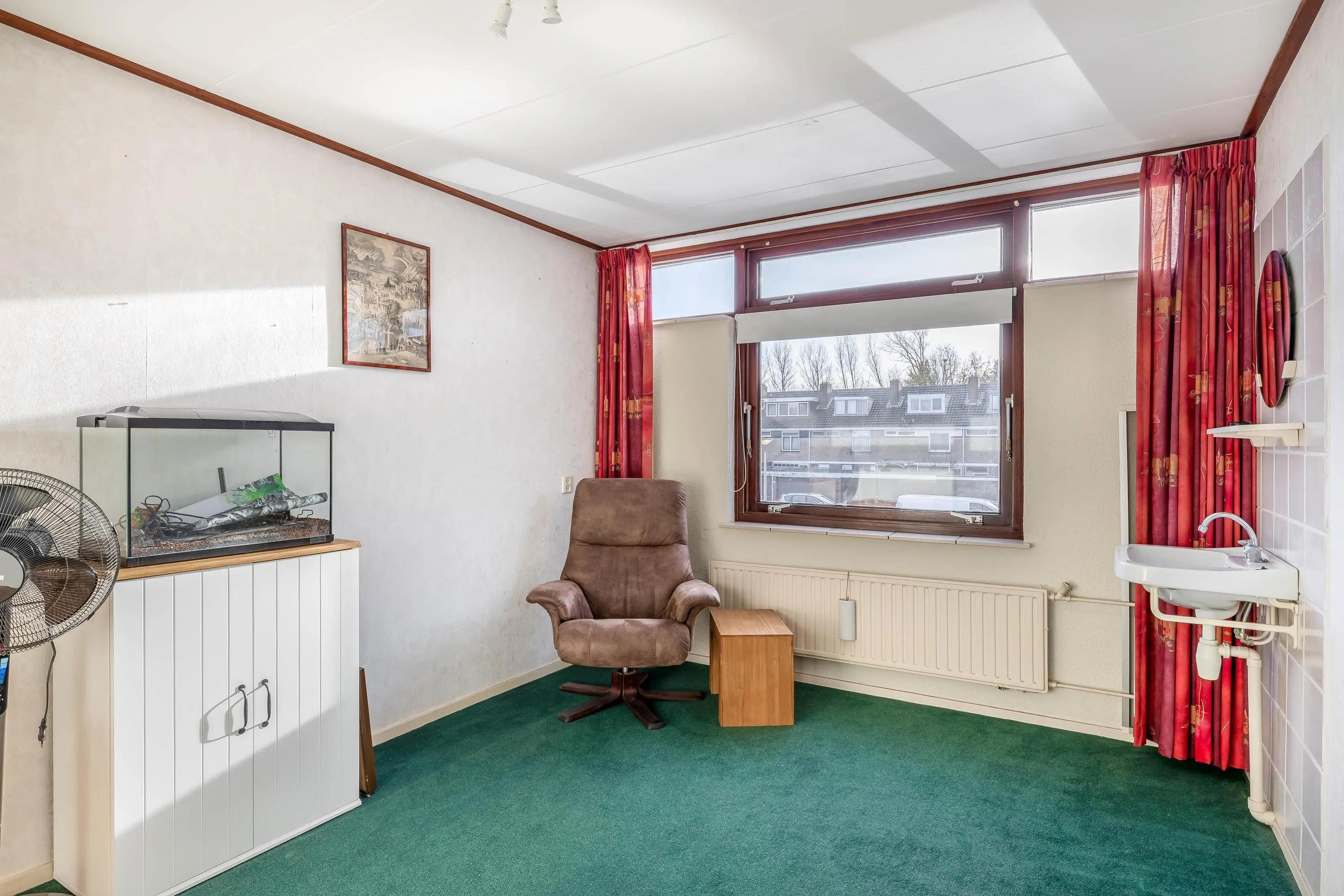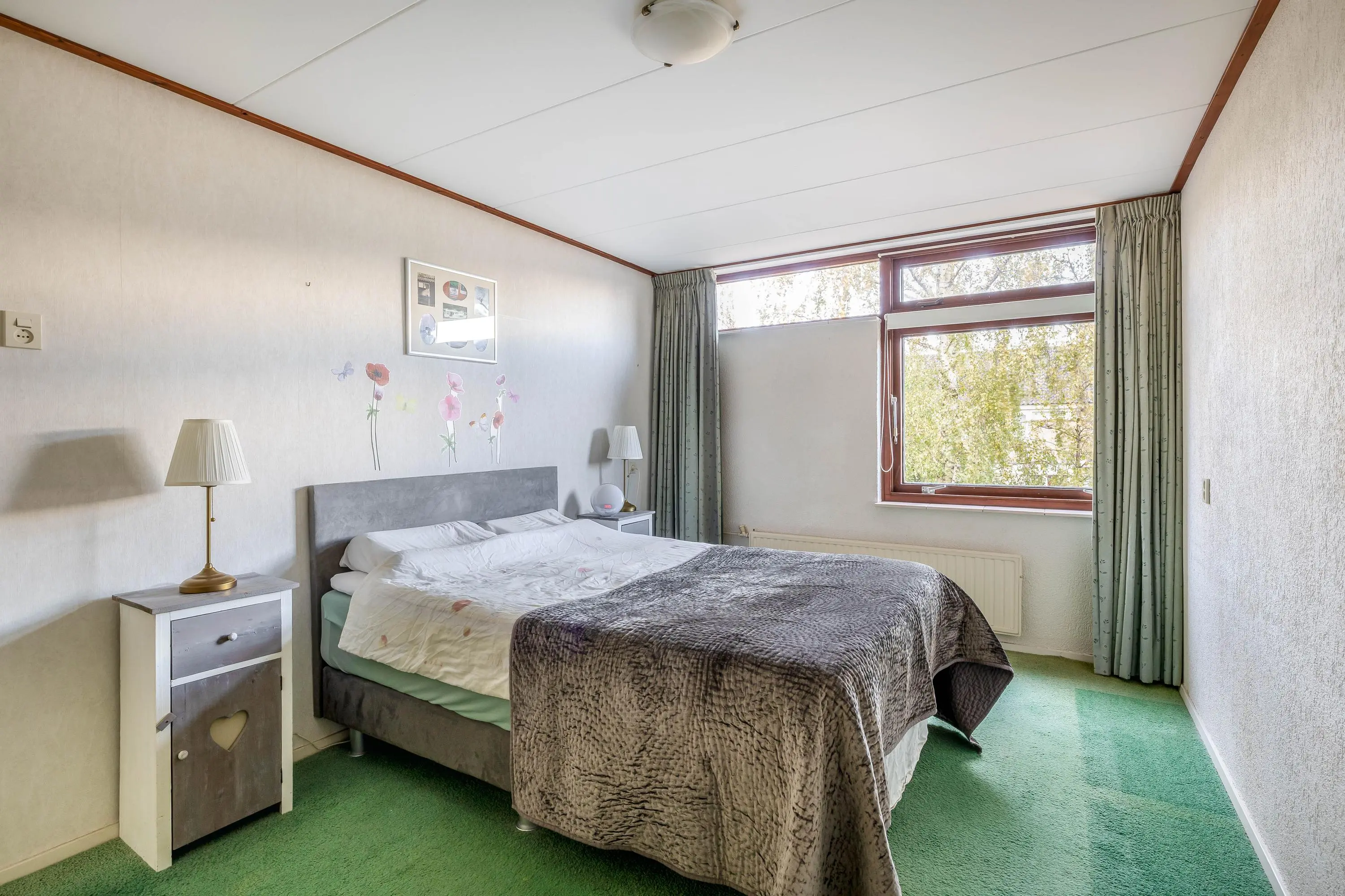 De vierde slaapkamer is vergroot dankzij een dakkapel en beschikt over een oppervlakte van circa 12m². Ook hier is extra bergruimte aanwezig, netjes weggewerkt achter een knieschot in de muur.