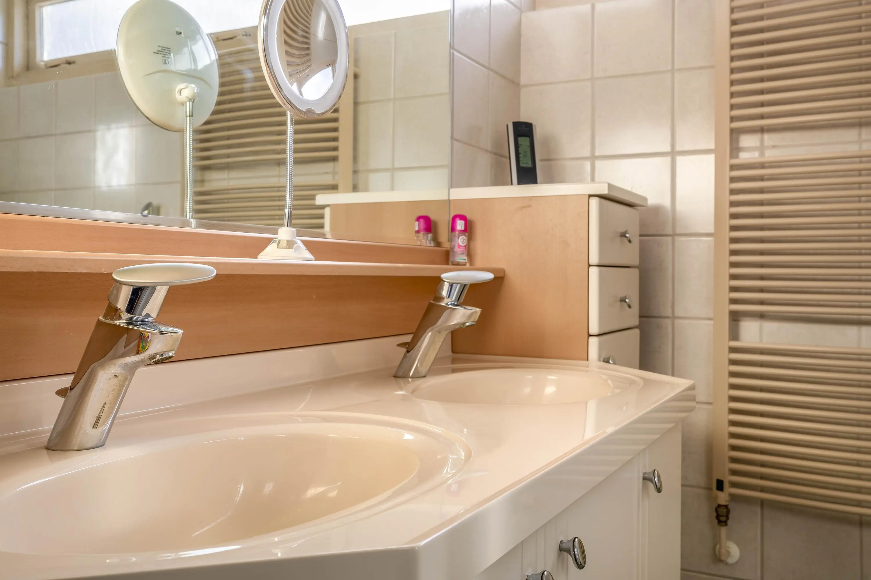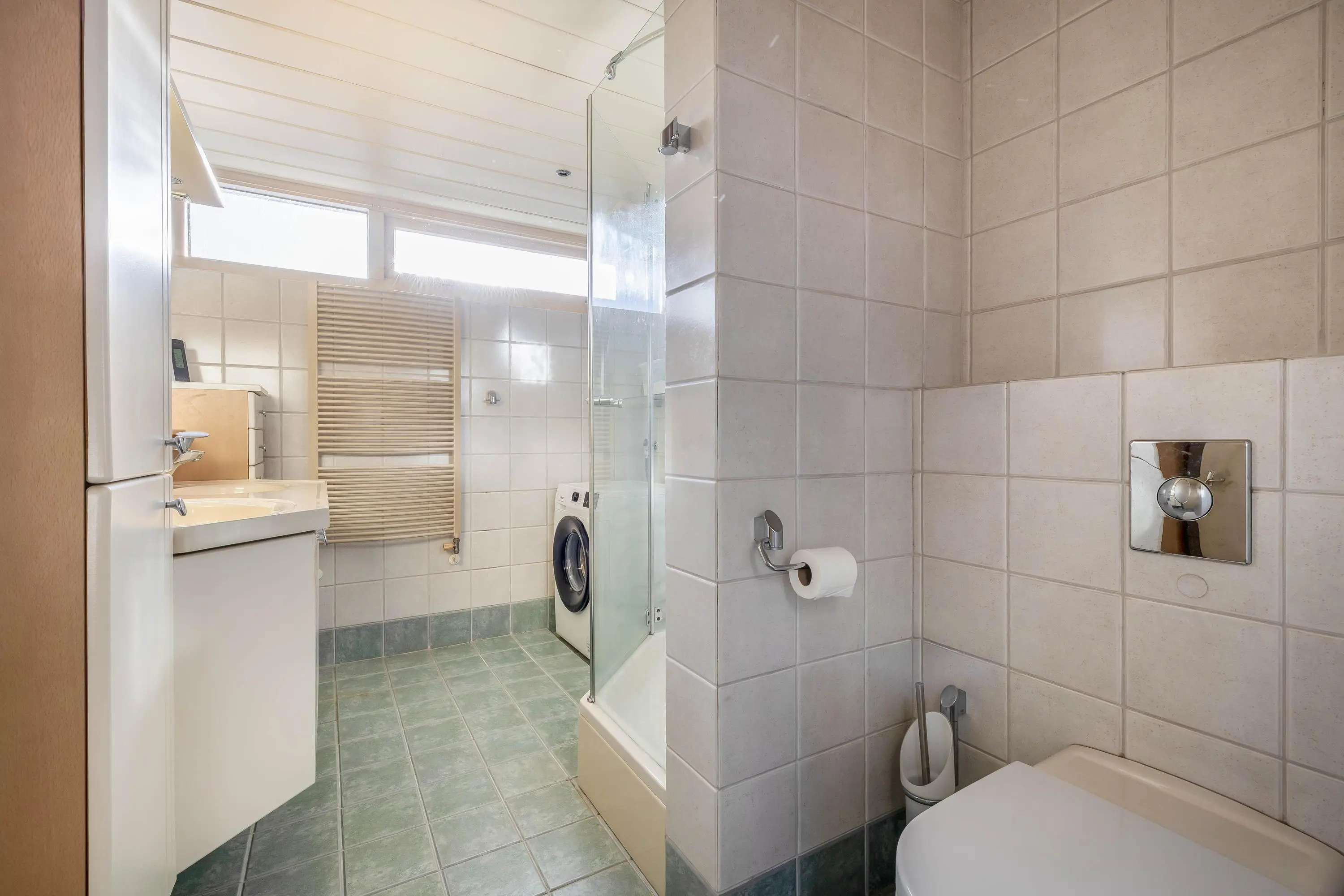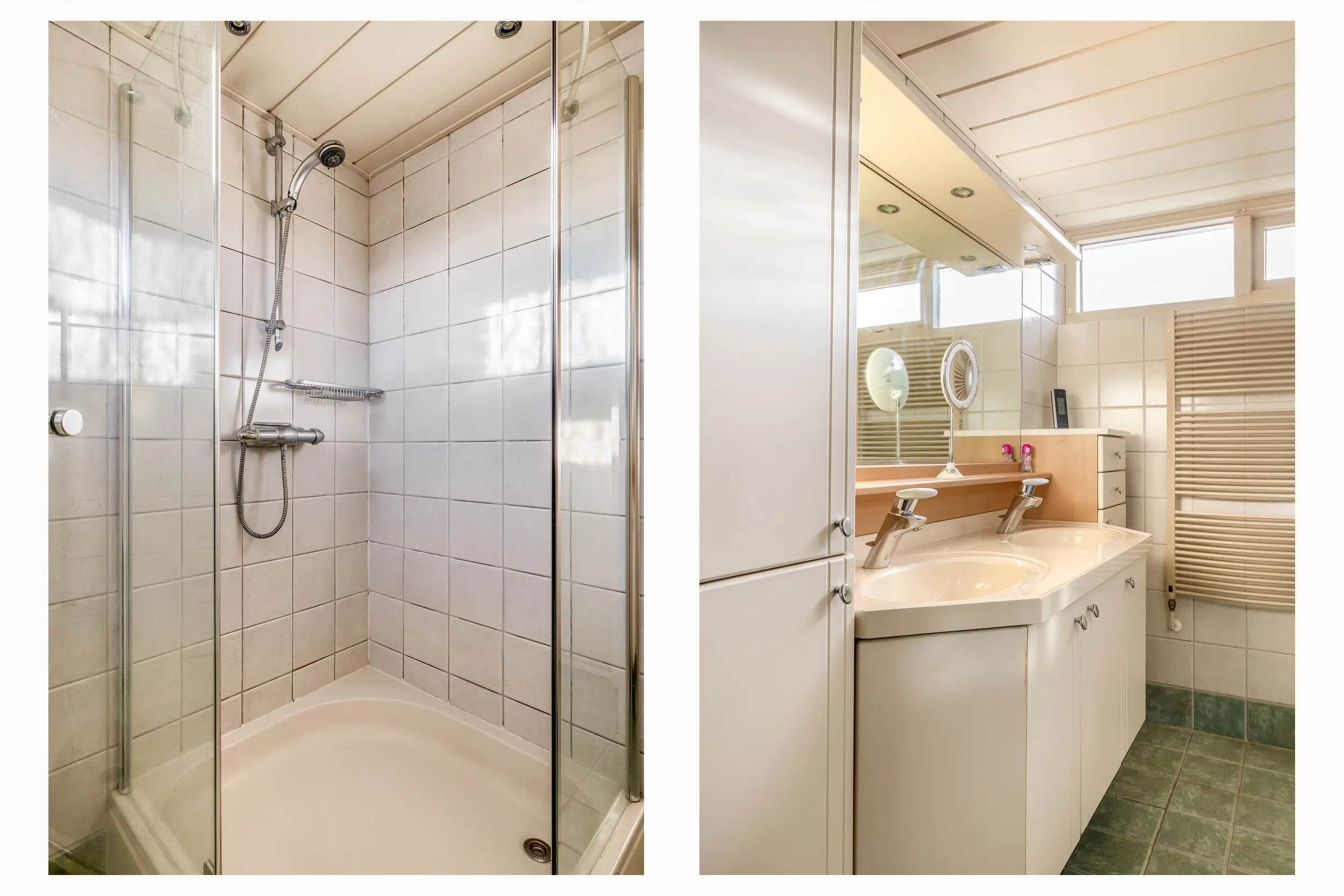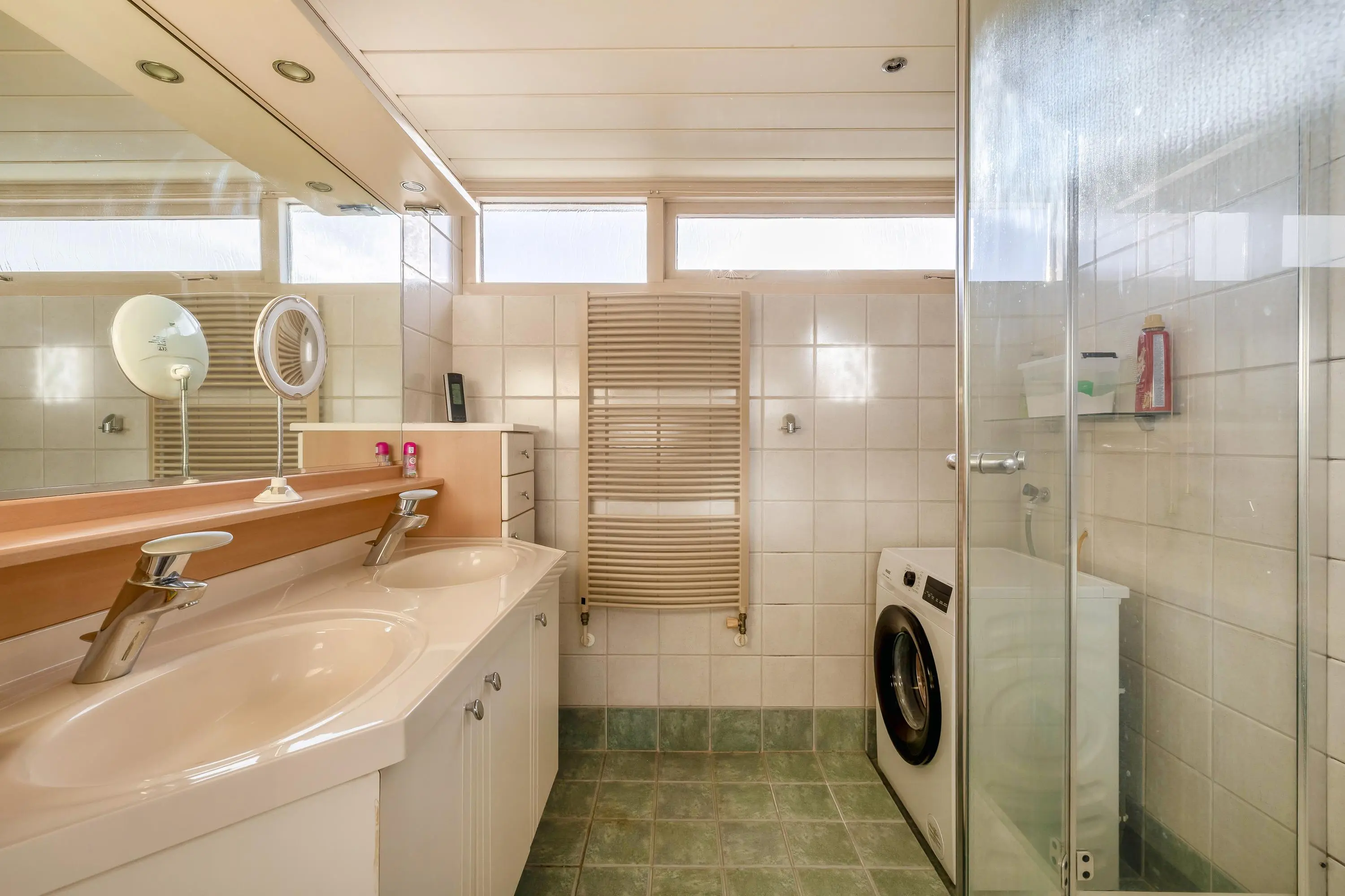 De volledig betegelde badkamer is praktisch ingedeeld en voorzien van een douche, toilet, dubbel wastafelmeubel en designradiator. Daarnaast vindt u hier de aansluiting voor wasmachine en droger en is de vloer uitgerust met comfortabele vloerverwarming.