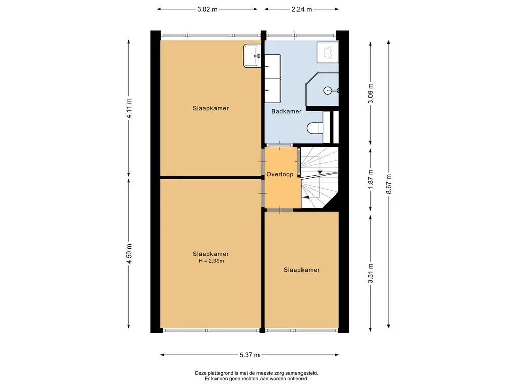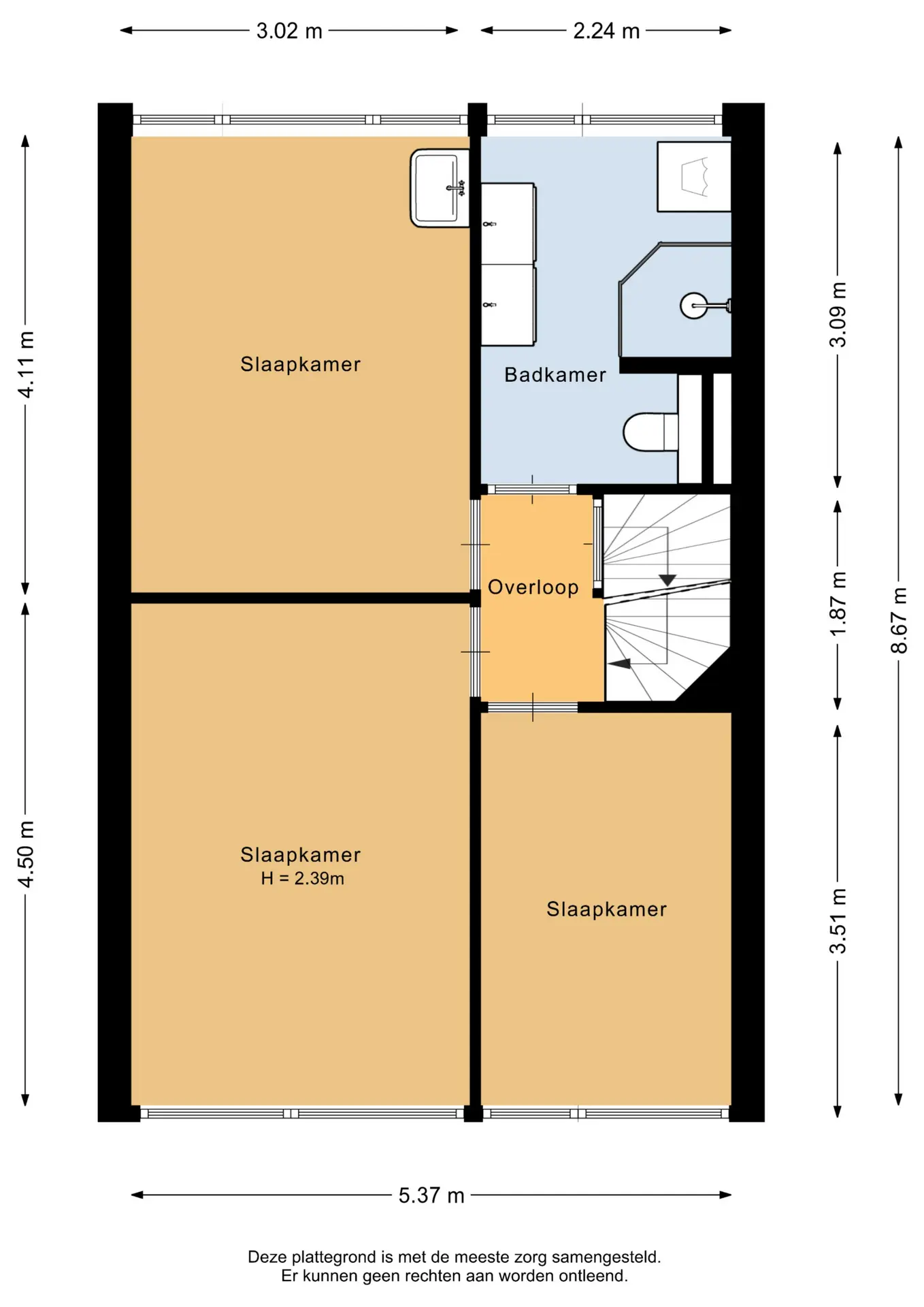 De hoofdslaapkamer bevindt zich aan de voorzijde en heeft een ruime oppervlakte van circa 13,5m². Aan de achterzijde ligt de tweede slaapkamer van ongeveer 12,5m², uitgerust met een praktische wastafel. De derde slaapkamer bevindt zich eveneens aan de voorzijde en biedt met circa 8m² een fijne ruimte voor bijvoorbeeld een werk- of kinderkamer.