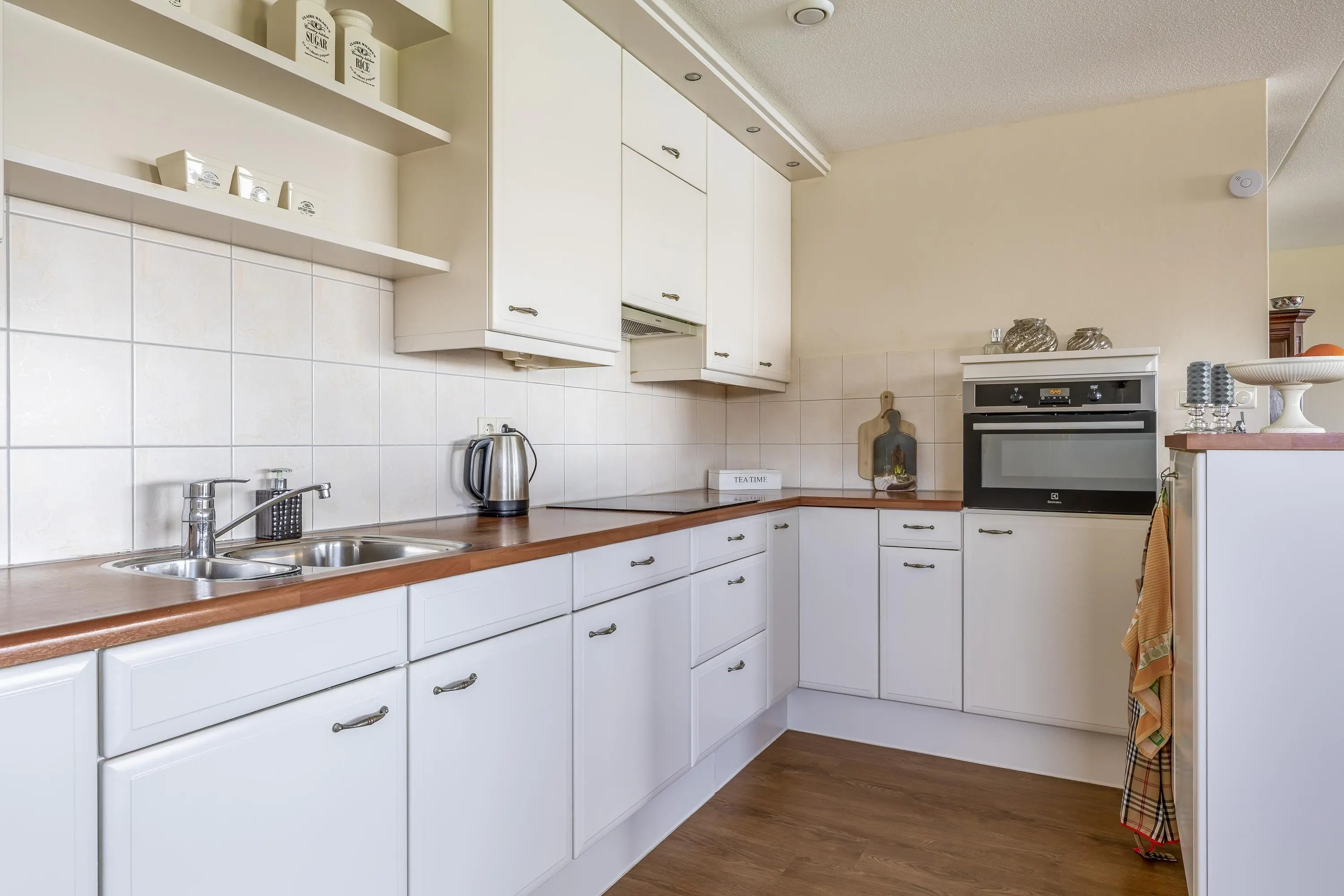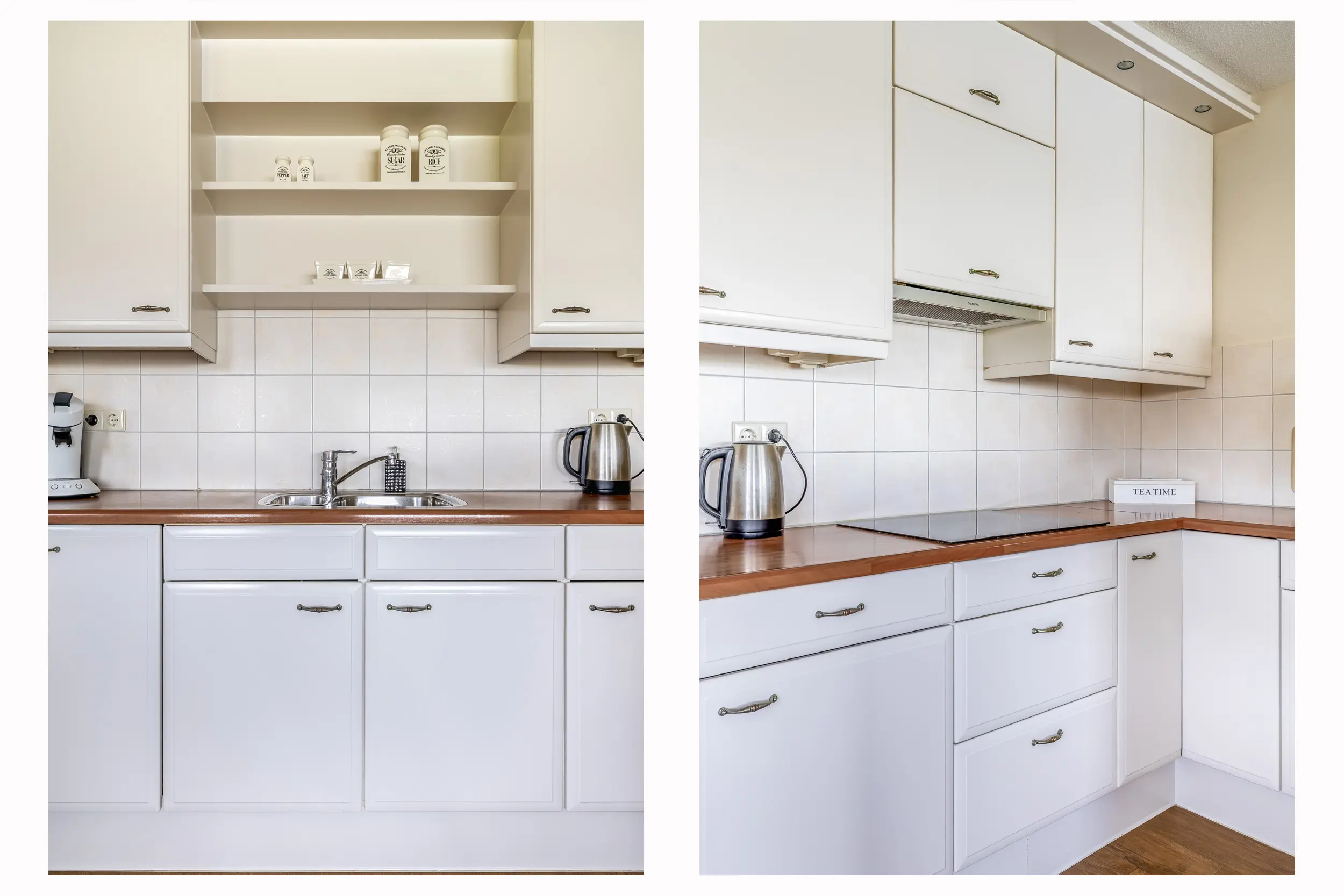 Aan de woonkamer grenst de open keuken, uitgevoerd in een praktische opstelling en voorzien van een koel-/vriescombinatie, inductiekookplaat en combi oven/magnetron.
