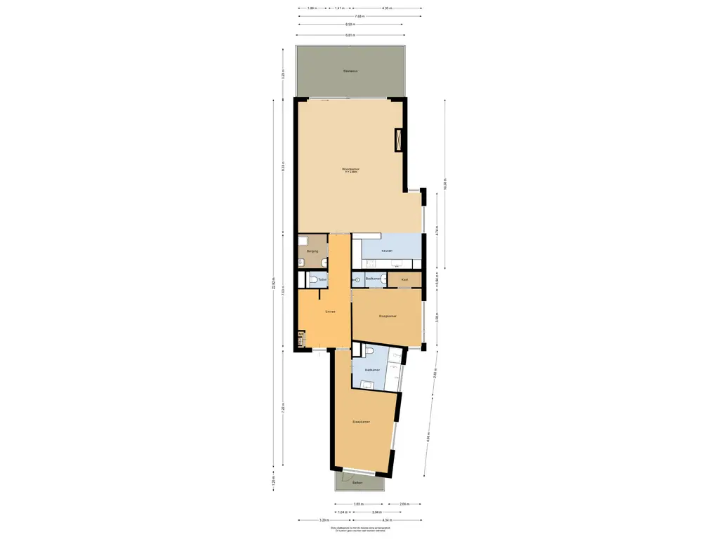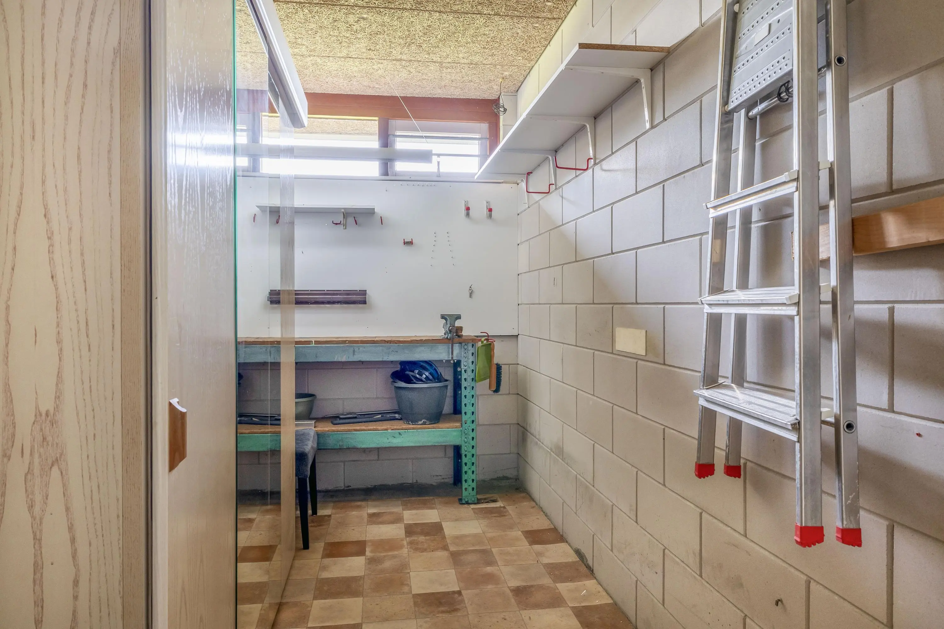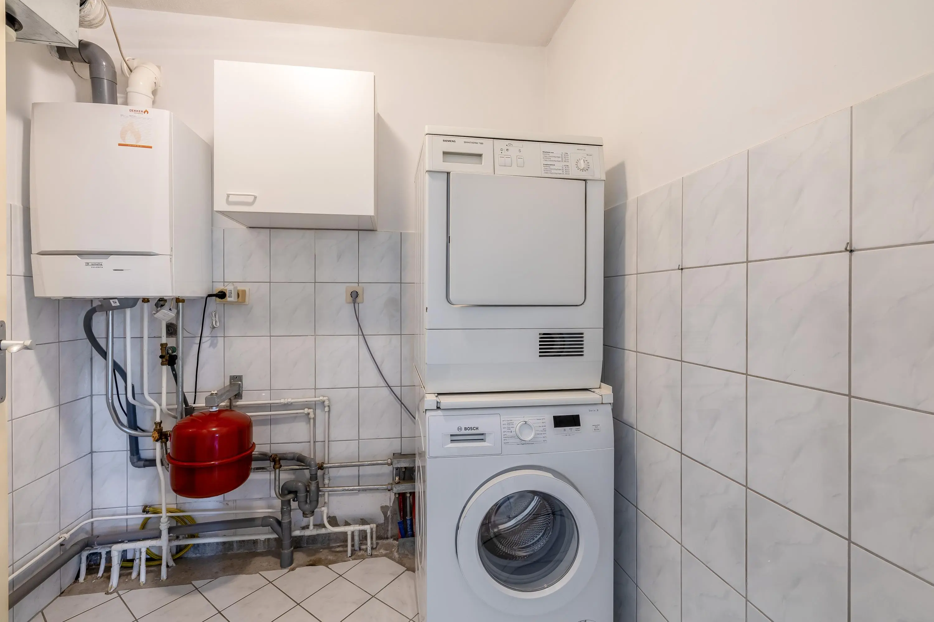 Daarnaast bereikt u vanuit de hal de inpandige bijkeuken, waar zich de aansluitingen voor wasmachine en droger bevinden, evenals de opstelling van de cv-ketel.