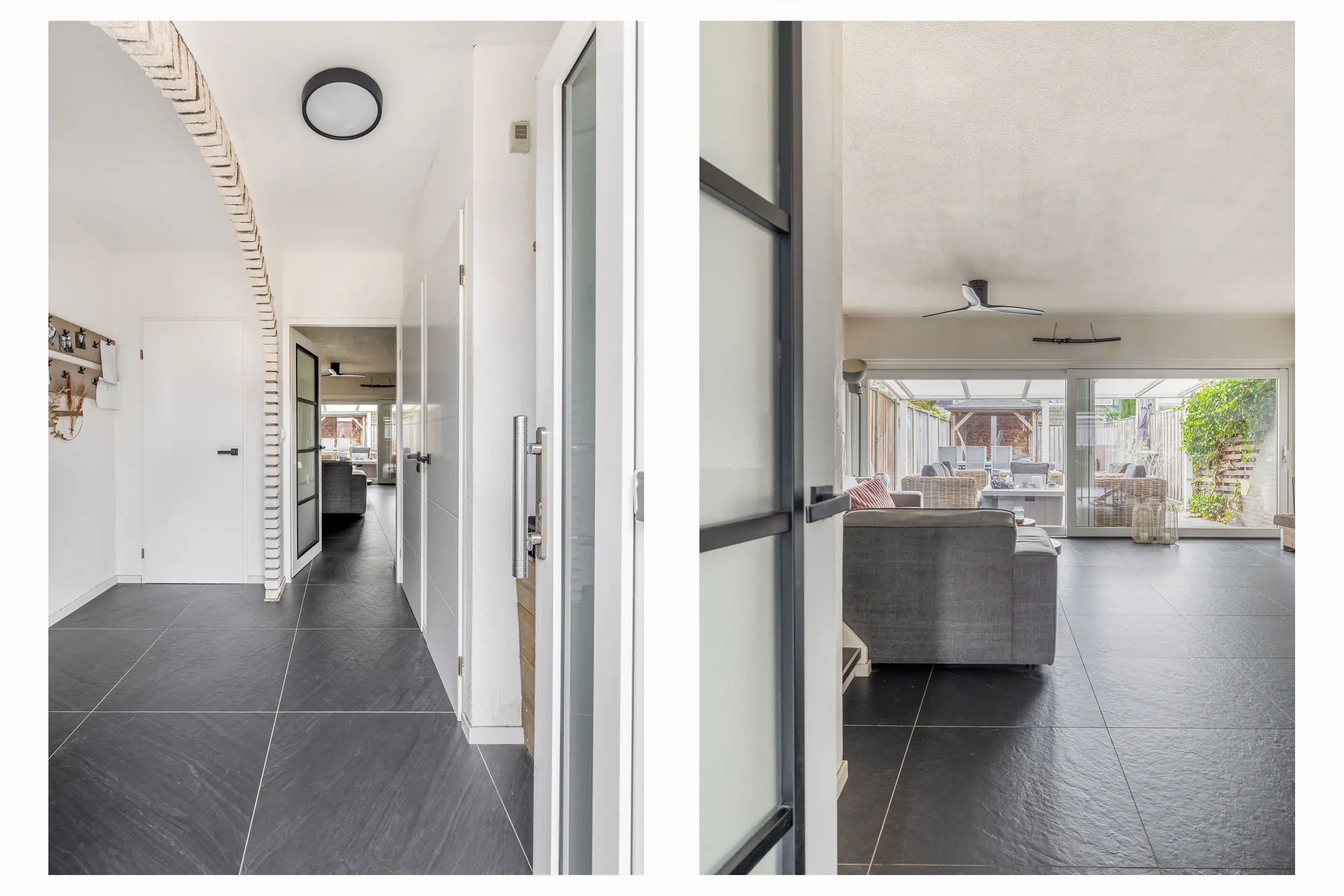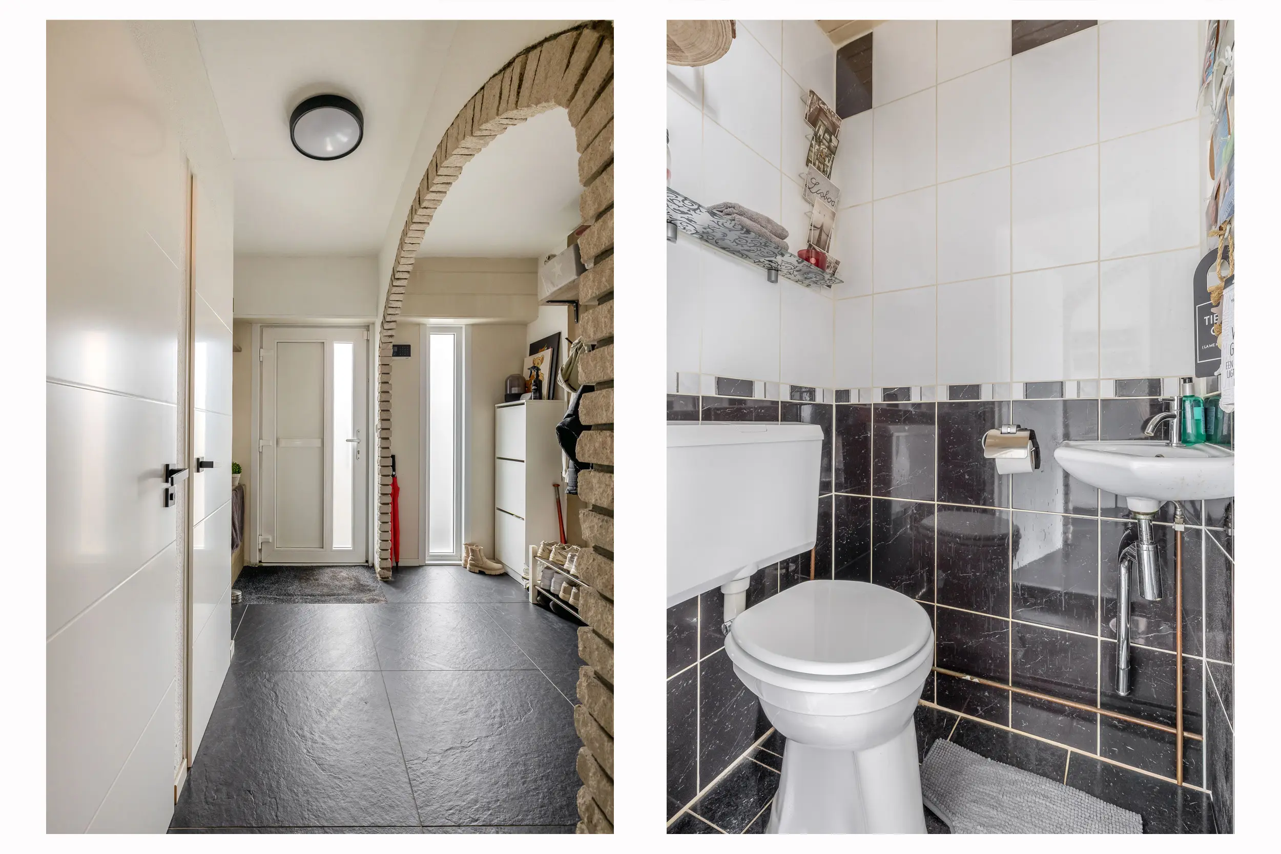 De entree/hal is afgewerkt met een nette plavuizenvloer voorzien van vloerverwarming, welke doorloopt over de gehele begane grond. In de hal bevinden zich de meterkast en een separaat toilet. De hal wordt op sfeervolle wijze gescheiden door een stenen boog, waaronder zich een praktische trapkast bevindt.