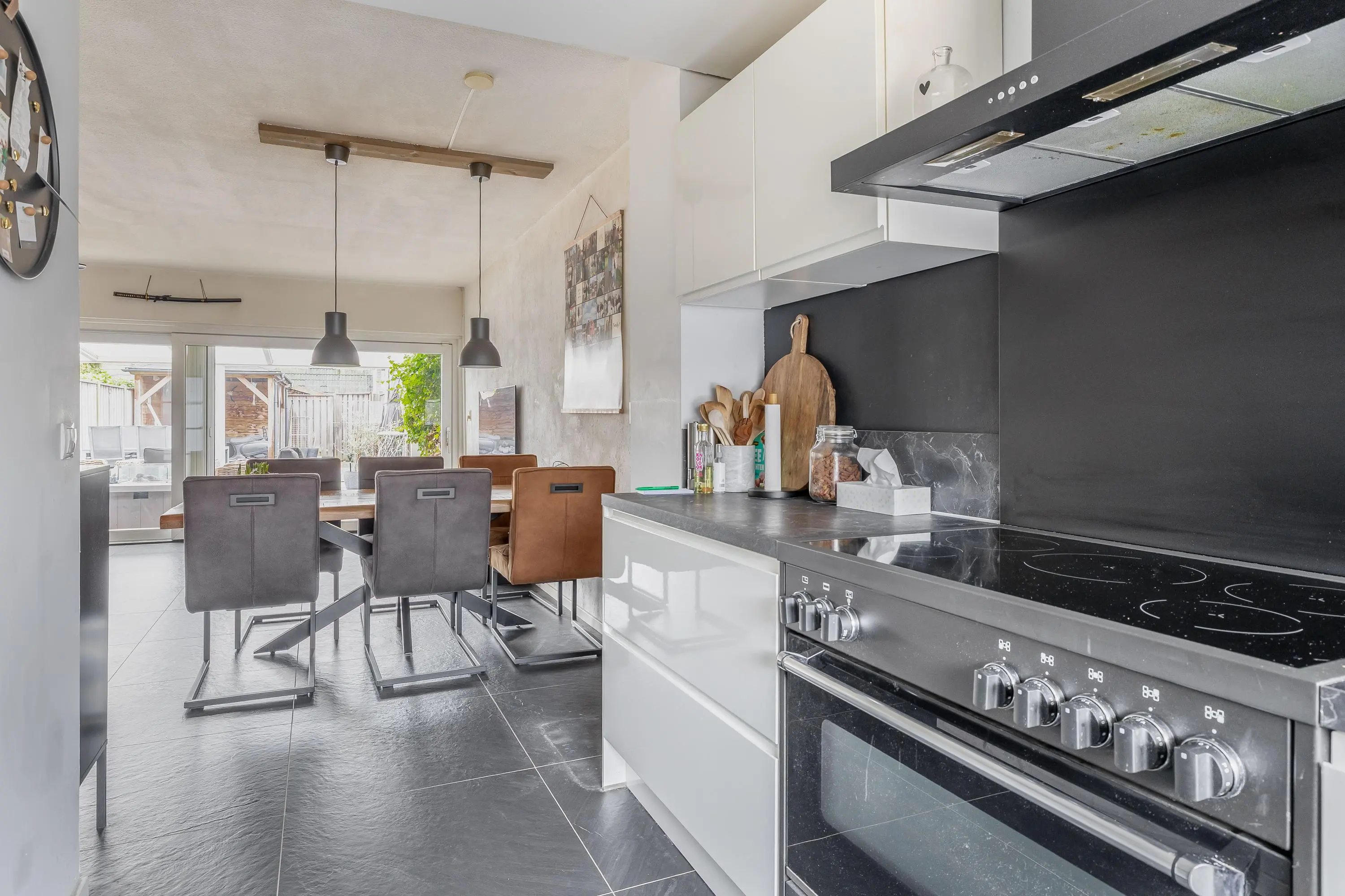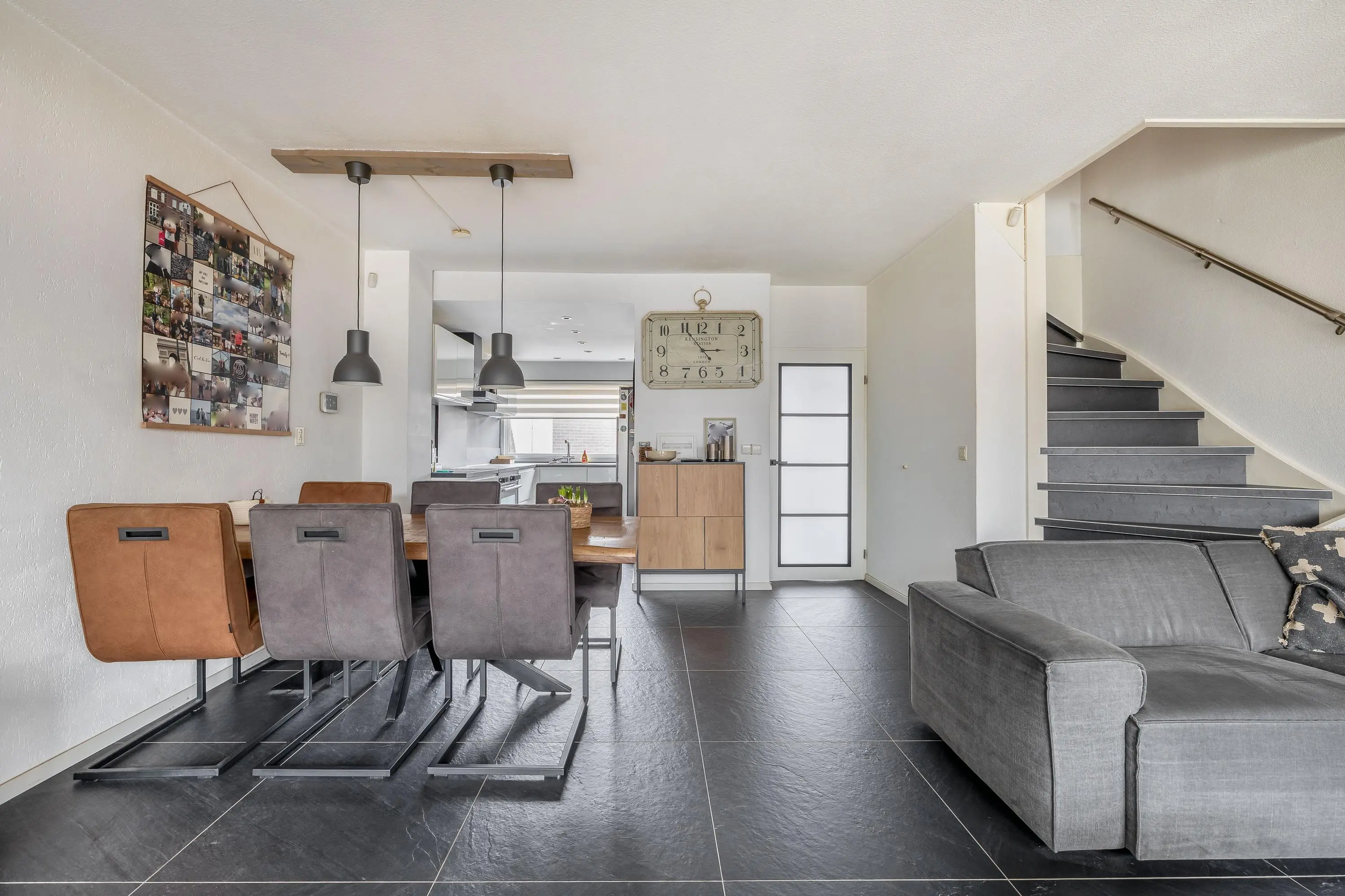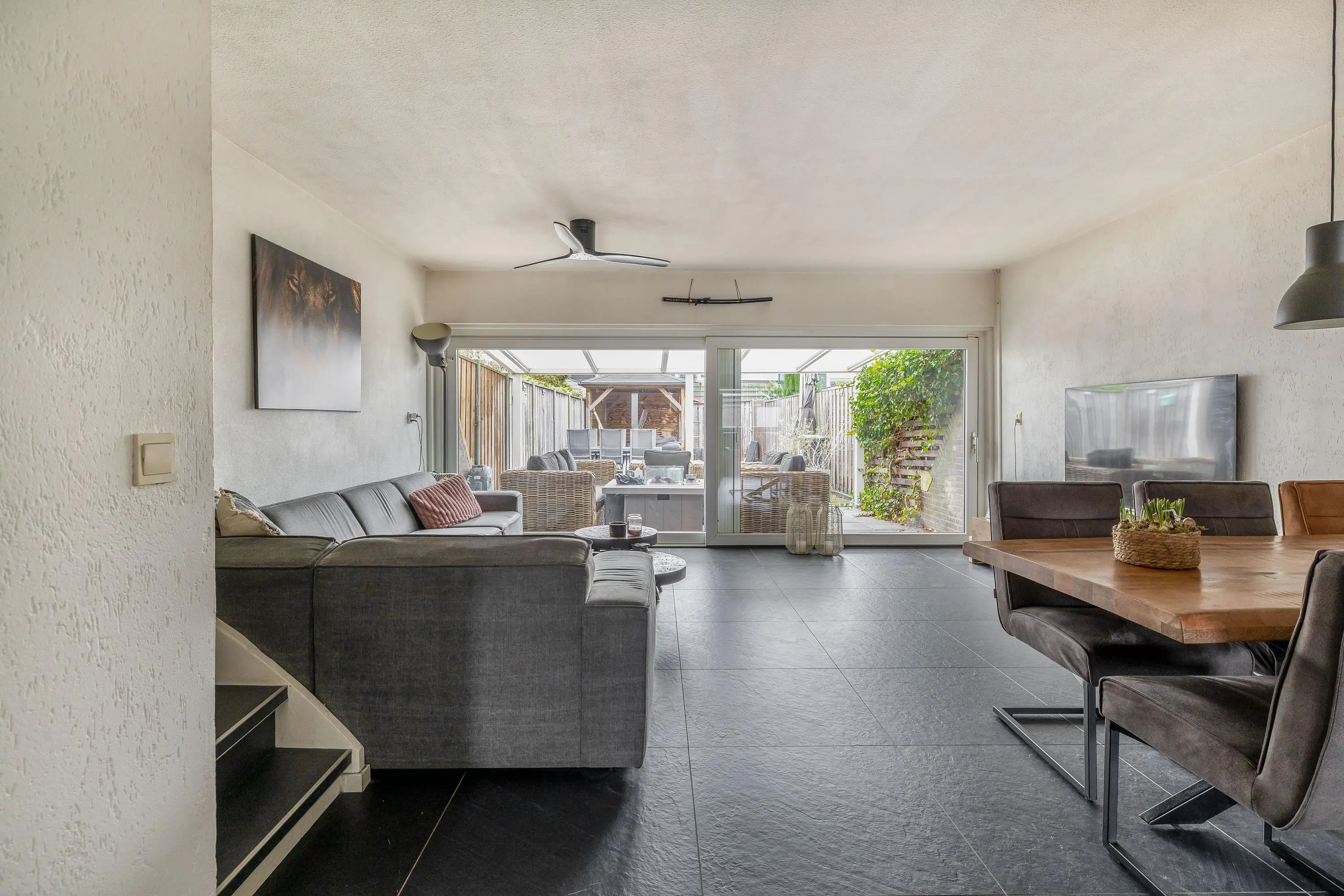 De royale leefruimte is ruim opgezet en geniet dankzij de grote schuifpui van veel natuurlijke lichtinval. De woonkamer biedt volop ruimte voor een comfortabele zithoek en staat in directe verbinding met de achtertuin via de schuifpui. Daarnaast is er voldoende plaats voor een aparte eethoek. In de woonkamer bevindt zich tevens de trapopgang naar de eerste verdieping.