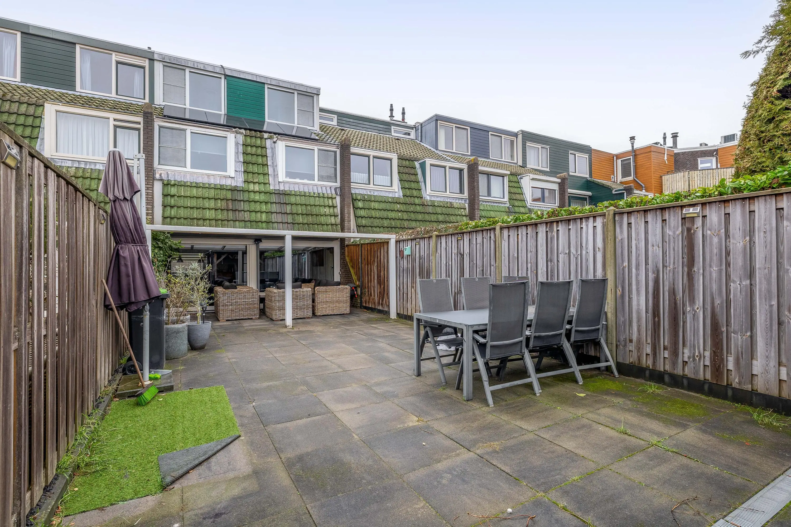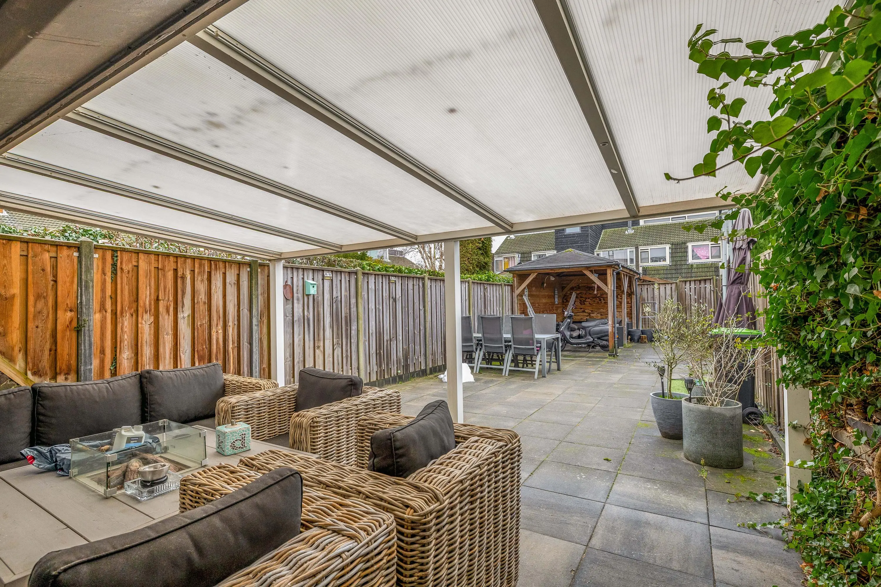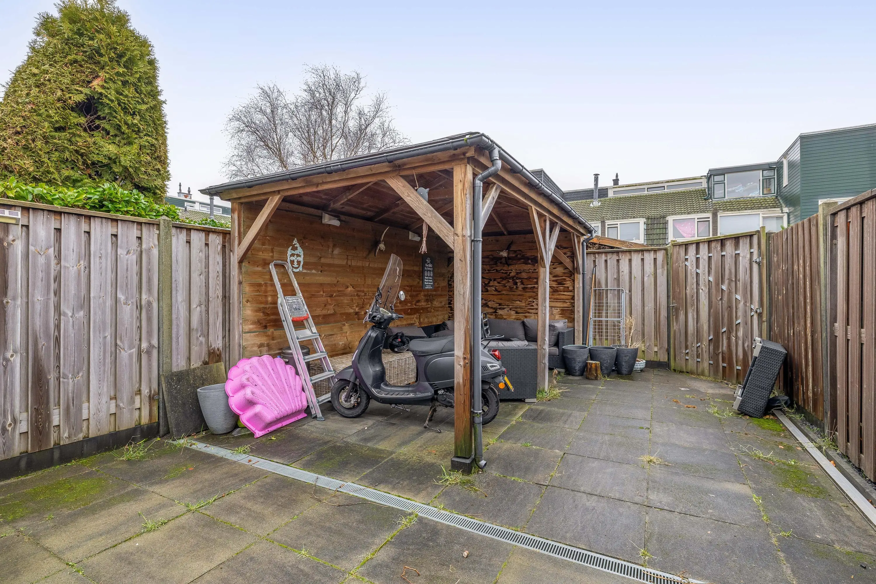 De royale, op het zuiden gelegen achtertuin is volledig betegeld en beschikt over een fraaie aangebouwde overkapping, ideaal voor een loungehoek of een eettafel om buiten te dineren. Achter in de tuin bevindt zich een tweede overkapping, waardoor er ook hier een gezellige zit- of eetplek gecreëerd kan worden. De tuin is bereikbaar via een praktische achterom.