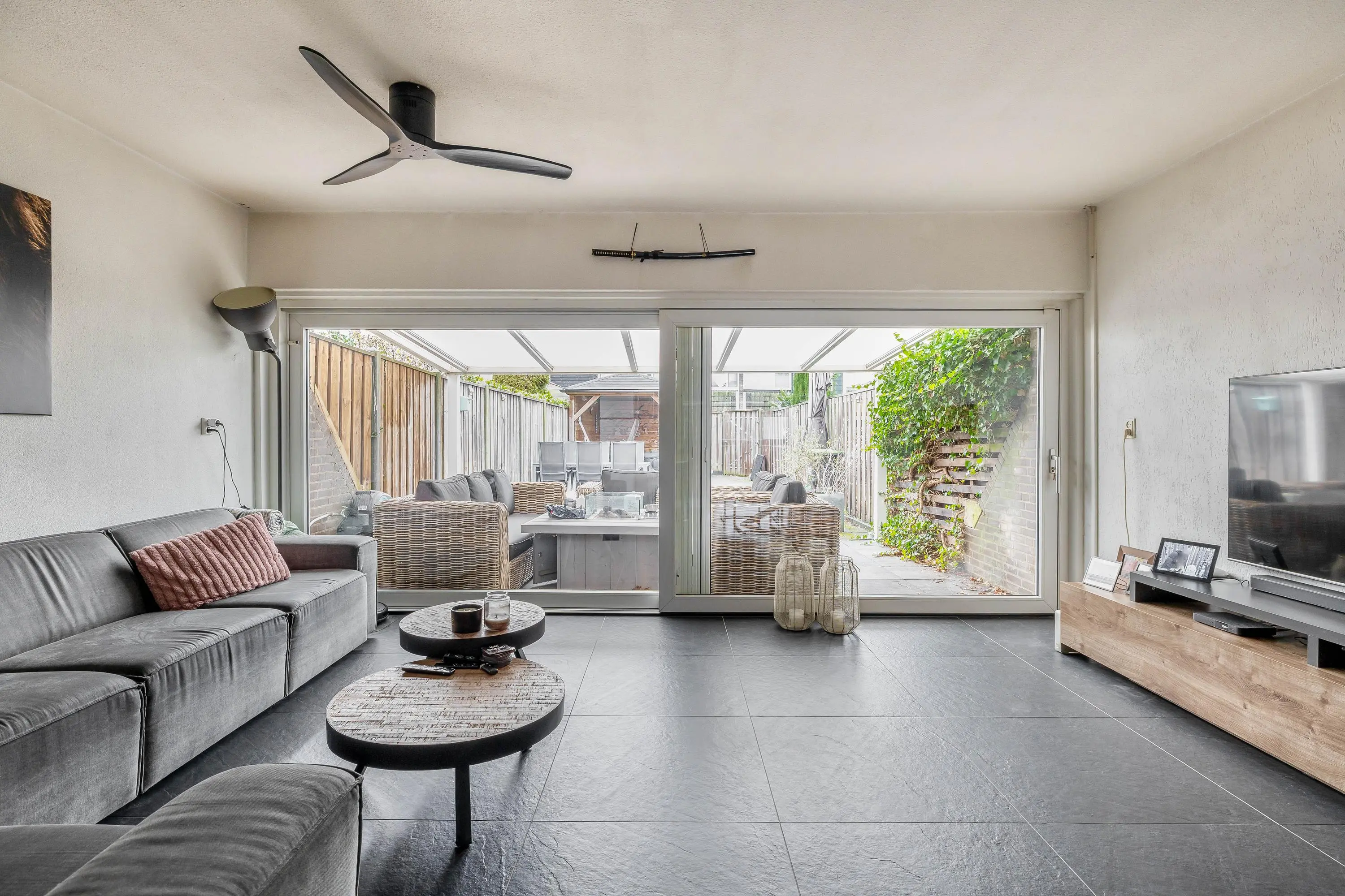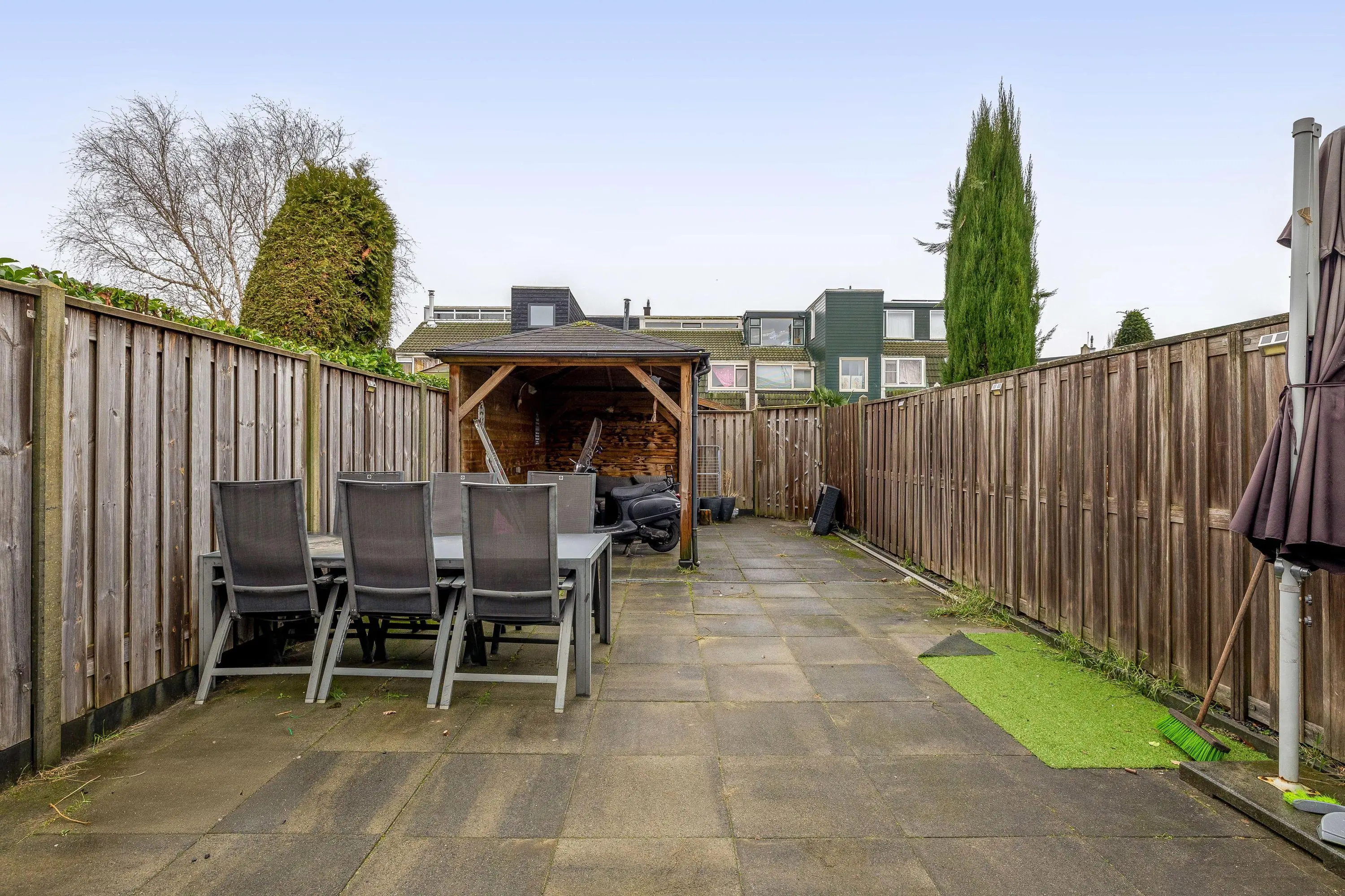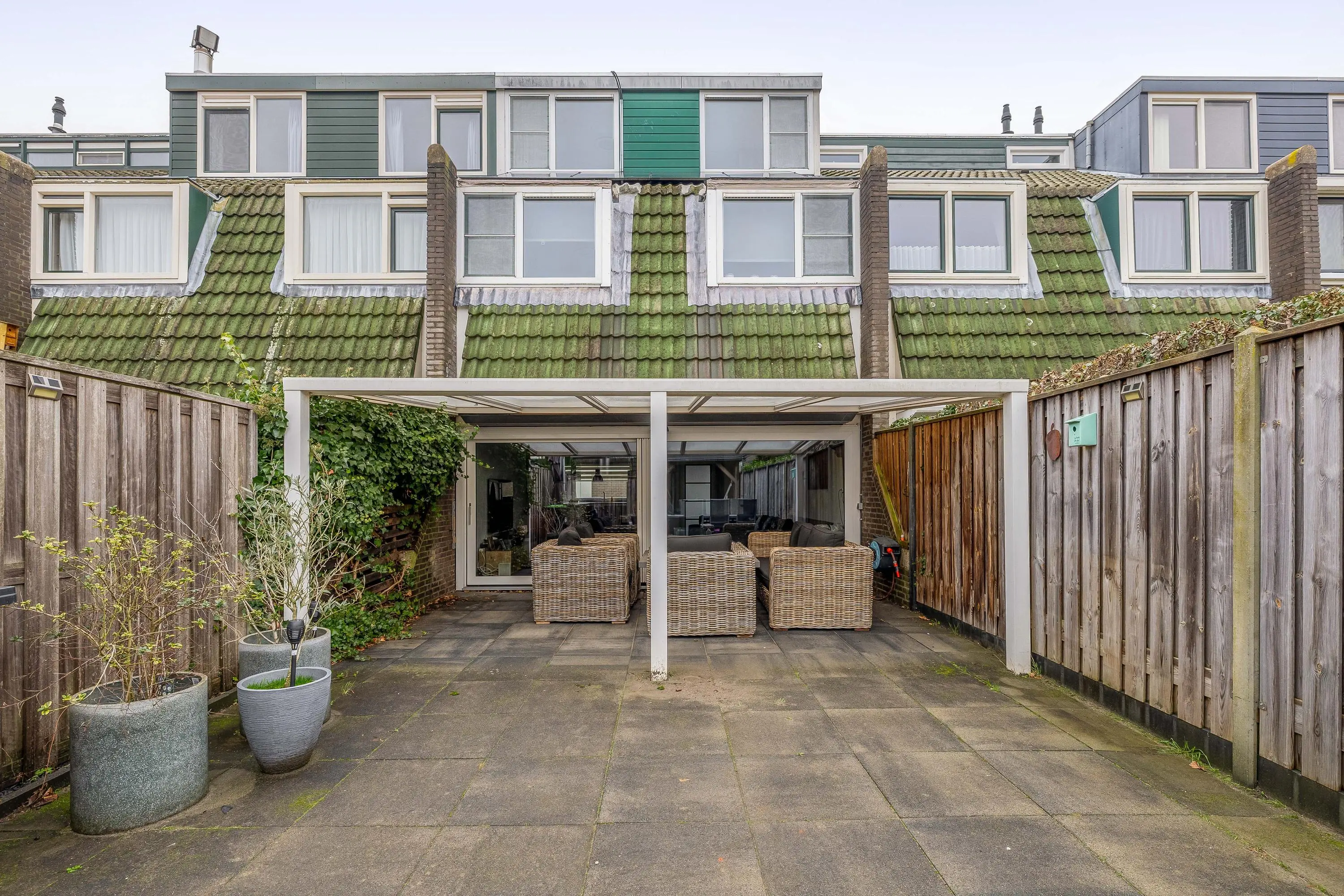 De royale, op het zuiden gelegen achtertuin is volledig betegeld en beschikt over een fraaie aangebouwde overkapping, ideaal voor een loungehoek of een eettafel om buiten te dineren. Achter in de tuin bevindt zich een tweede overkapping, waardoor er ook hier een gezellige zit- of eetplek gecreëerd kan worden. De tuin is bereikbaar via een praktische achterom.