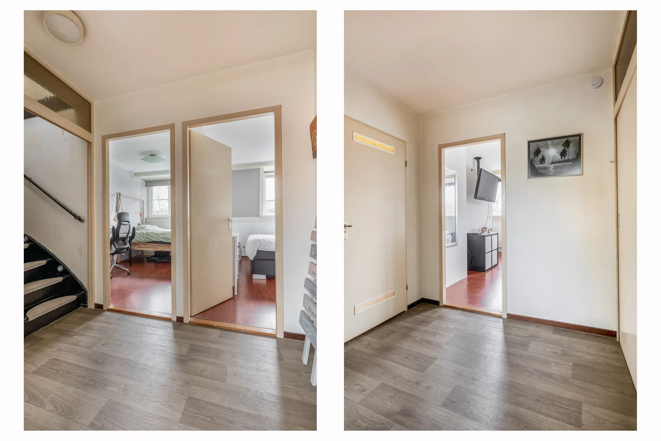 De overloop is afgewerkt met een laminaatvloer en biedt toegang tot drie slaapkamers, de badkamer en de trapopgang naar de tweede verdieping.