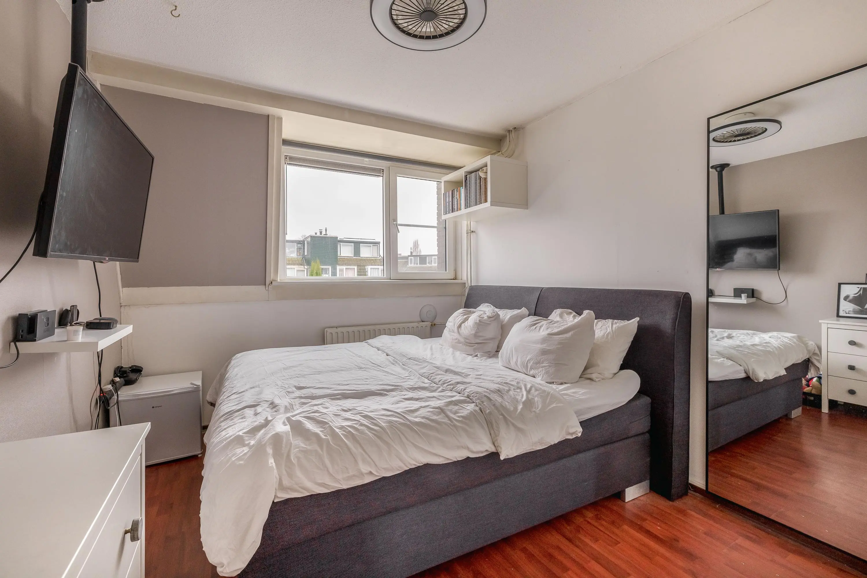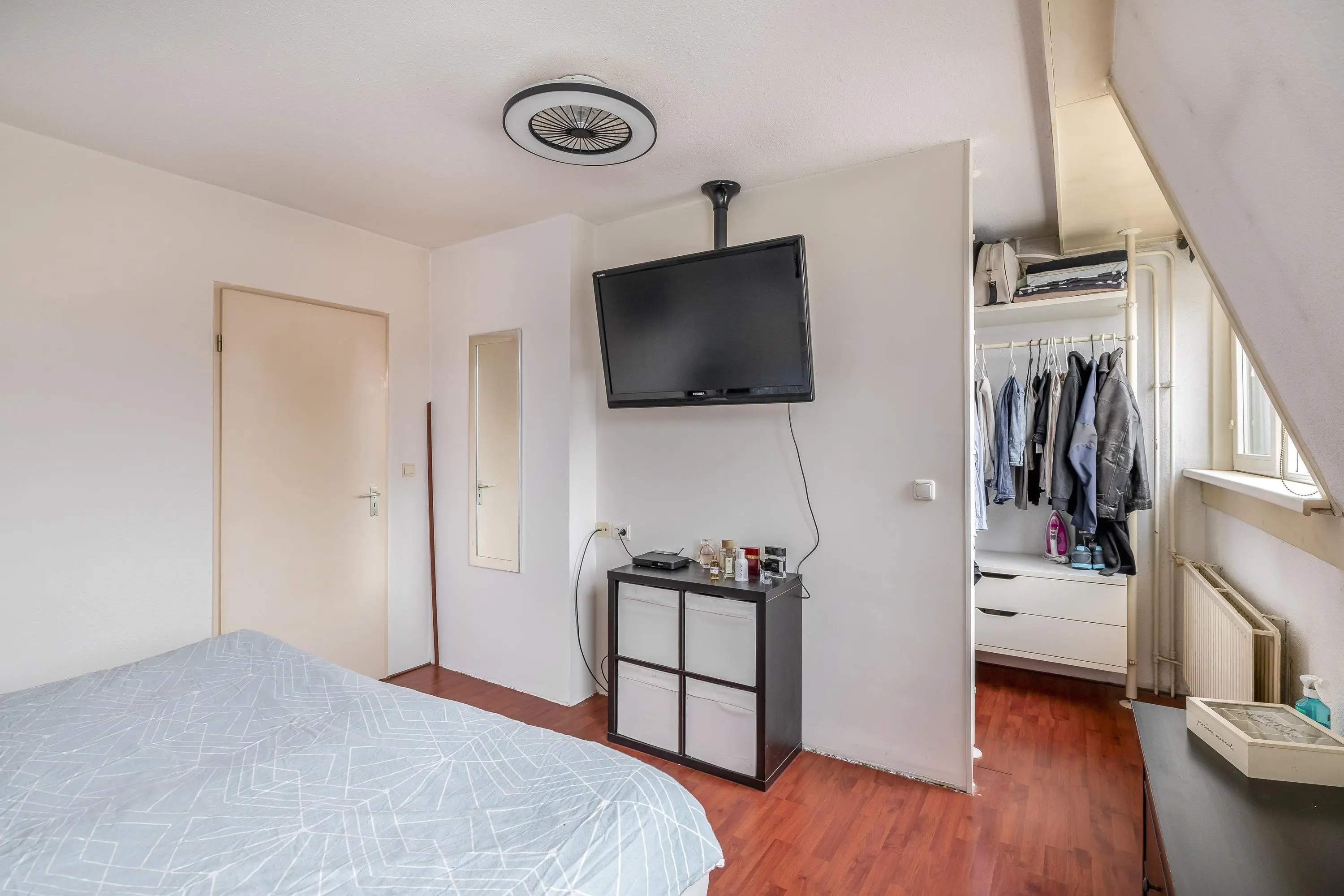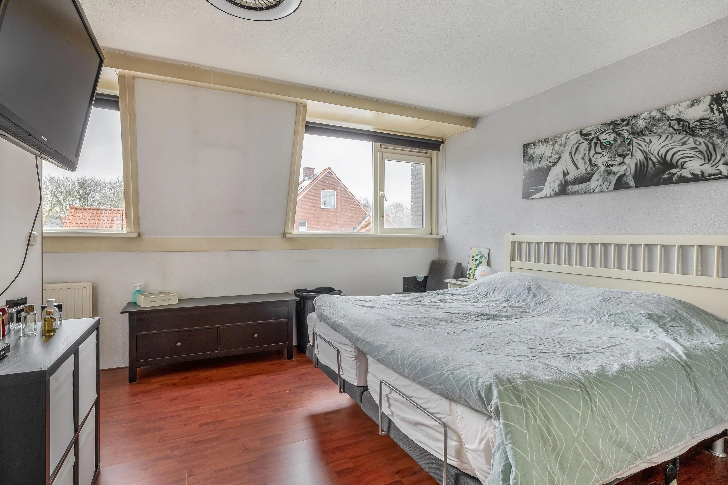 De vierde slaapkamer is afgewerkt met dezelfde laminaatvloer als de overige slaapkamers en profiteert dankzij het dakkapel van prettig daglicht. De kamer heeft een oppervlakte van circa 13m².