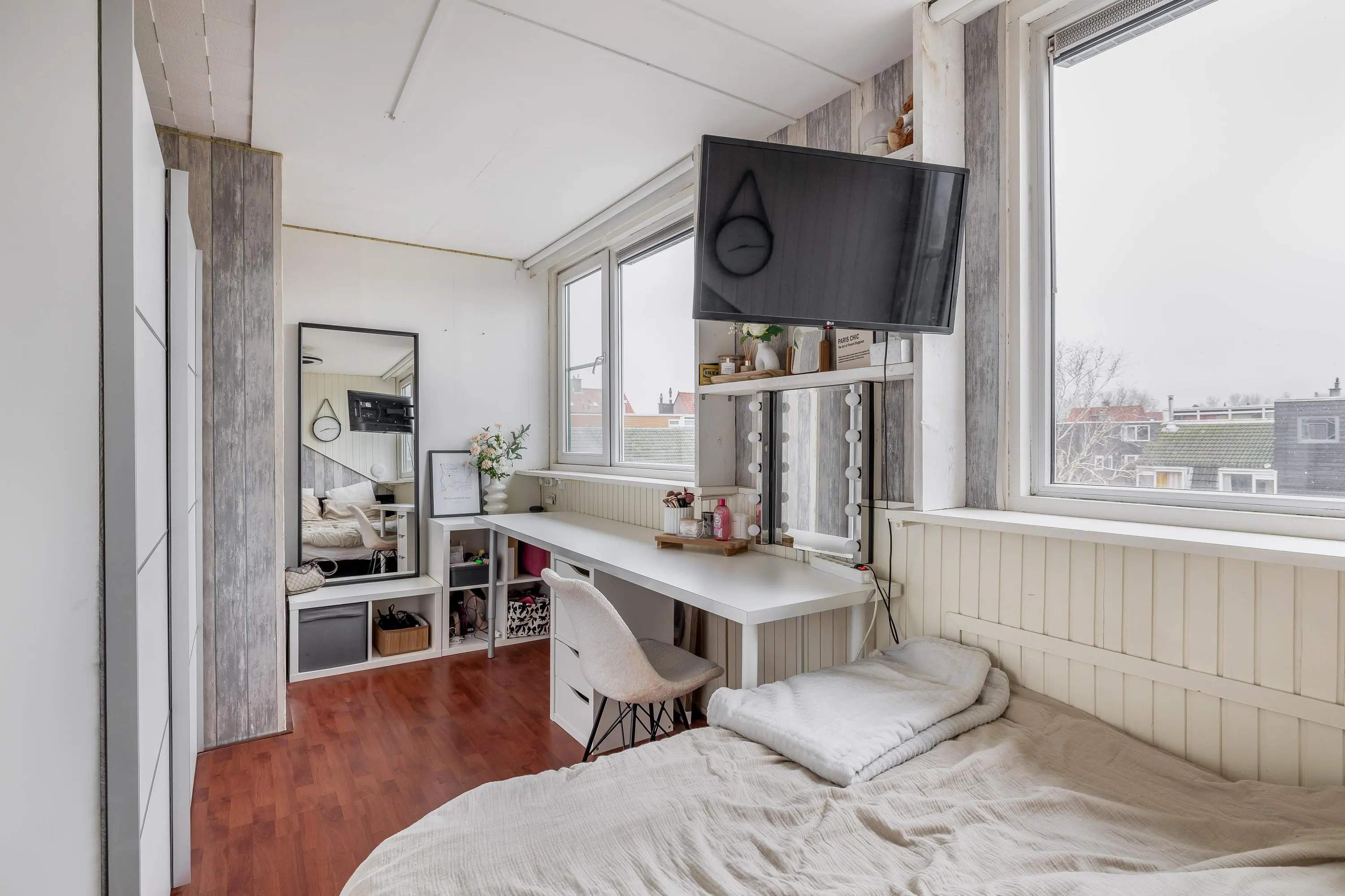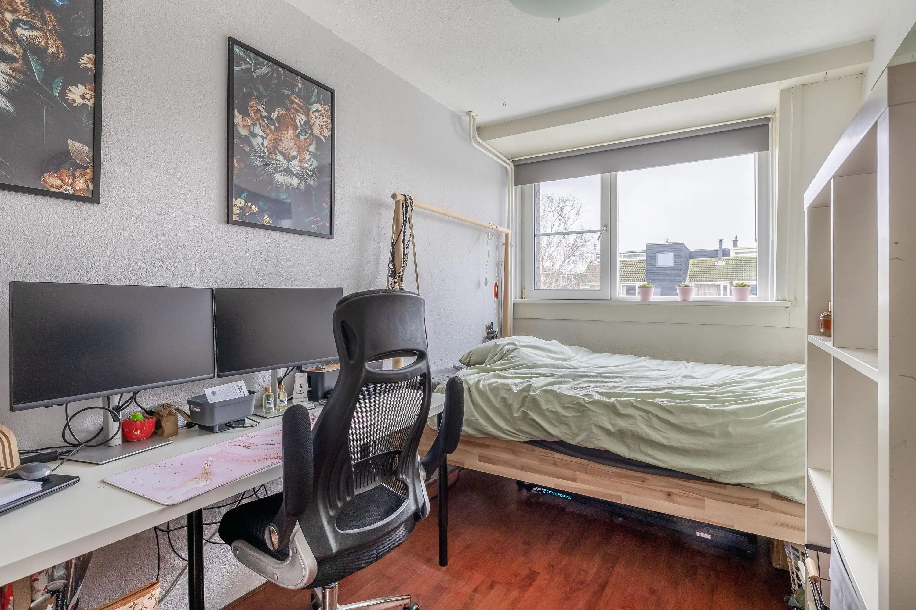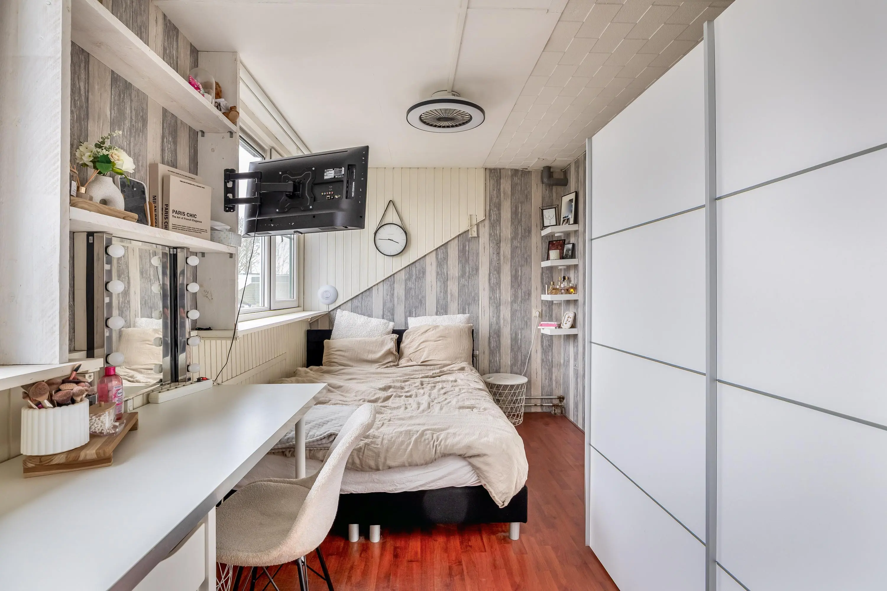 De vierde slaapkamer is afgewerkt met dezelfde laminaatvloer als de overige slaapkamers en profiteert dankzij het dakkapel van prettig daglicht. De kamer heeft een oppervlakte van circa 13m².