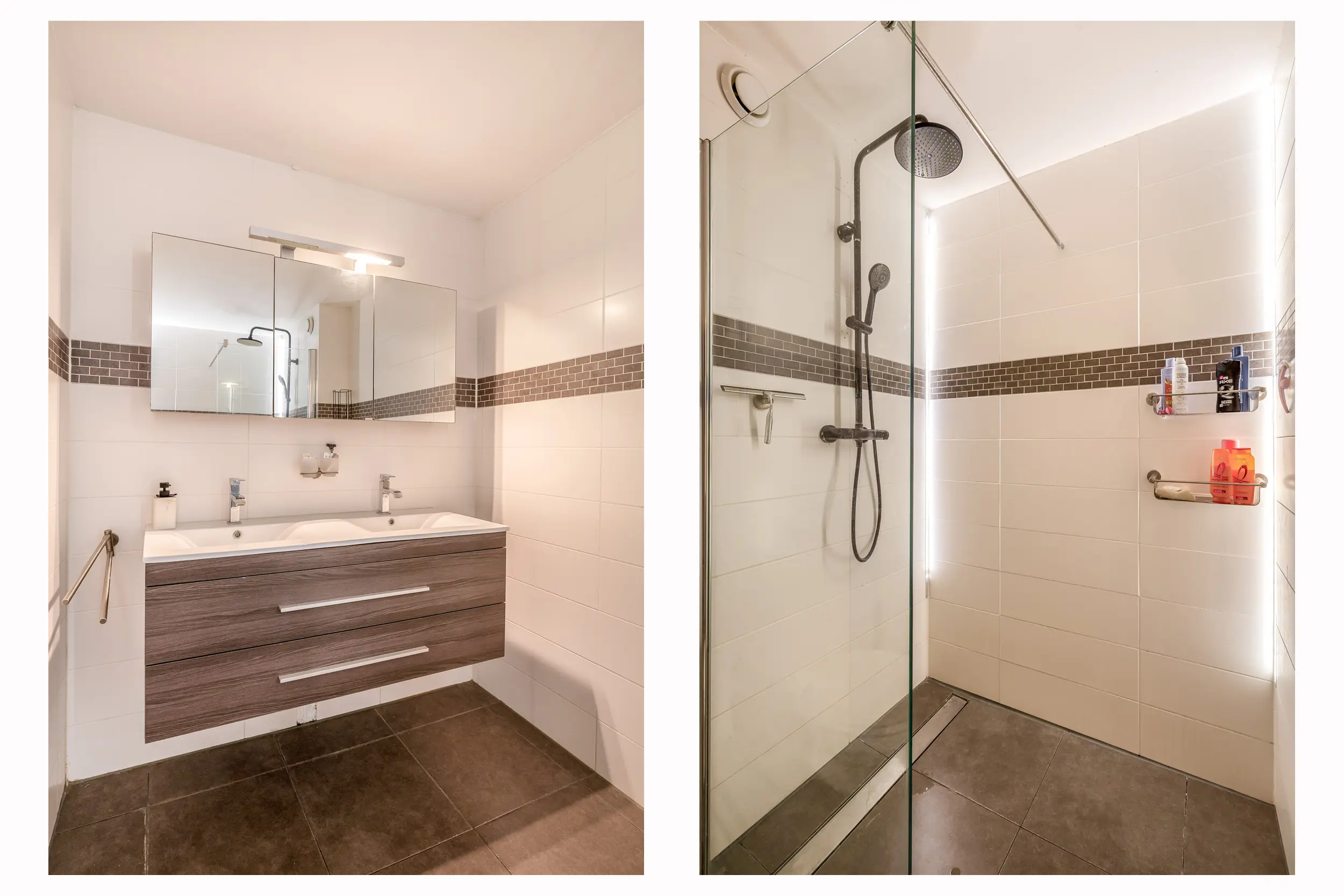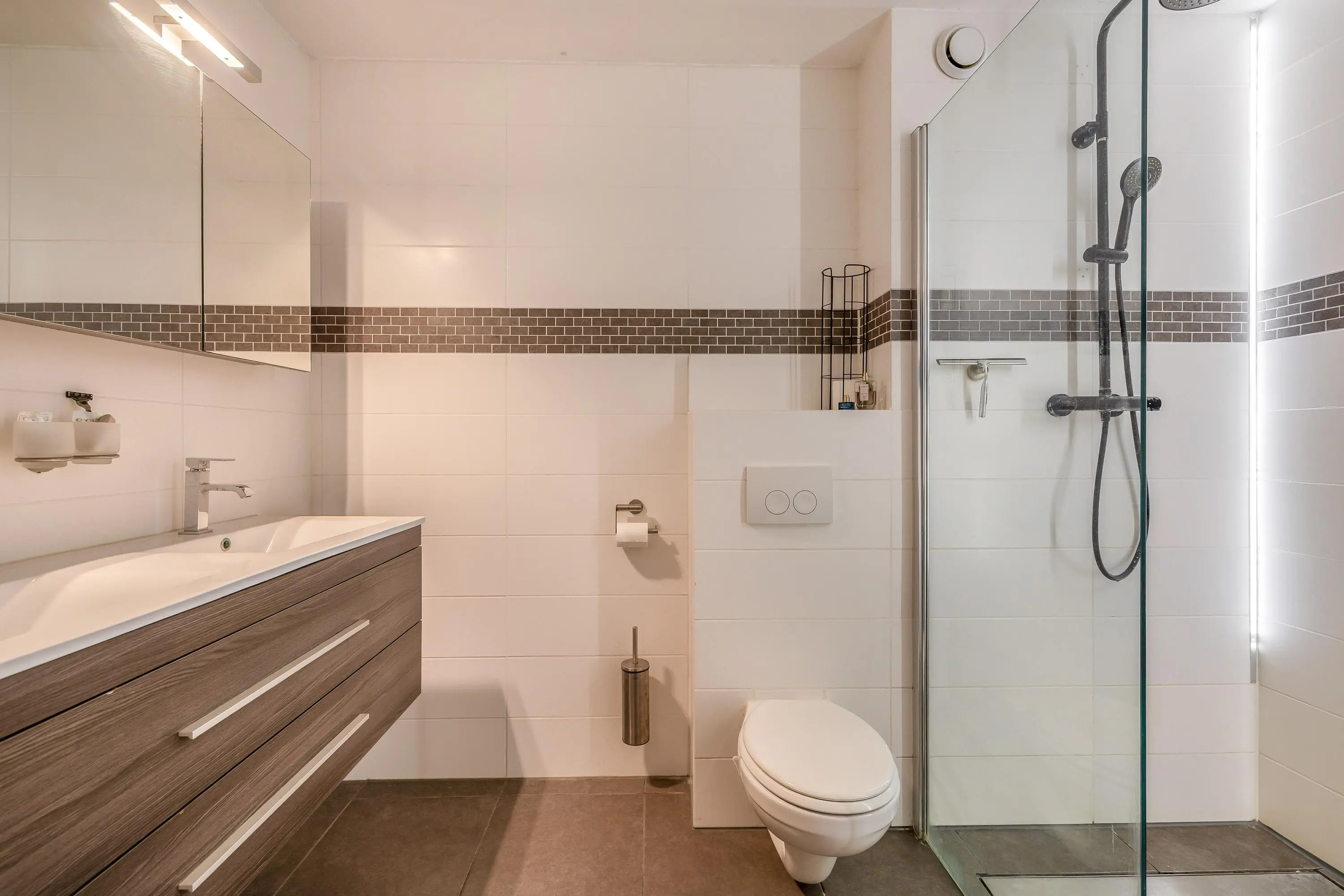 De badkamer is netjes onderhouden en ingericht met een inloopdouche, toilet en een wastafelmeubel met dubbele wastafel. In de douche zijn LED-lichtstrips verwerkt, wat zorgt voor een luxe en sfeervolle uitstraling.
