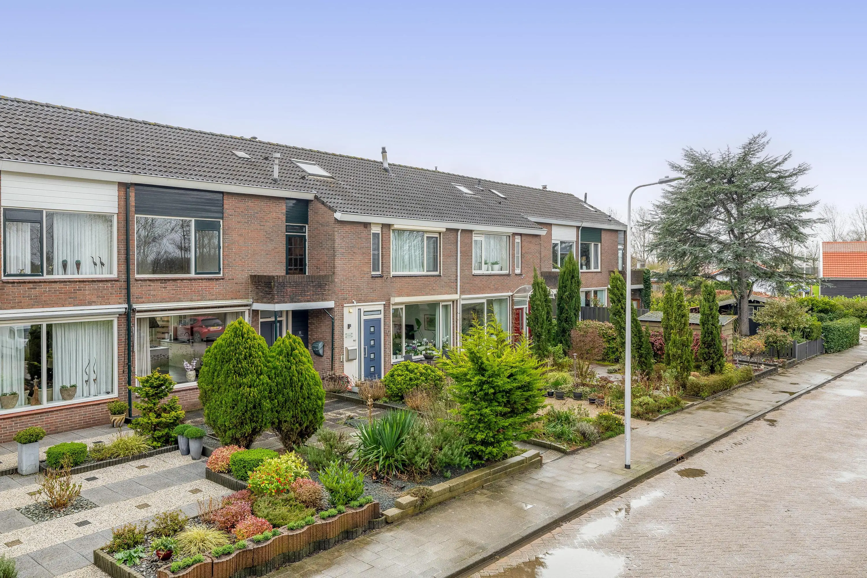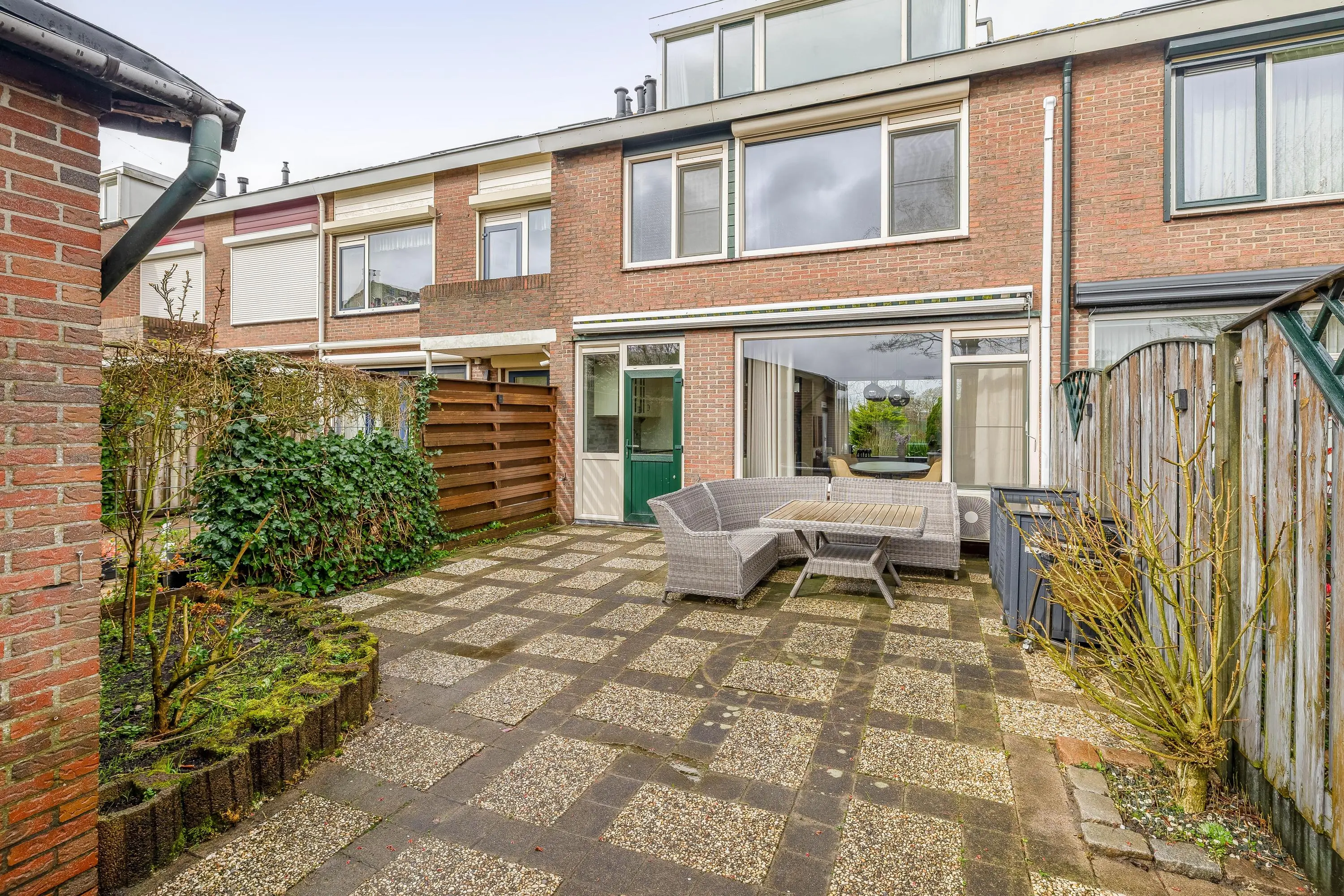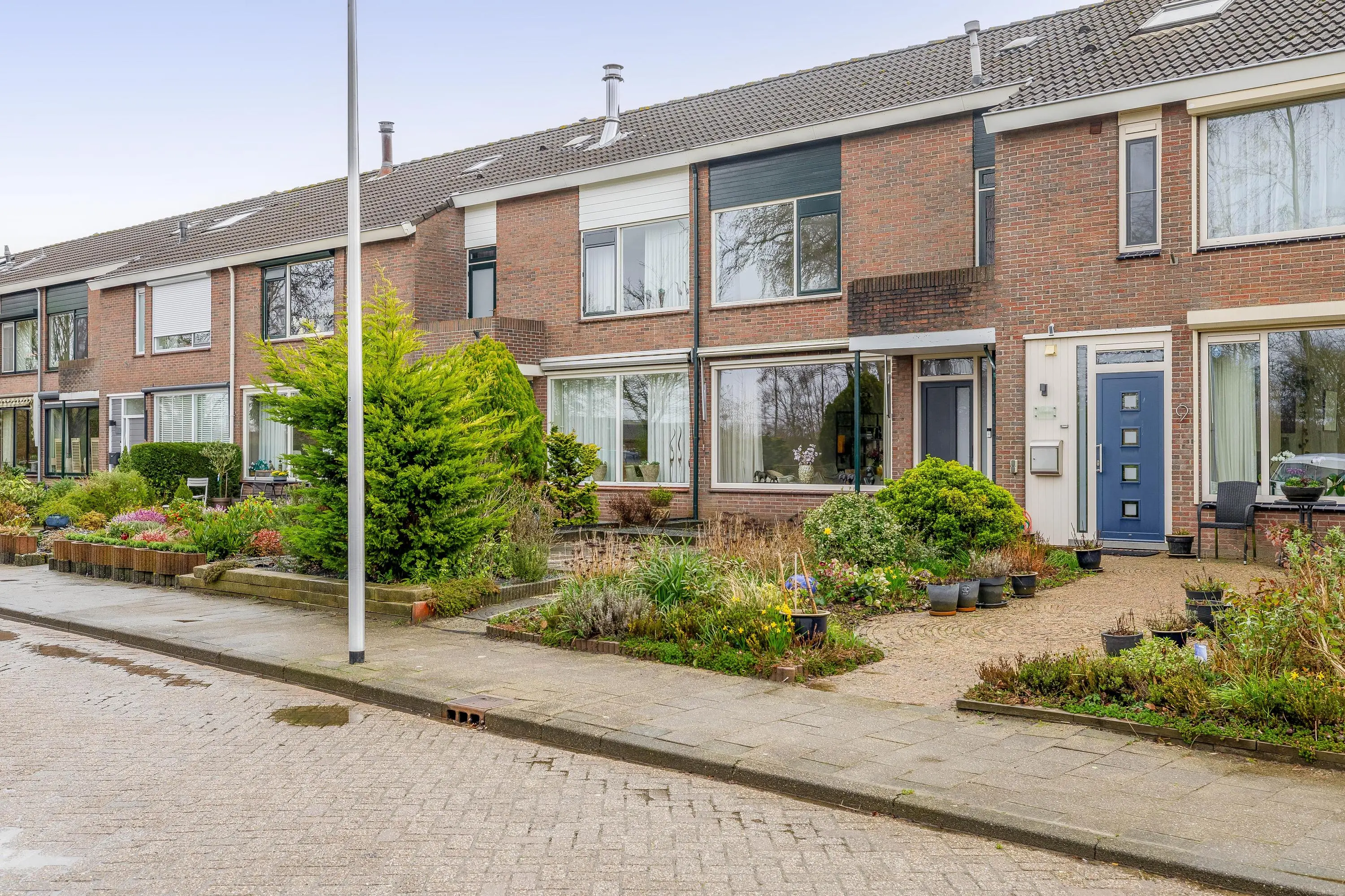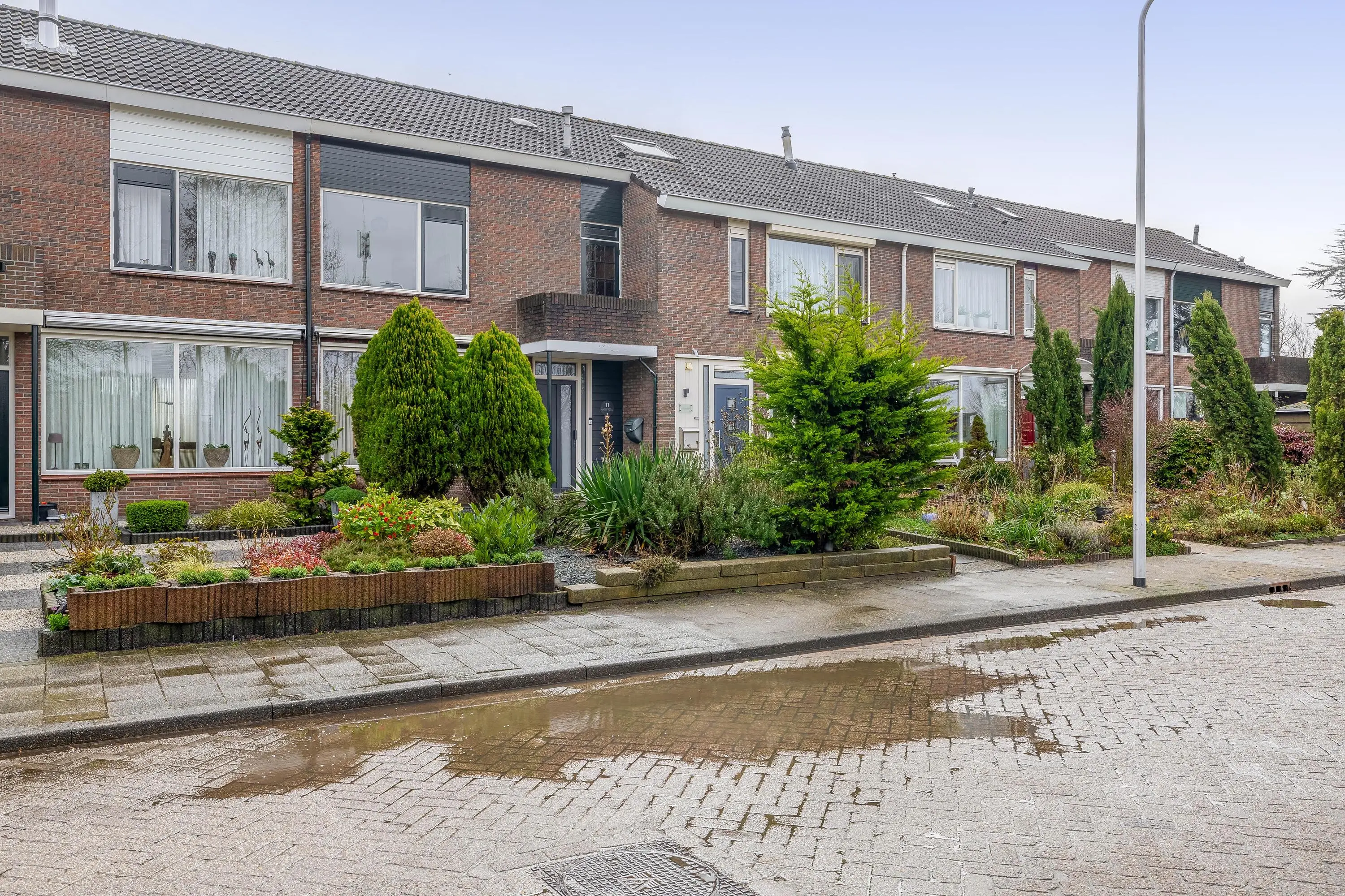 De voortuin is grotendeels betegeld en voorzien van enkele borders met groen.