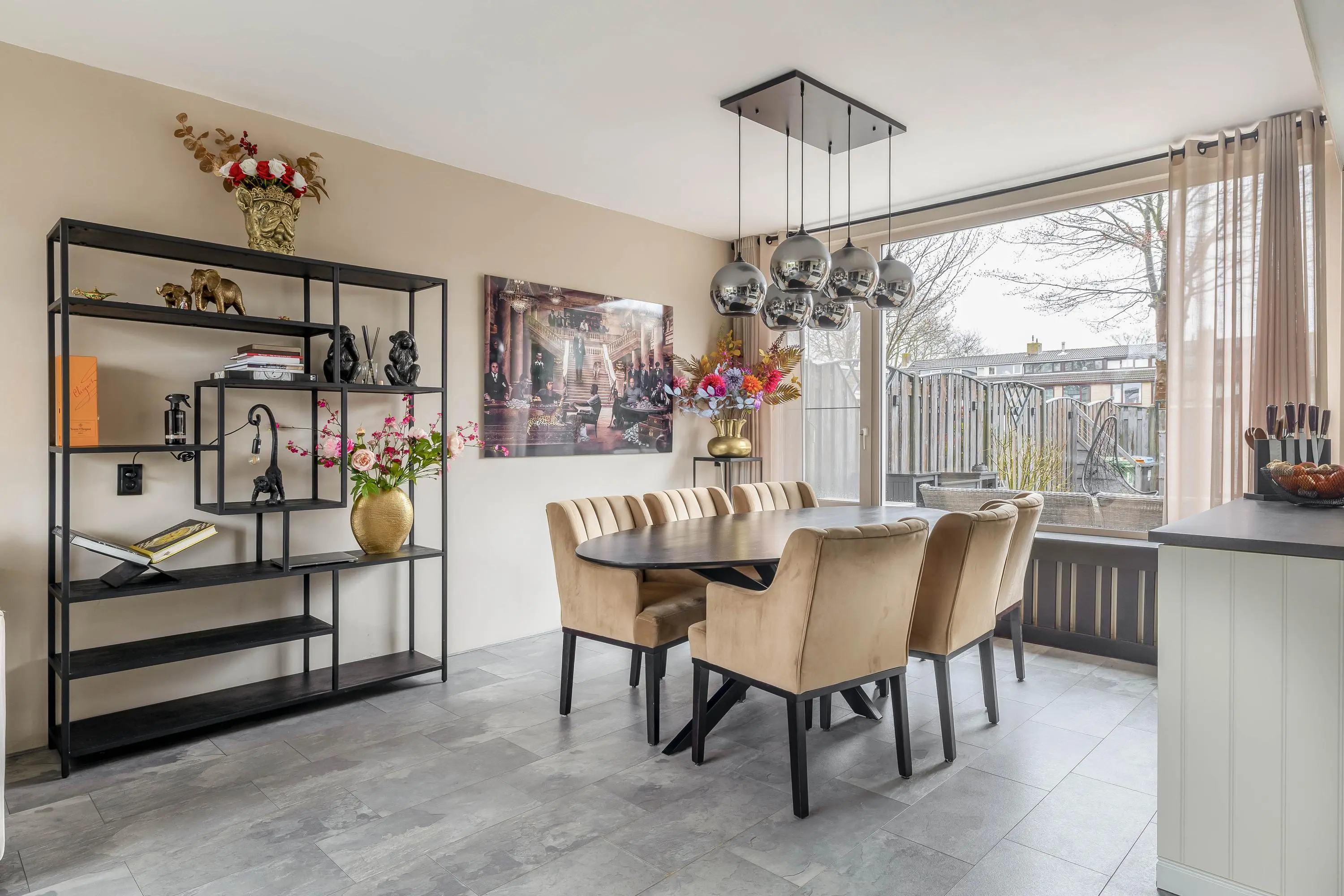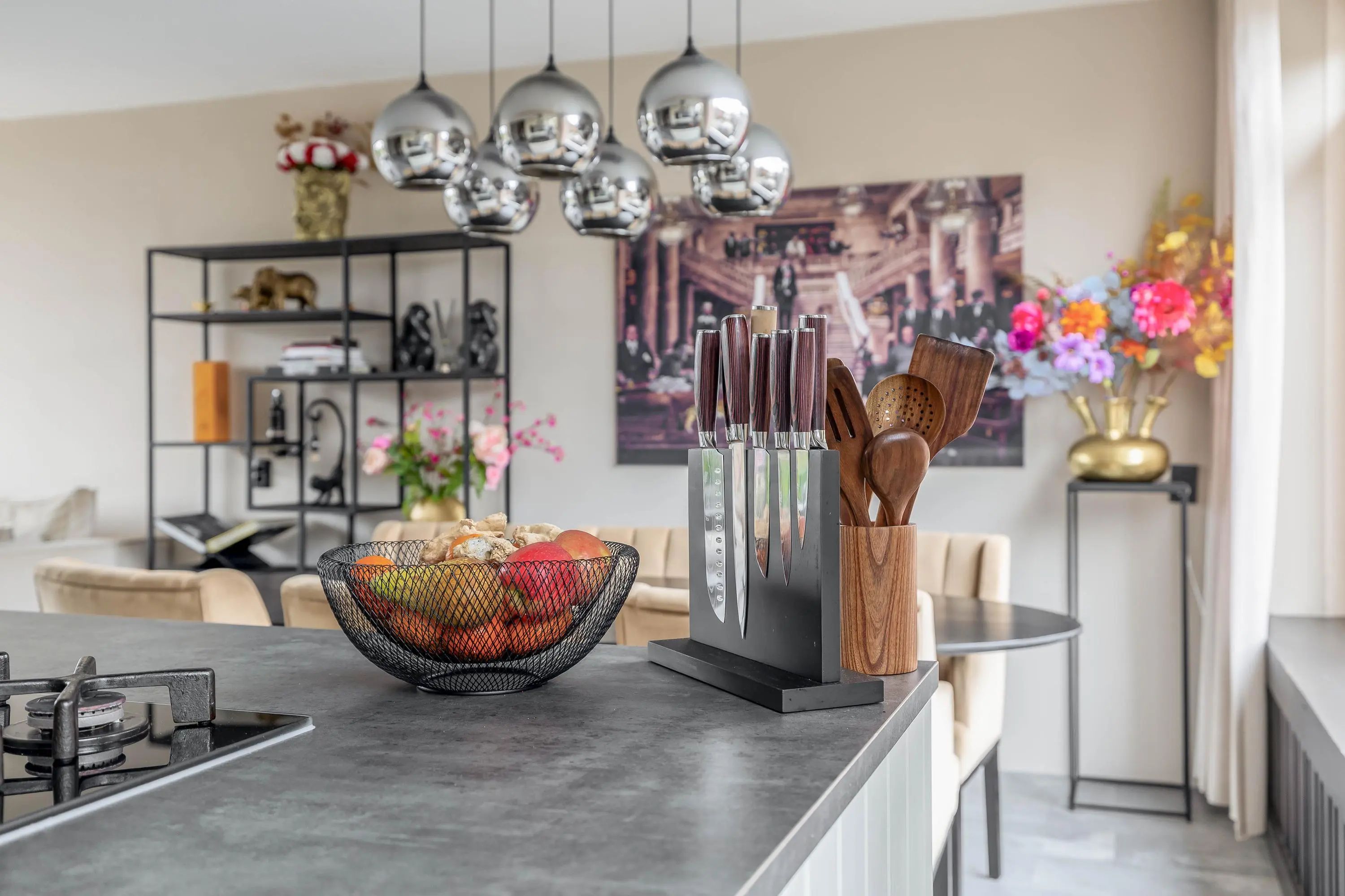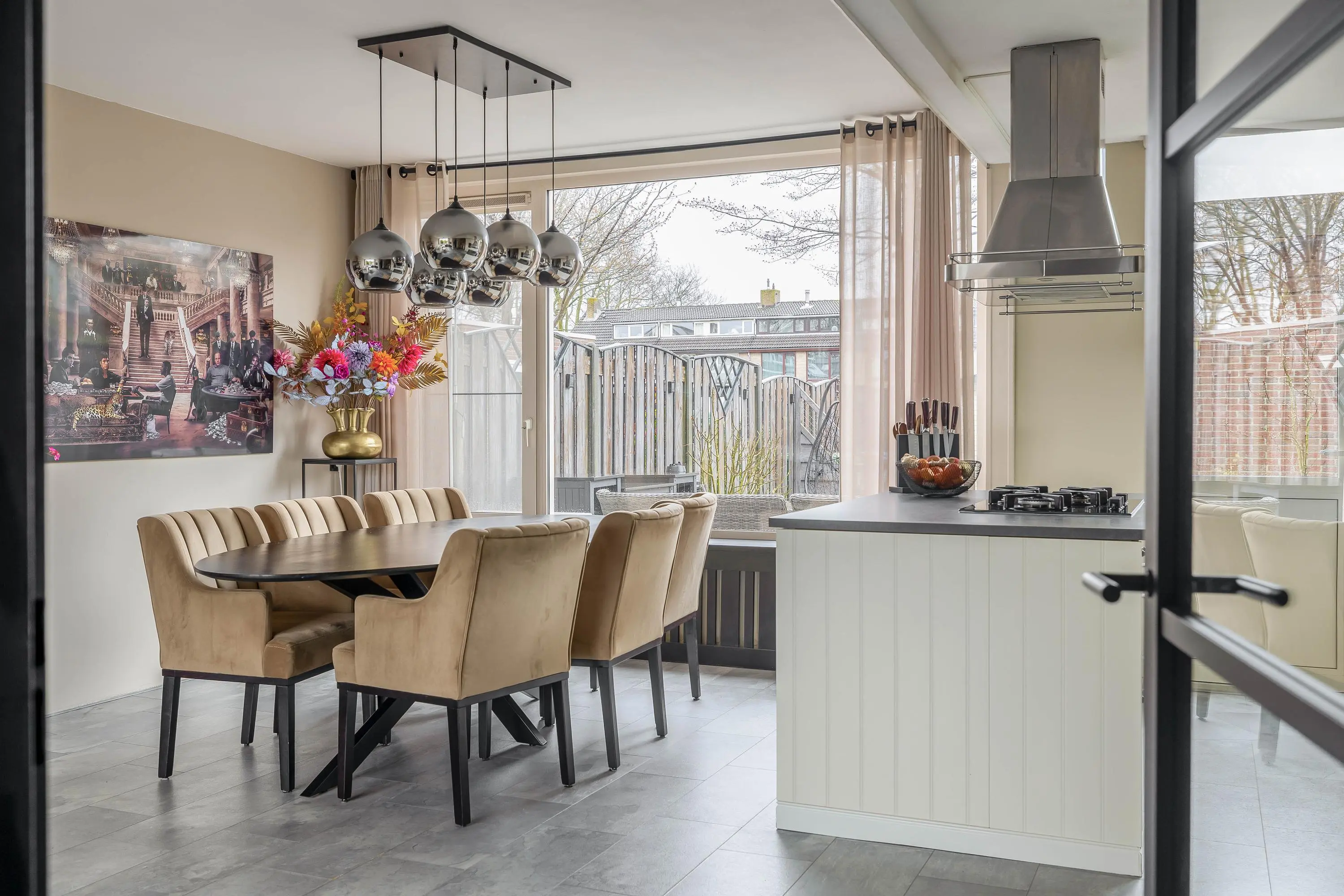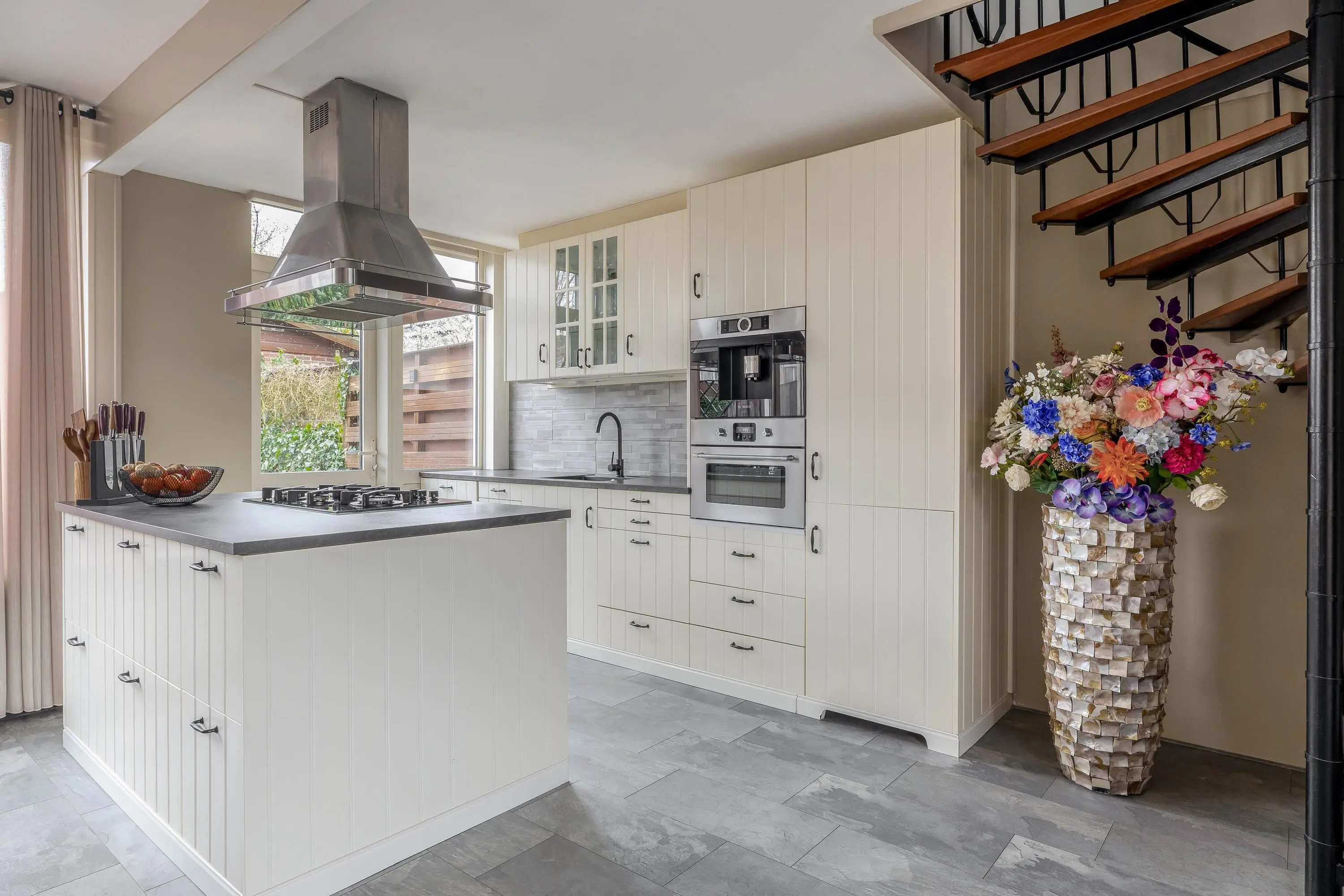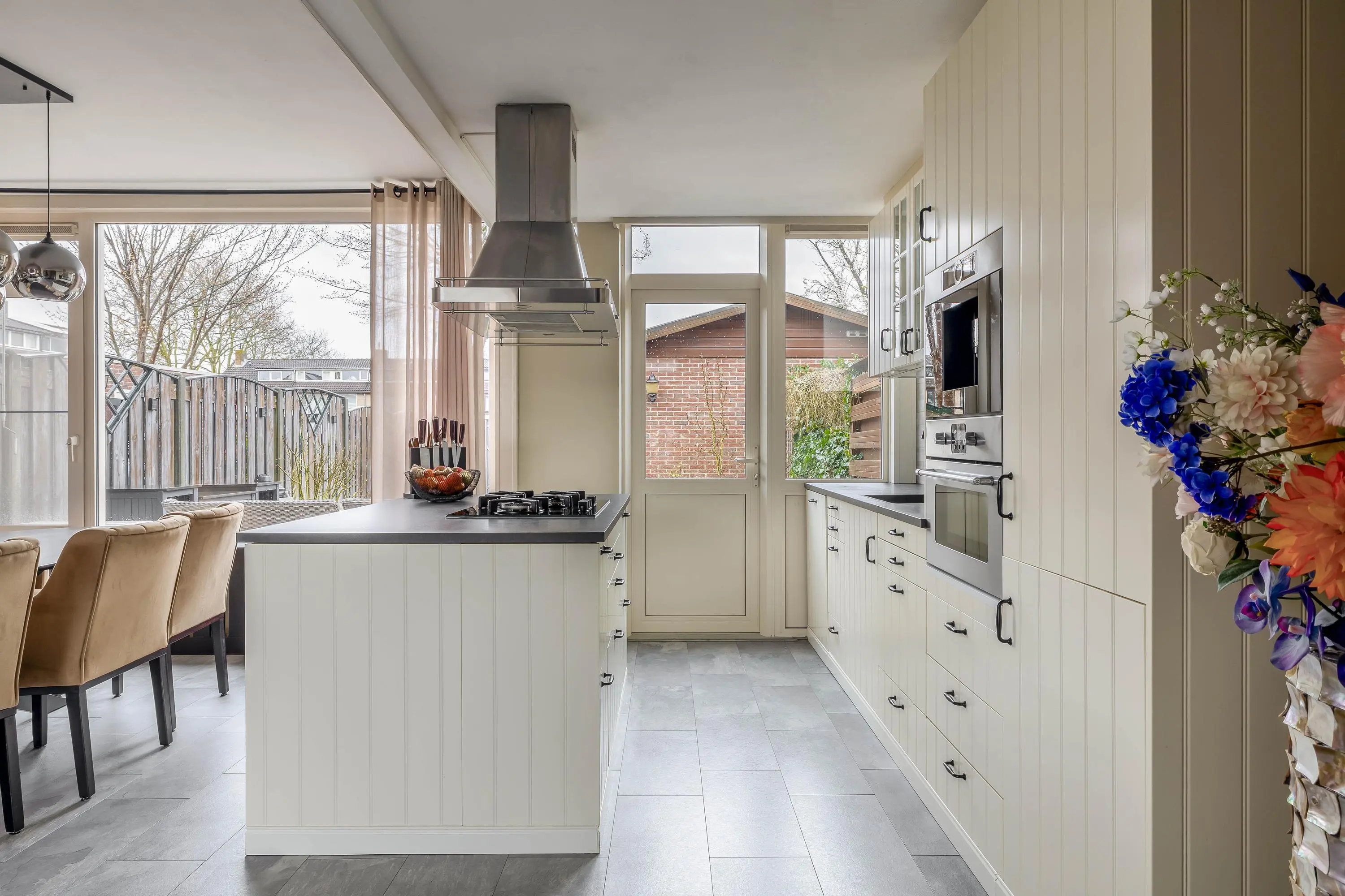 De keuken heeft een eigentijdse uitstraling en is keurig onderhouden. Deze is opgesteld langs de wand en beschikt daarnaast over een kookeiland. De wandopstelling is voorzien van een spoelbak, combimagnetron, koffiemachine, vaatwasser en een koel-/vriescombinatie. Het kookeiland is uitgerust met een 5-pits gaskookplaat met afzuigkap. Daarnaast is er volop bergruimte aanwezig voor al uw keukengerei. Kortom, een ideale plek om uitgebreid te koken! Via een enkele deur is de achtertuin bereikbaar.