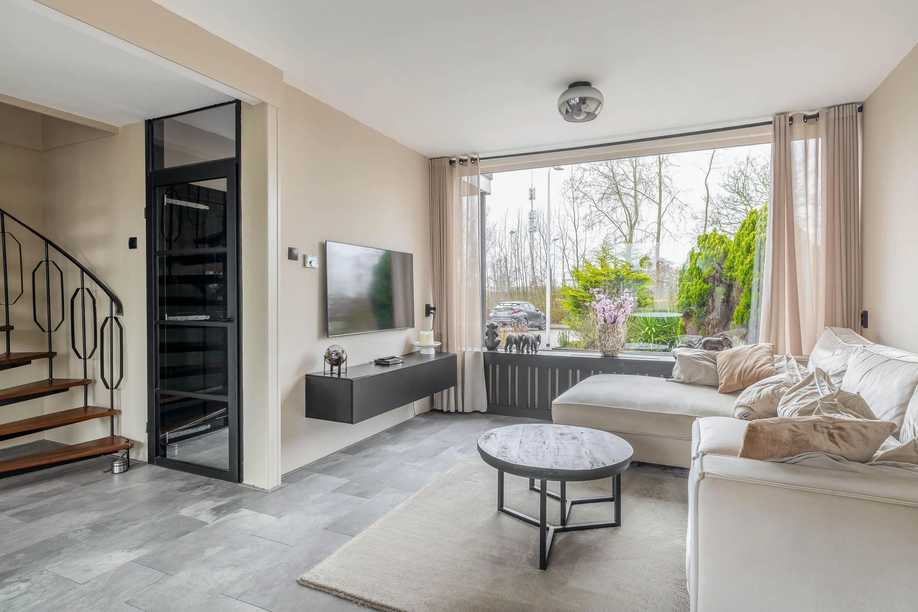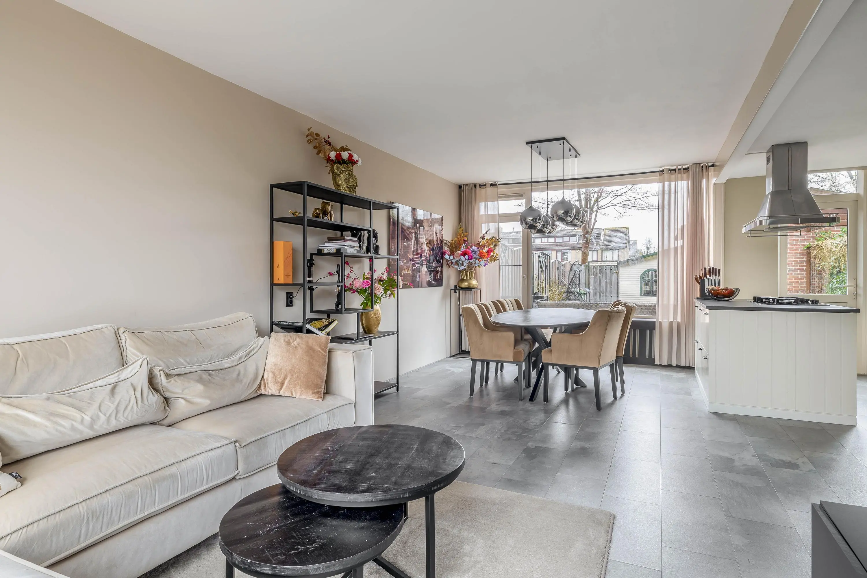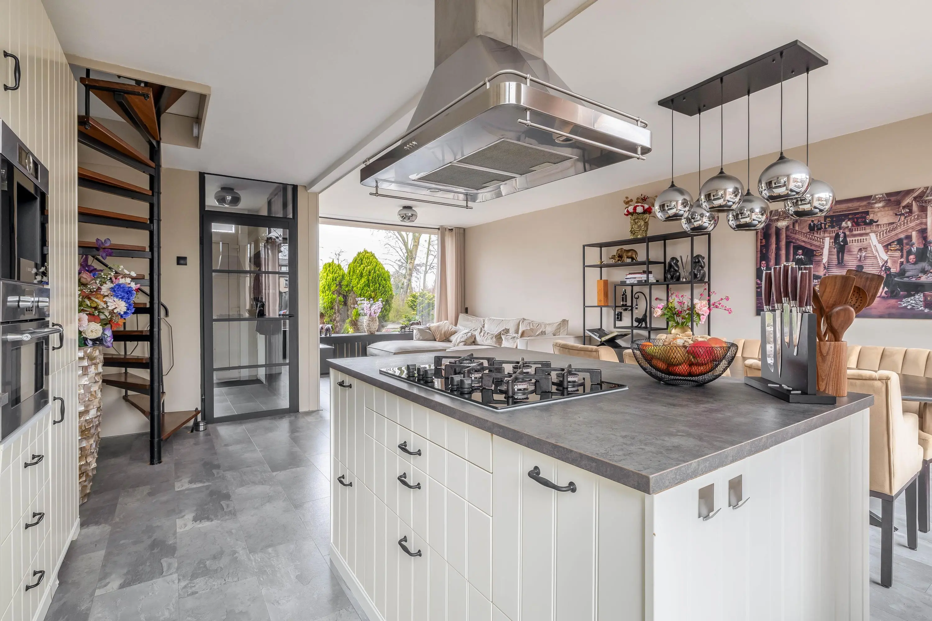 De living is royaal van opzet en geniet van een prettige lichtinval dankzij de raampartijen aan zowel de voor- als achterzijde. Beide ramen zijn voorzien van zonneschermen. Door de ruime opzet is de woonkamer eenvoudig in te delen in een gezellige zit- en een aparte eethoek. De woonkeuken sluit hier naadloos op aan. In de living bevindt zich tevens de stijlvolle spiltrap naar de eerste verdieping.