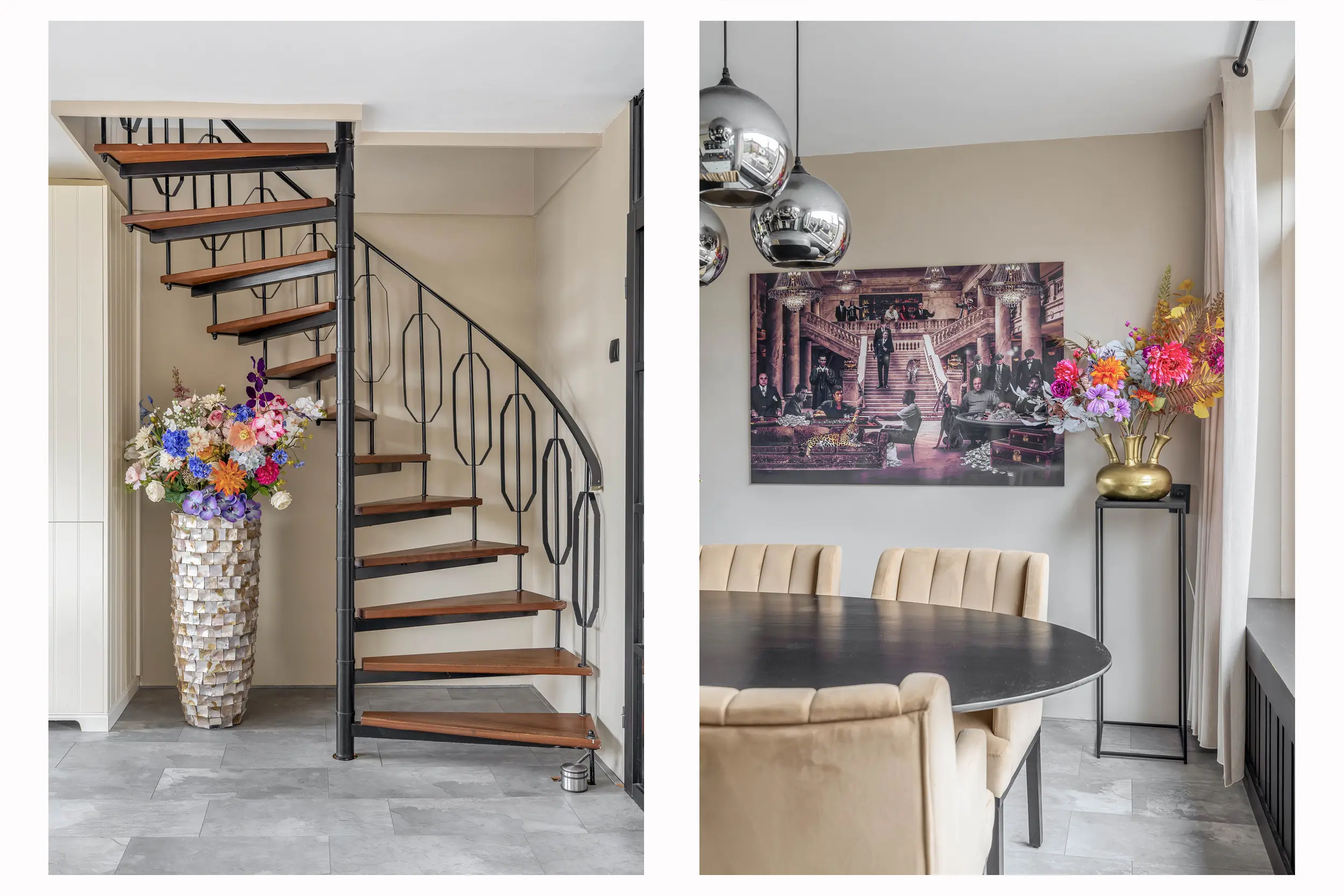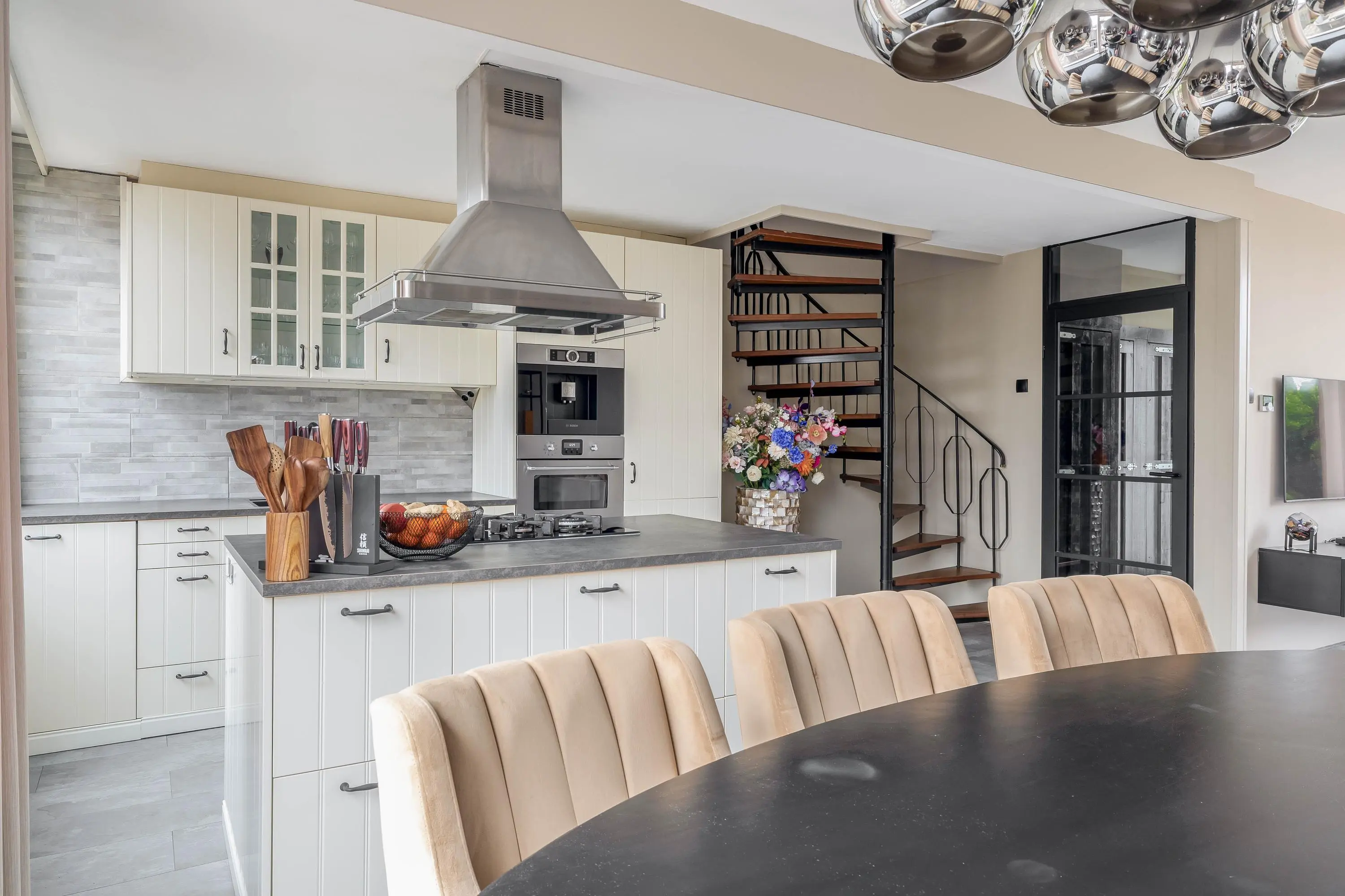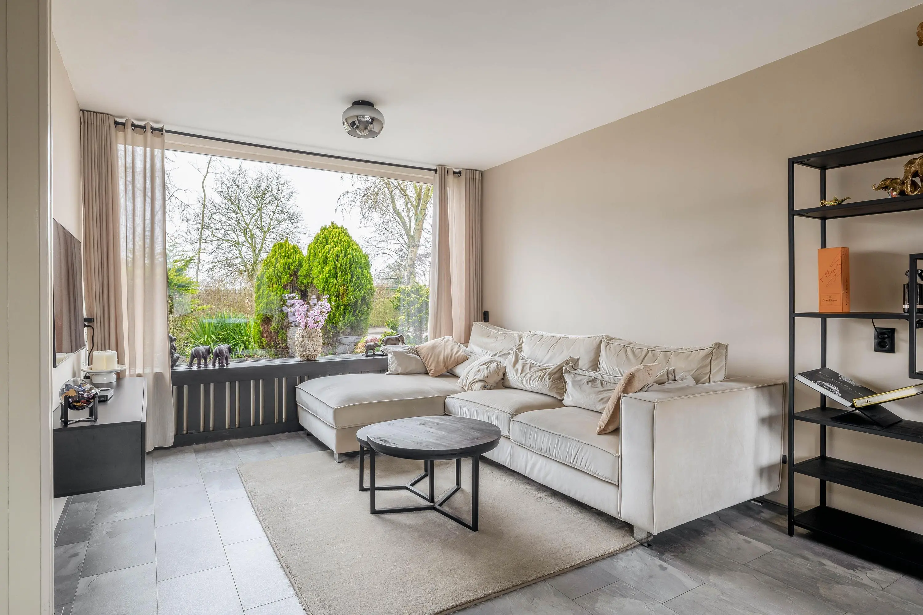 De living is royaal van opzet en geniet van een prettige lichtinval dankzij de raampartijen aan zowel de voor- als achterzijde. Beide ramen zijn voorzien van zonneschermen. Door de ruime opzet is de woonkamer eenvoudig in te delen in een gezellige zit- en een aparte eethoek. De woonkeuken sluit hier naadloos op aan. In de living bevindt zich tevens de stijlvolle spiltrap naar de eerste verdieping.