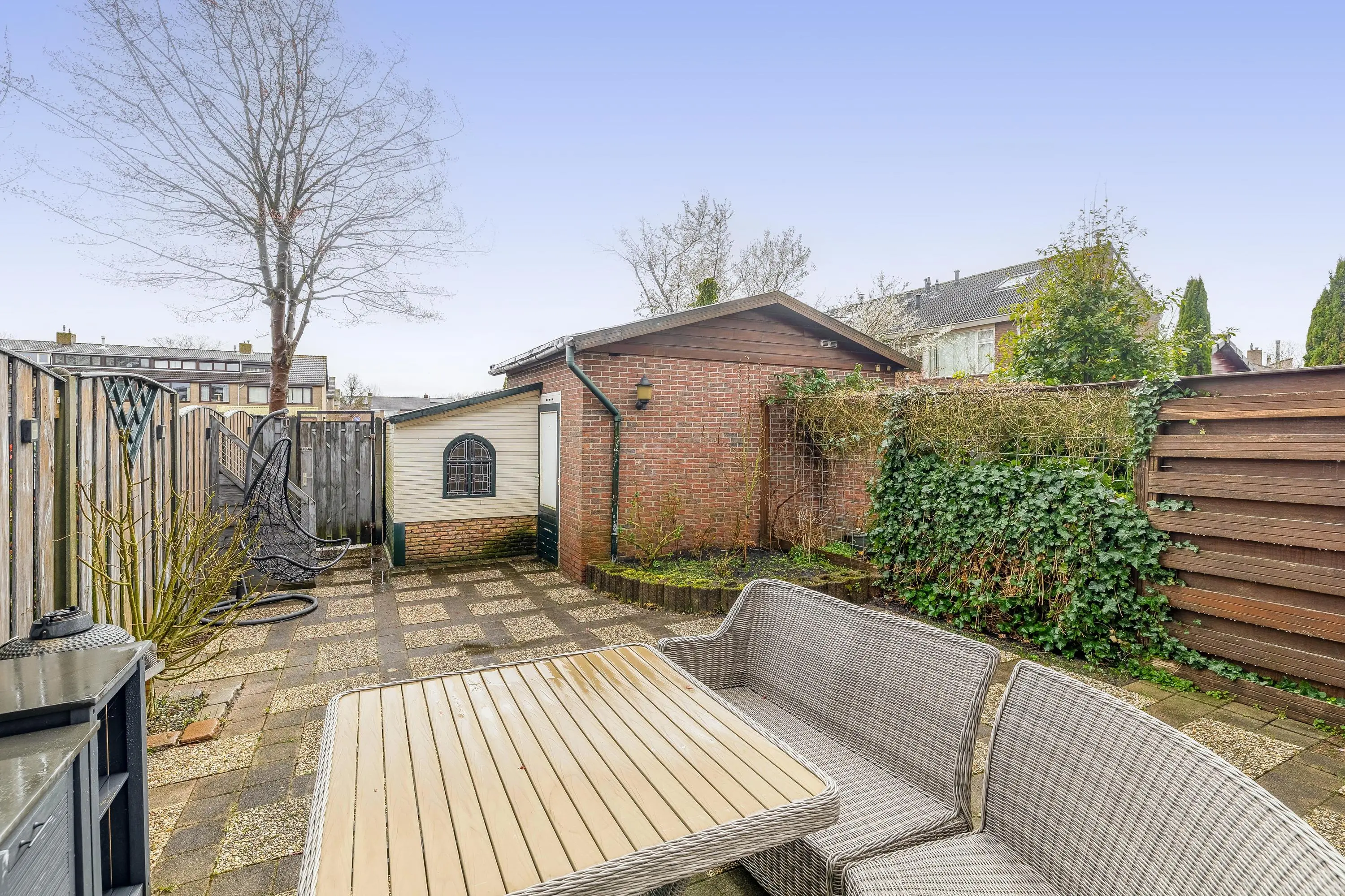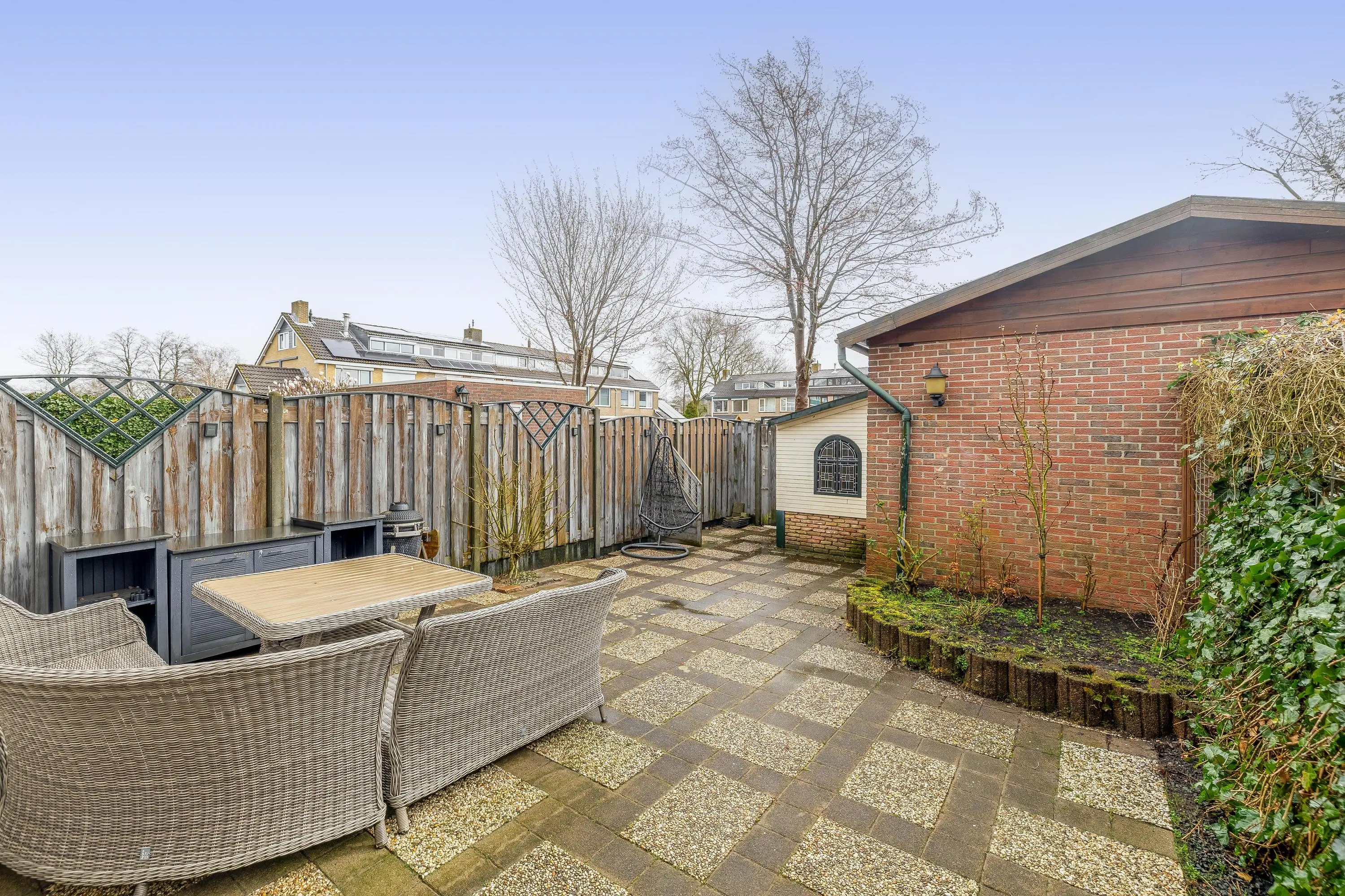De op het zuidoosten gelegen achtertuin is heerlijk zonnig en biedt gedurende de dag volop zonuren. De tuin is ruim opgezet en grotendeels betegeld, gecombineerd met groene borders. Dankzij de royale afmetingen is er alle ruimte om de tuin naar eigen wens in te richten, bijvoorbeeld met een gezellige loungehoek. Achterin bevindt zich een stenen berging met elektra en de tuin is tevens bereikbaar via een achterom.
