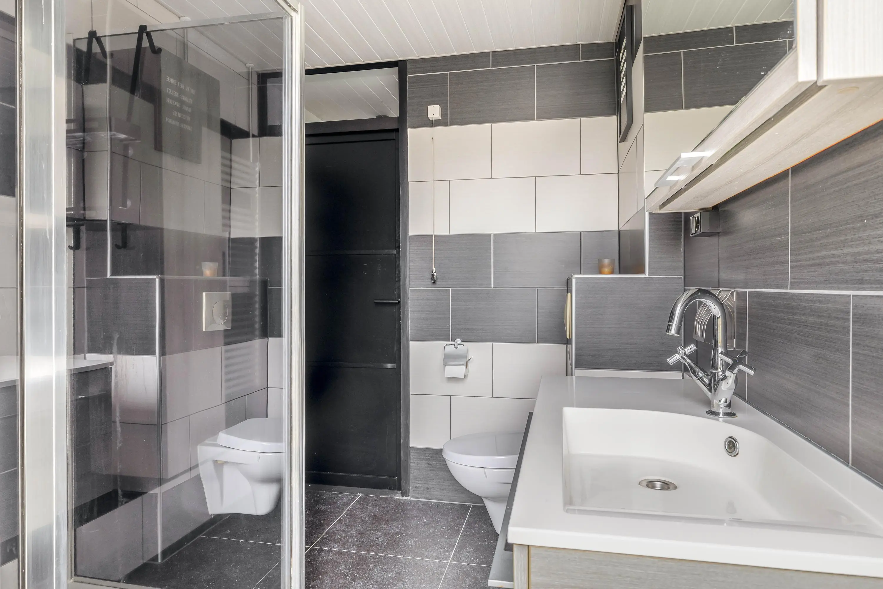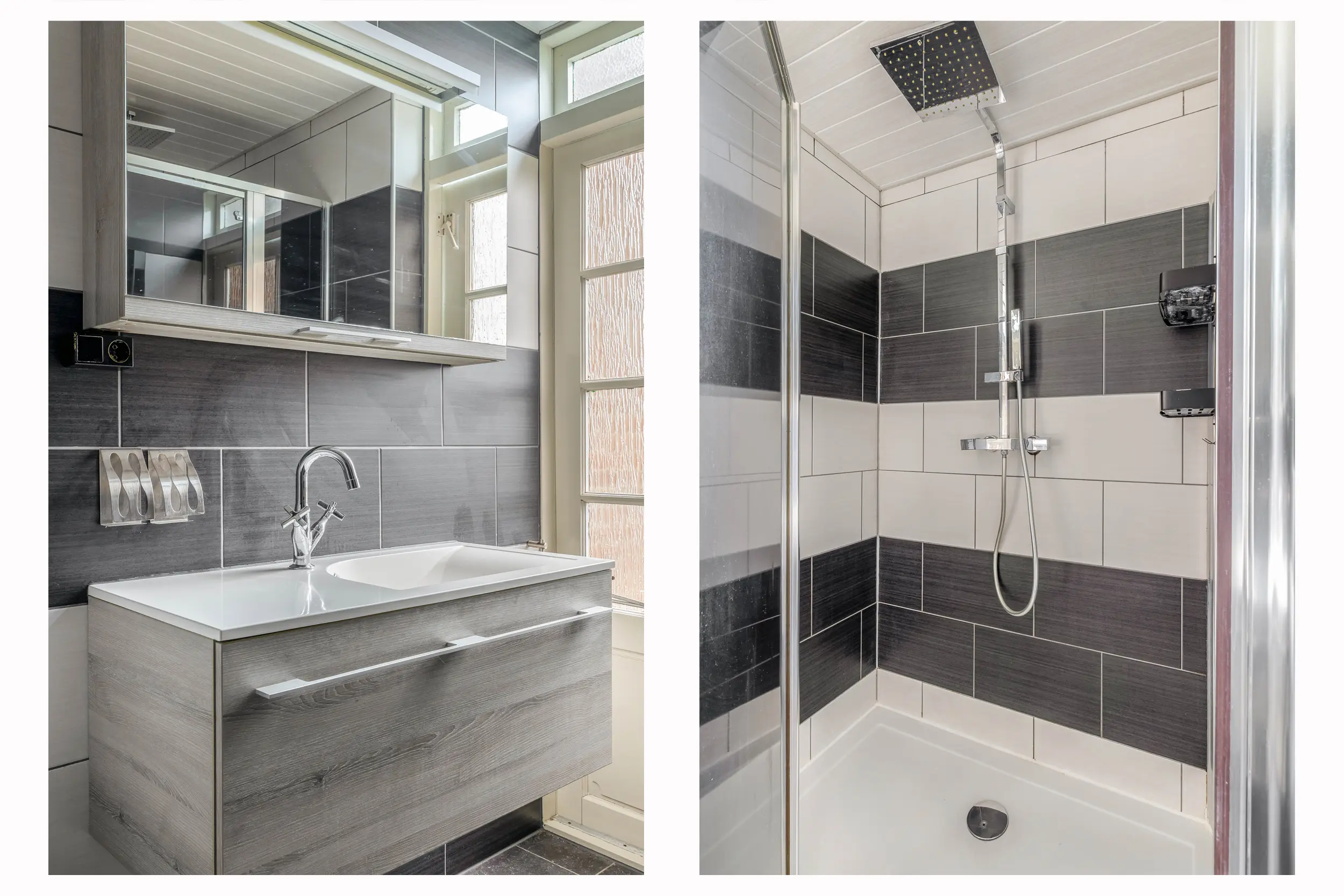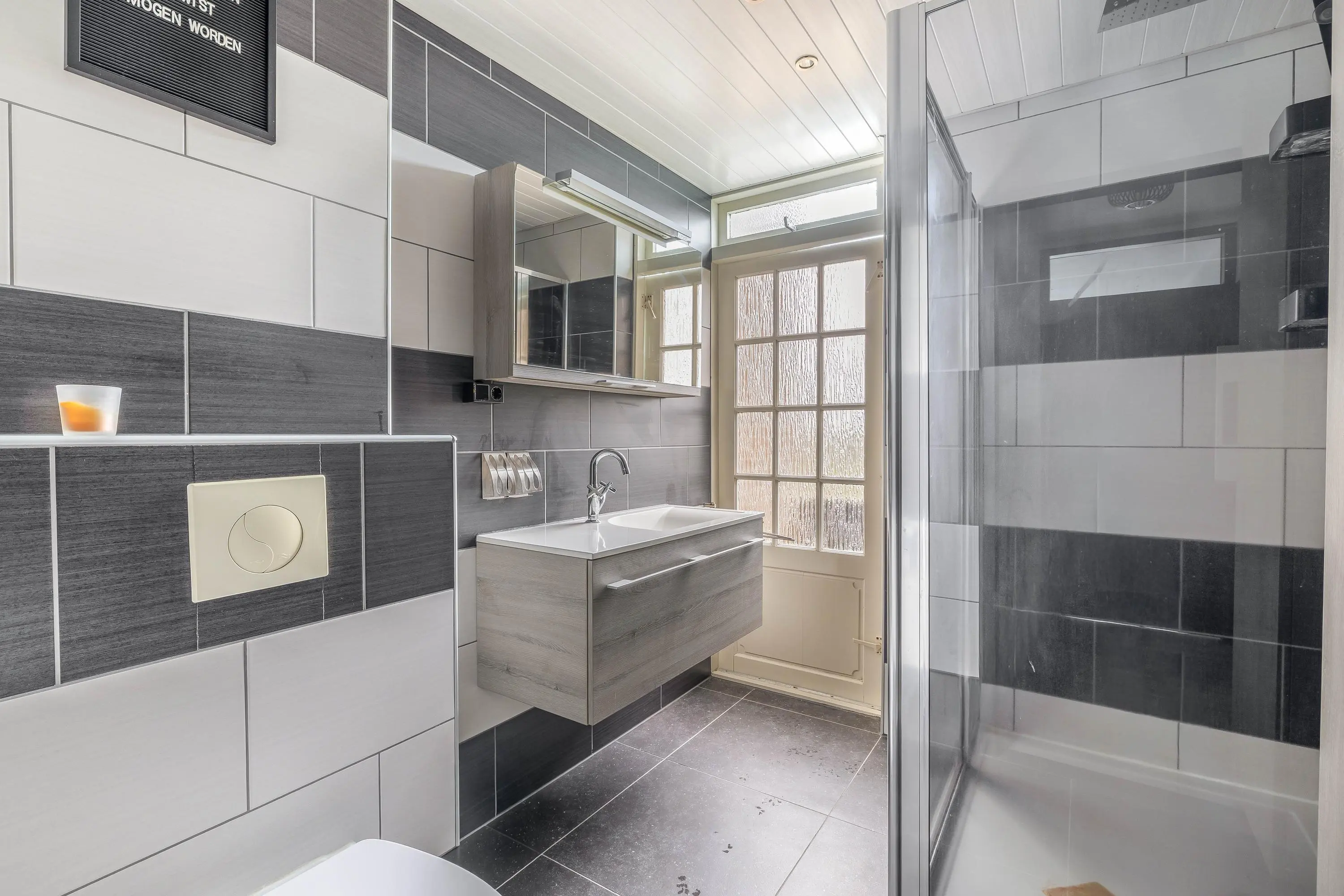 De volledig betegelde badkamer is uitgerust met een douche, toilet en een wastafelmeubel. Vanuit de badkamer is er via een deur toegang tot het balkon. Naast mechanische ventilatie zorgt een raam voor natuurlijke ventilatie.
