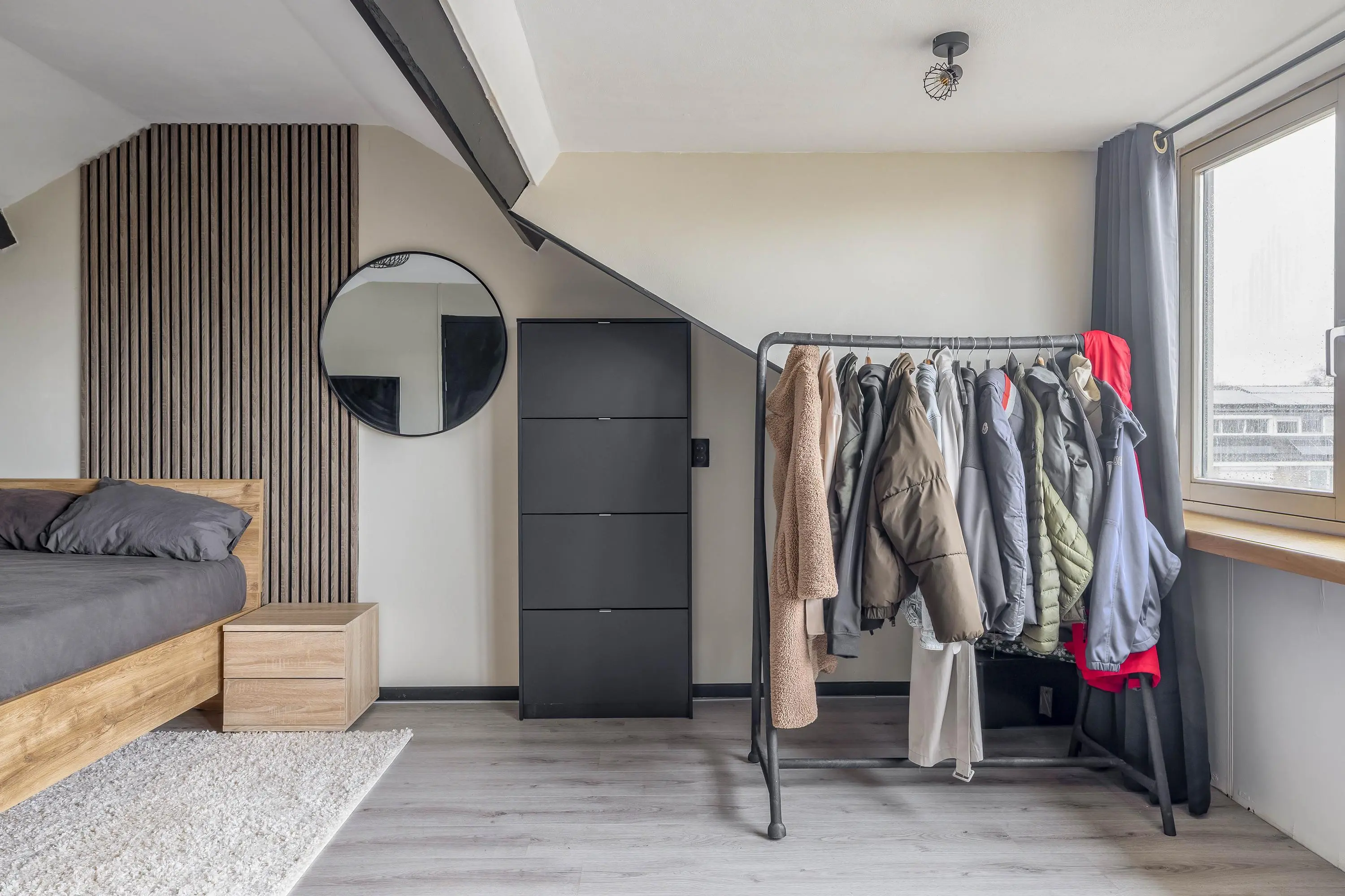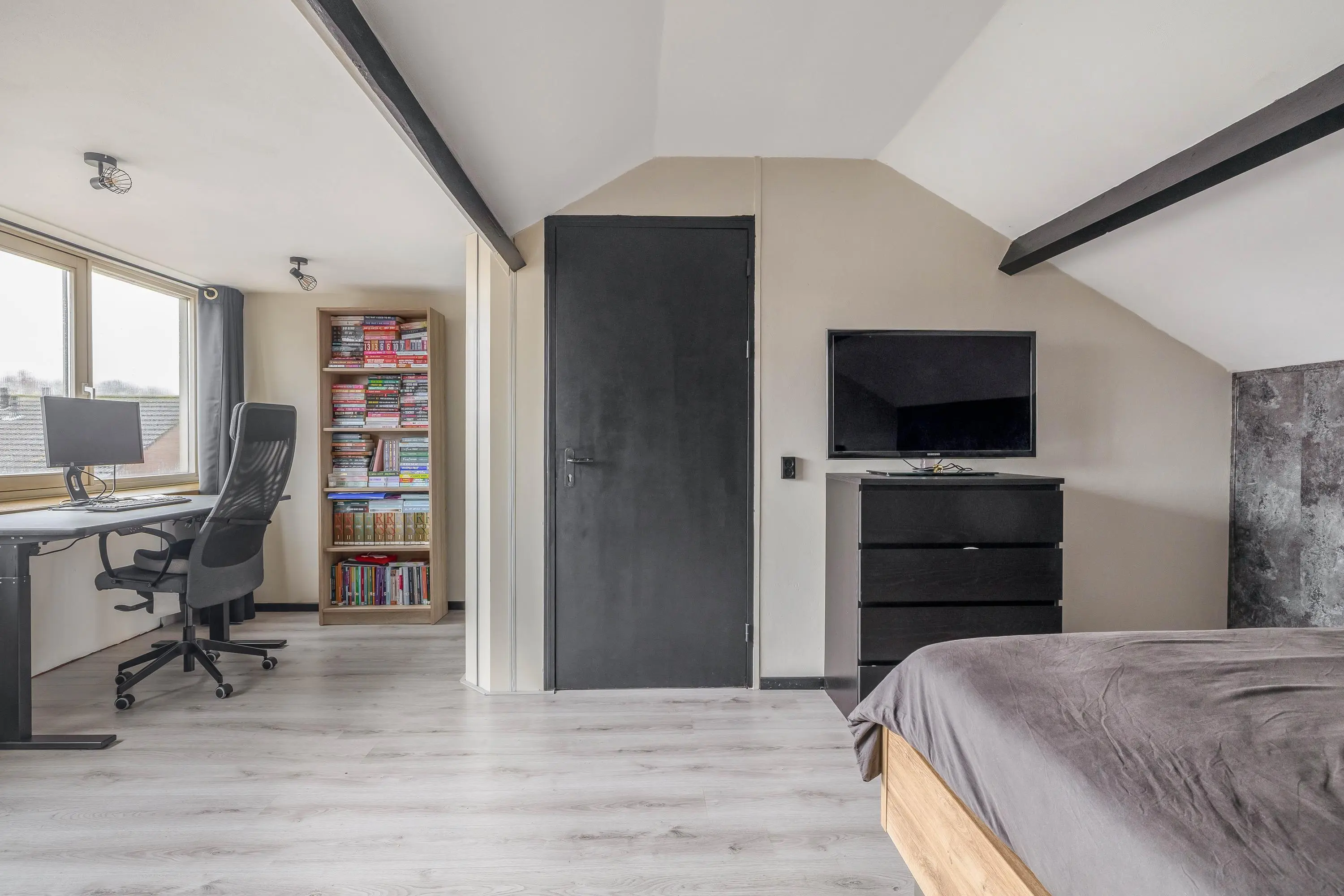 De slaapkamer heeft een oppervlakte van circa 20,5m² en is vergroot middels een dakkapel, wat zorgt voor extra ruimte en een prettige lichtinval. De kamer is afgewerkt met een nette laminaatvloer en beschikt over praktische bergruimte achter knieschotten.