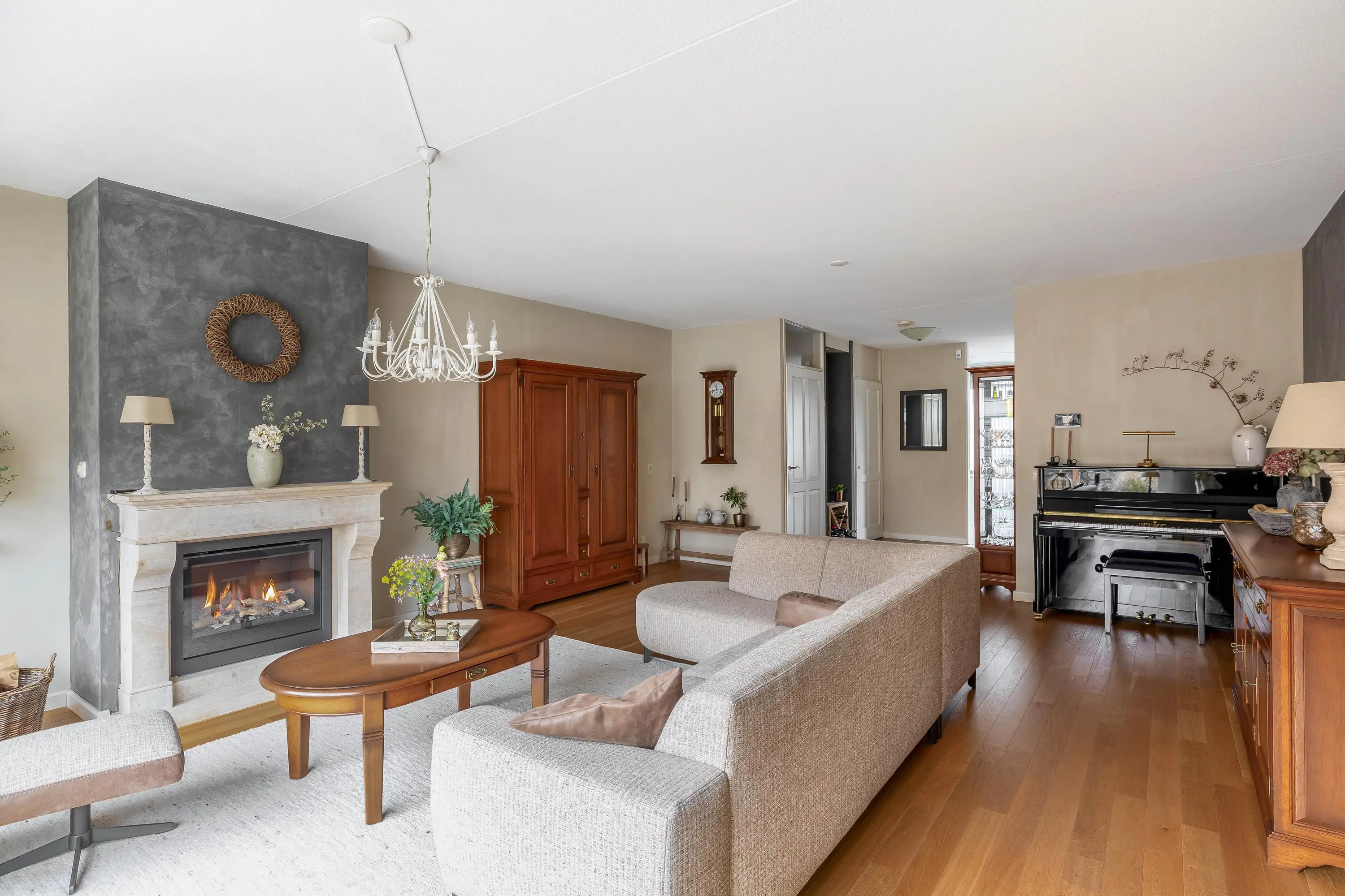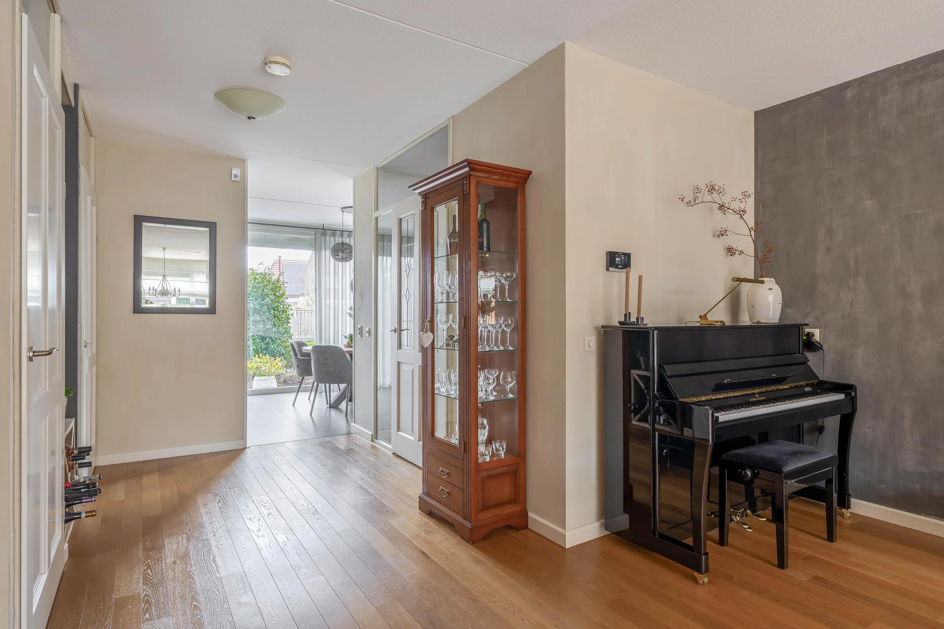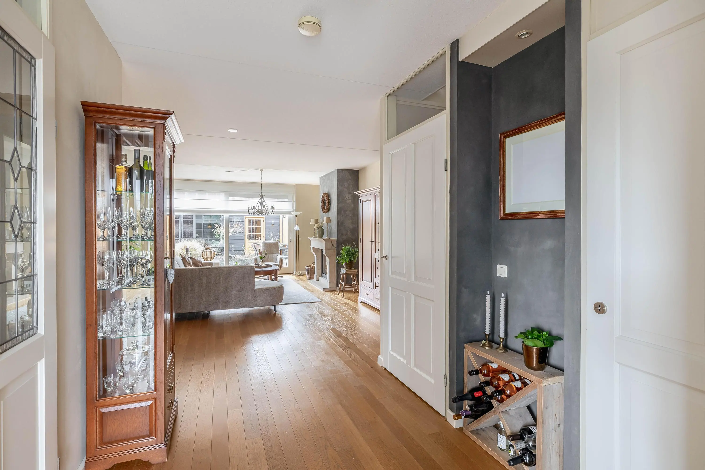 De ruime en aangenaam lichte woonkamer is voorzien van een fraaie eiken parketvloer, een gashaard, gedeeltelijke vloerverwarming en een schuifpui naar de achtertuin. Daarnaast is er een praktische trapkast en een afgesloten trapopgang naar de eerste verdieping.