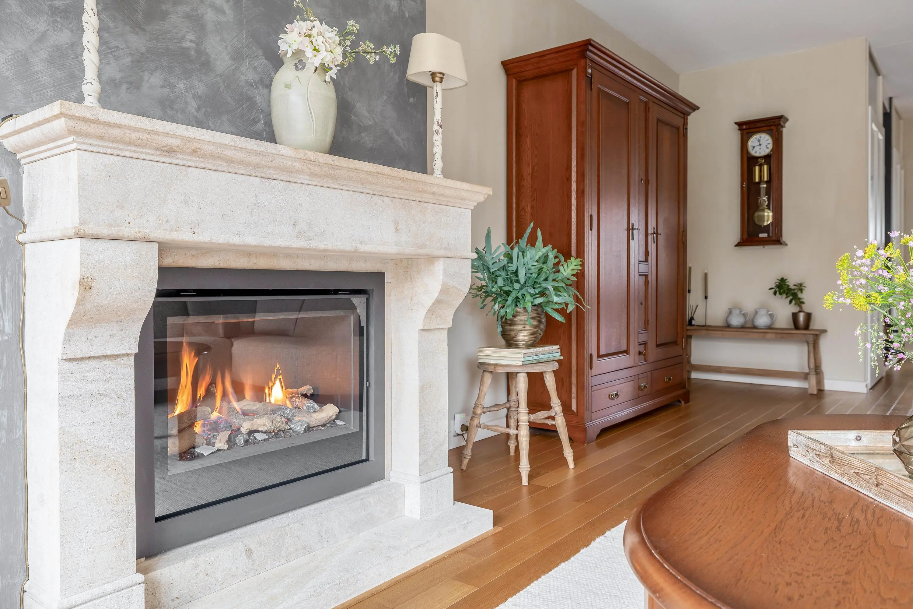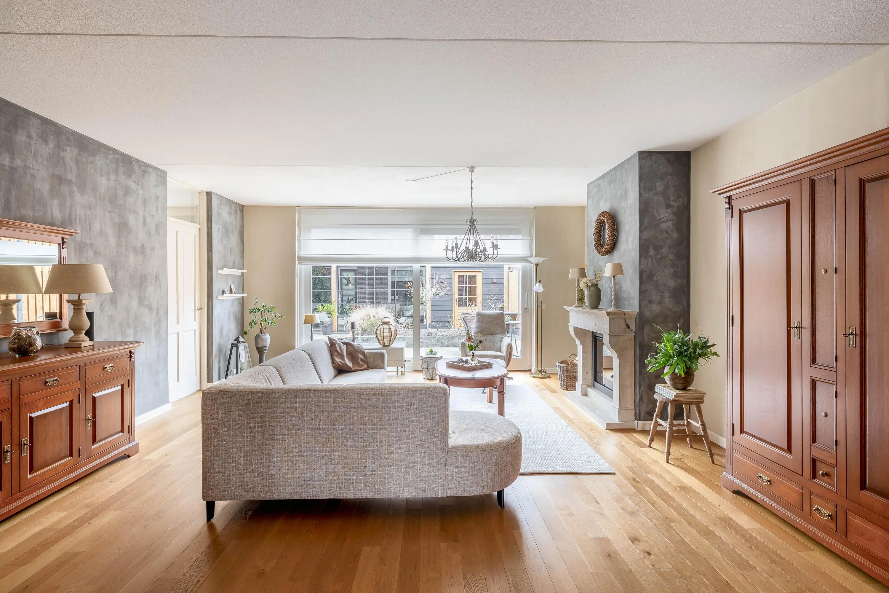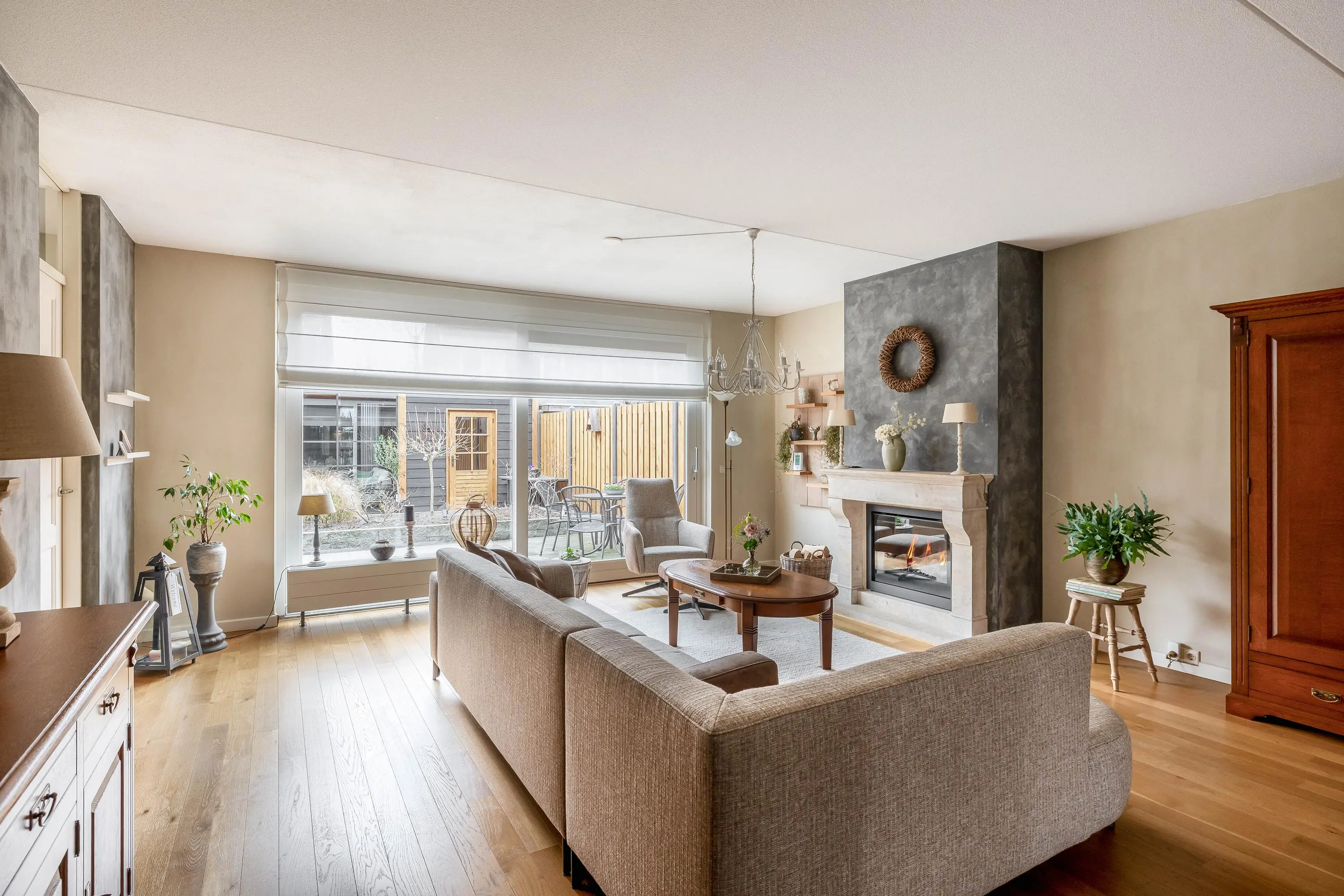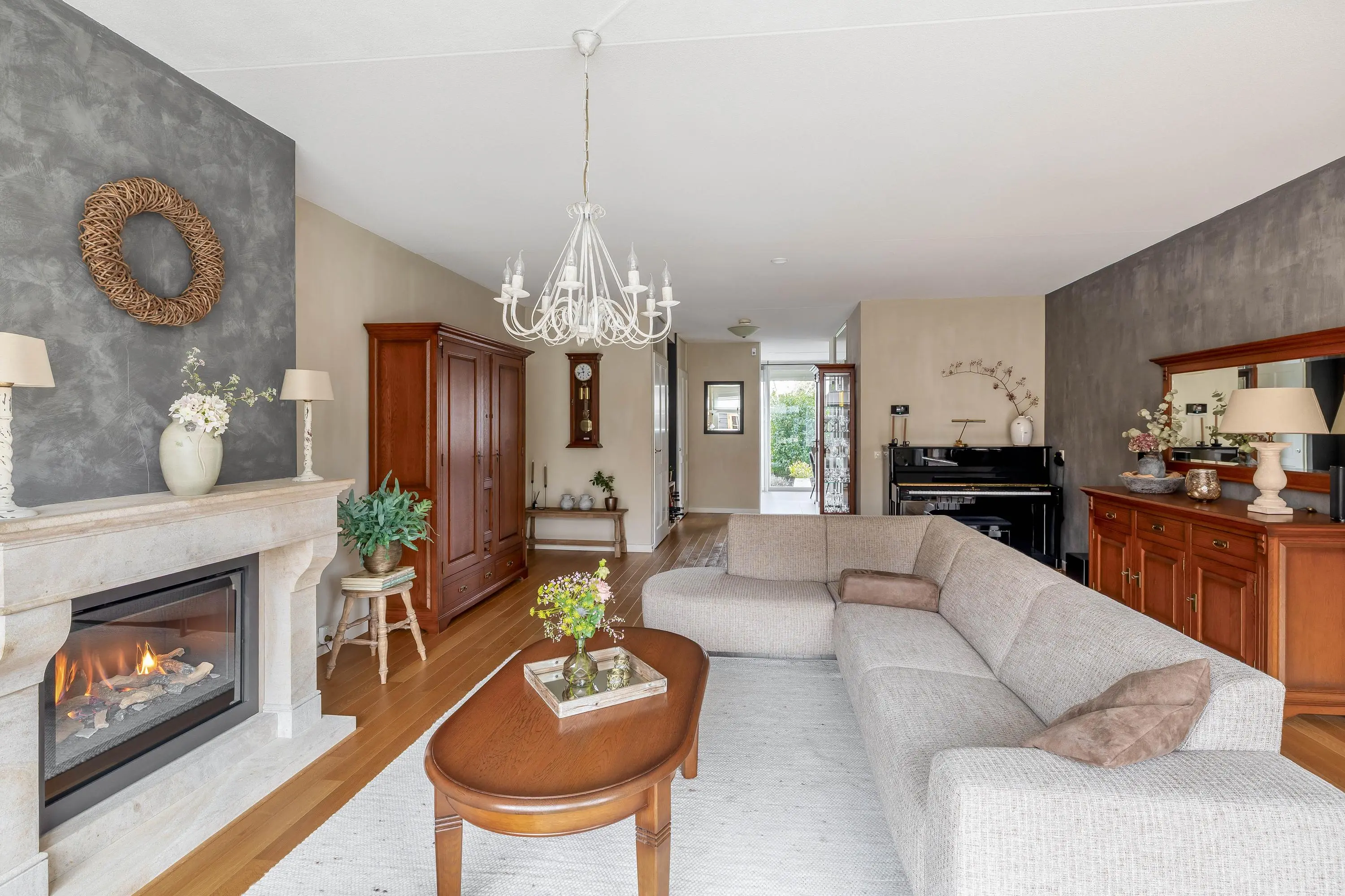 De ruime en aangenaam lichte woonkamer is voorzien van een fraaie eiken parketvloer, een gashaard, gedeeltelijke vloerverwarming en een schuifpui naar de achtertuin. Daarnaast is er een praktische trapkast en een afgesloten trapopgang naar de eerste verdieping.