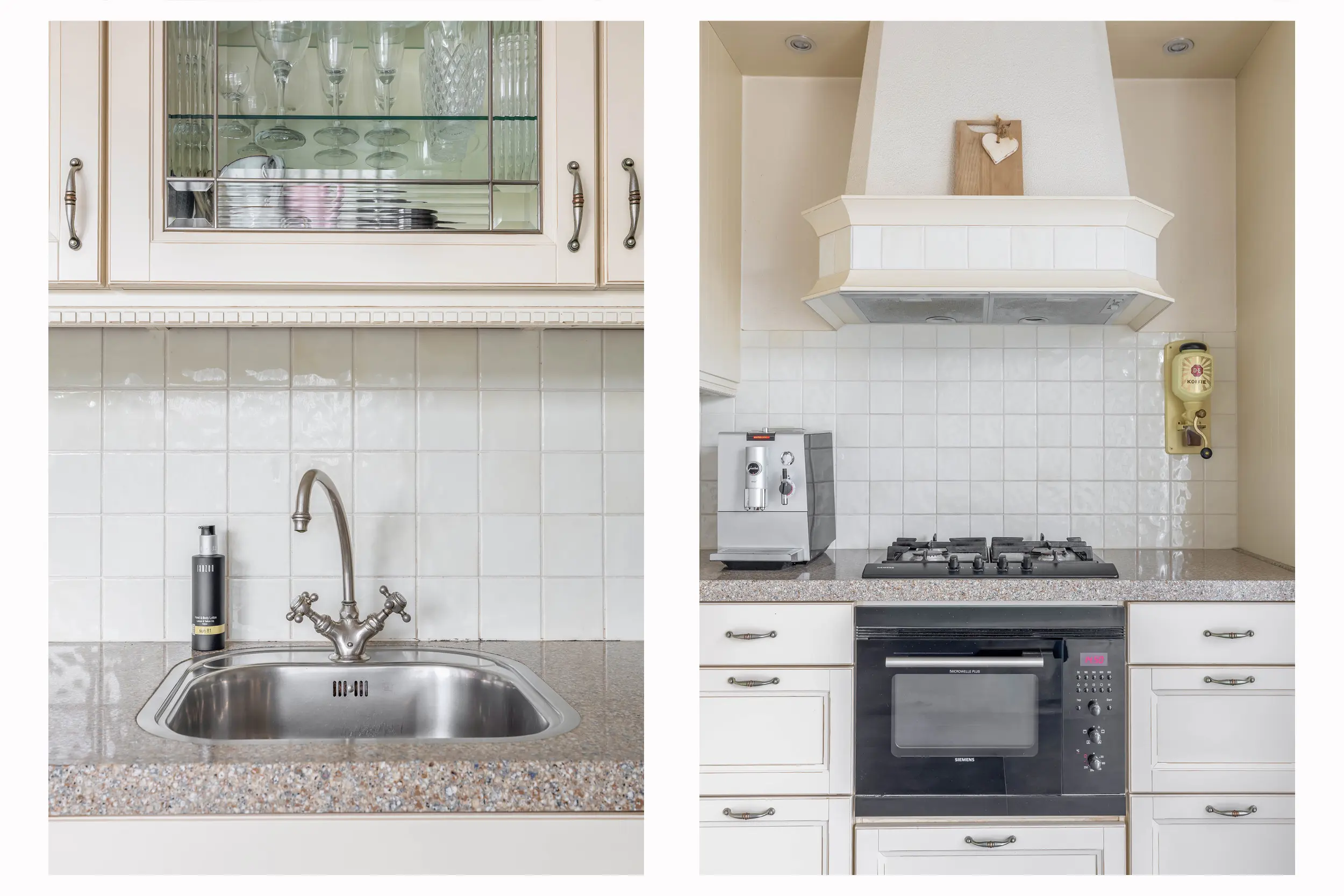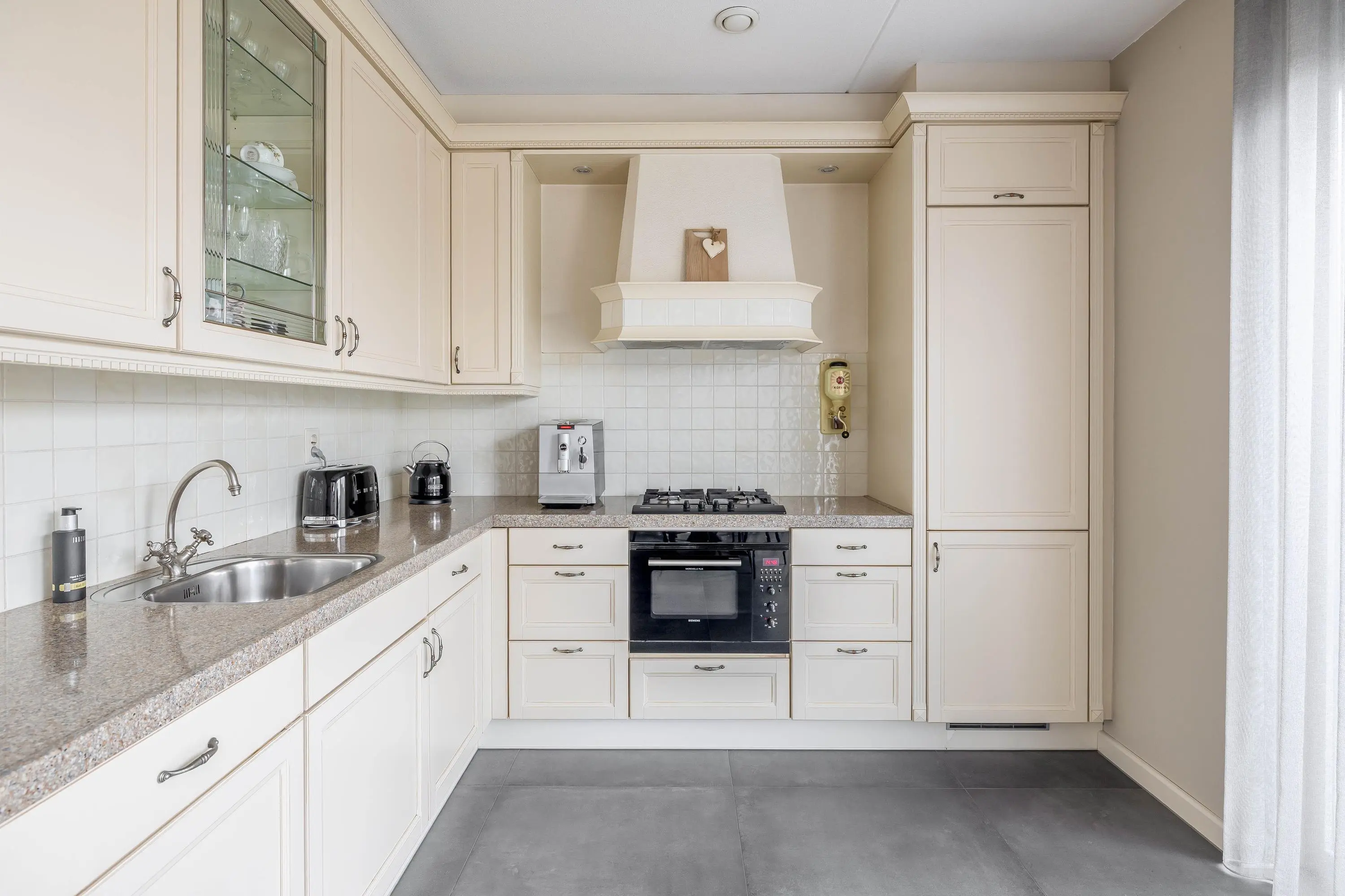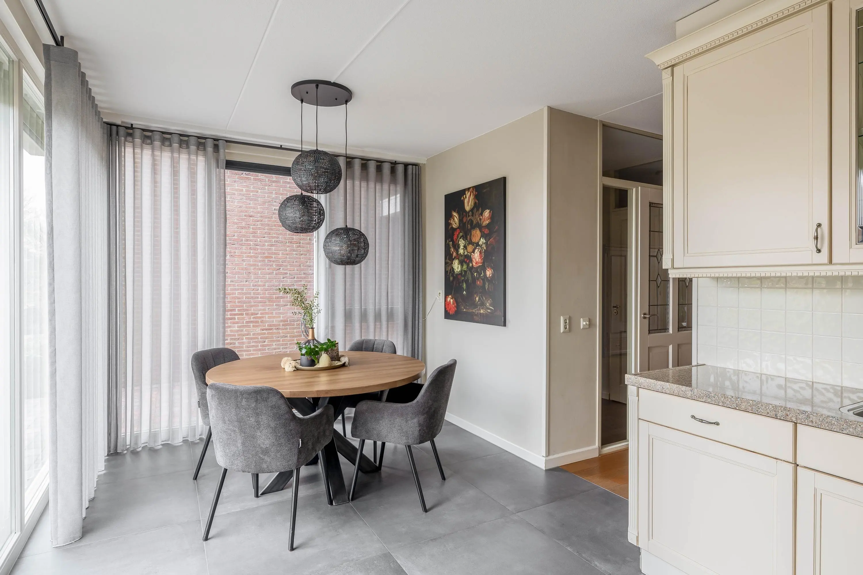 Aan de voorzijde van de woning ligt de halfopen woonkeuken met grote raampartijen en ruimte voor een eettafel. De keuken is uitgevoerd in een lichte L-opstelling en voorzien van diverse inbouwapparatuur, waaronder een gaskookplaat, afzuigkap, combi-oven, vaatwasser en koel-/vriescombinatie. Ook hier is vloerverwarming aanwezig.