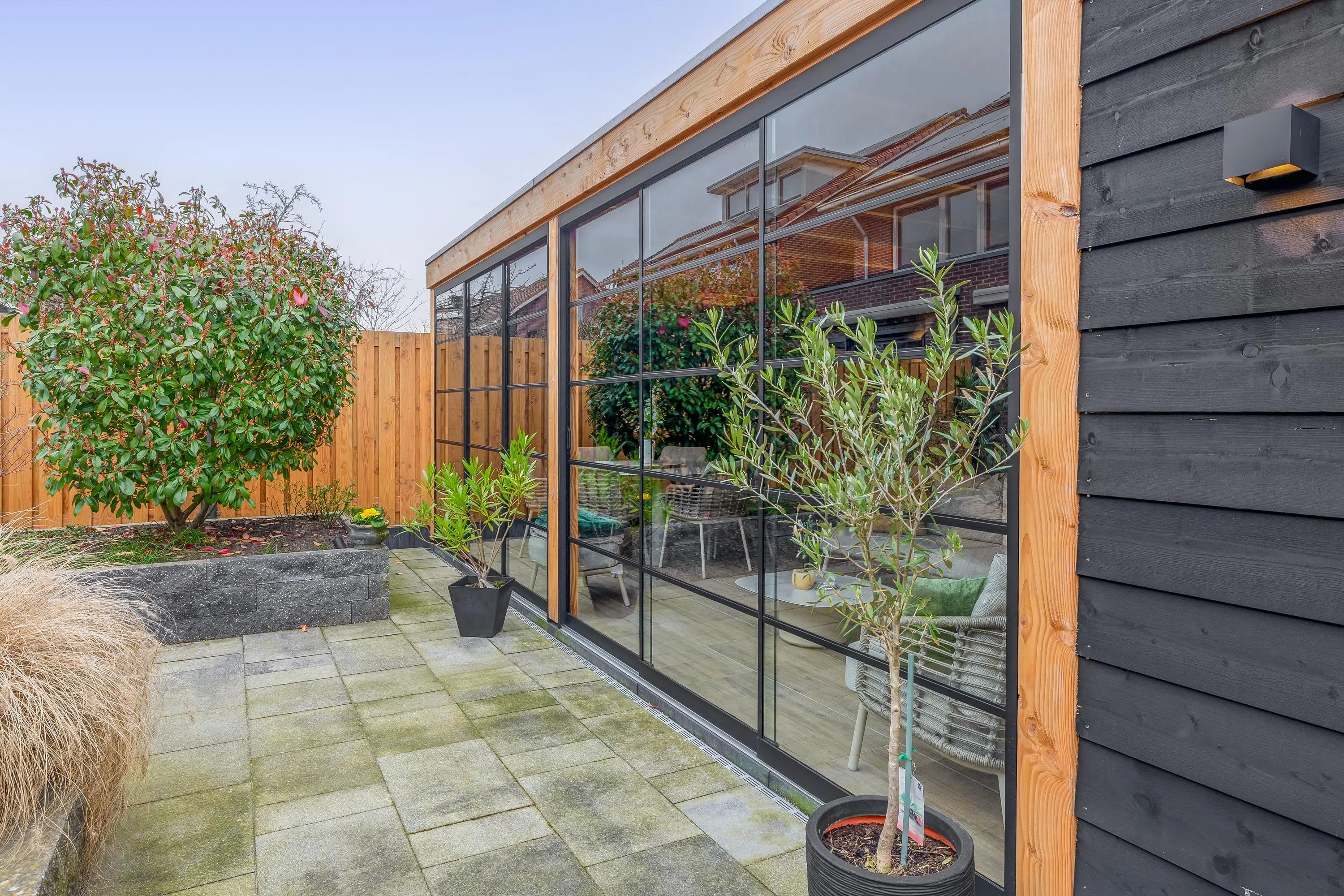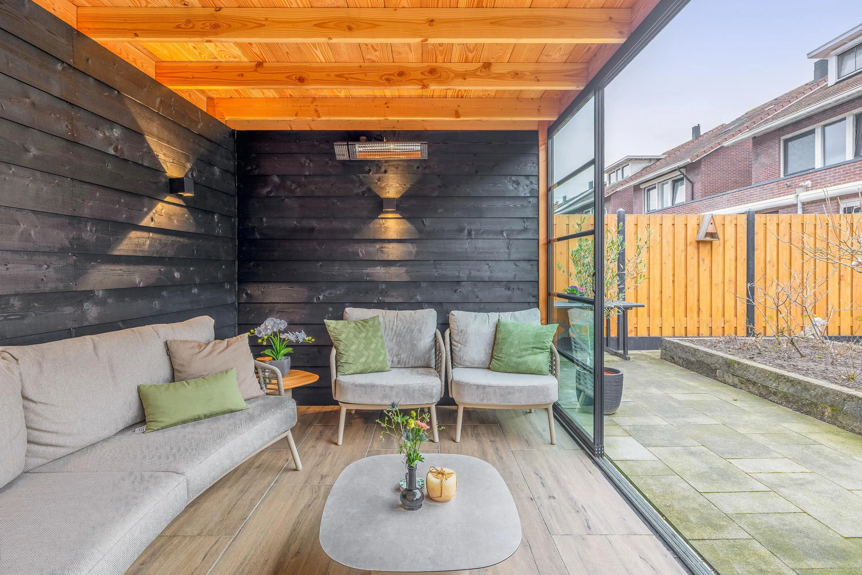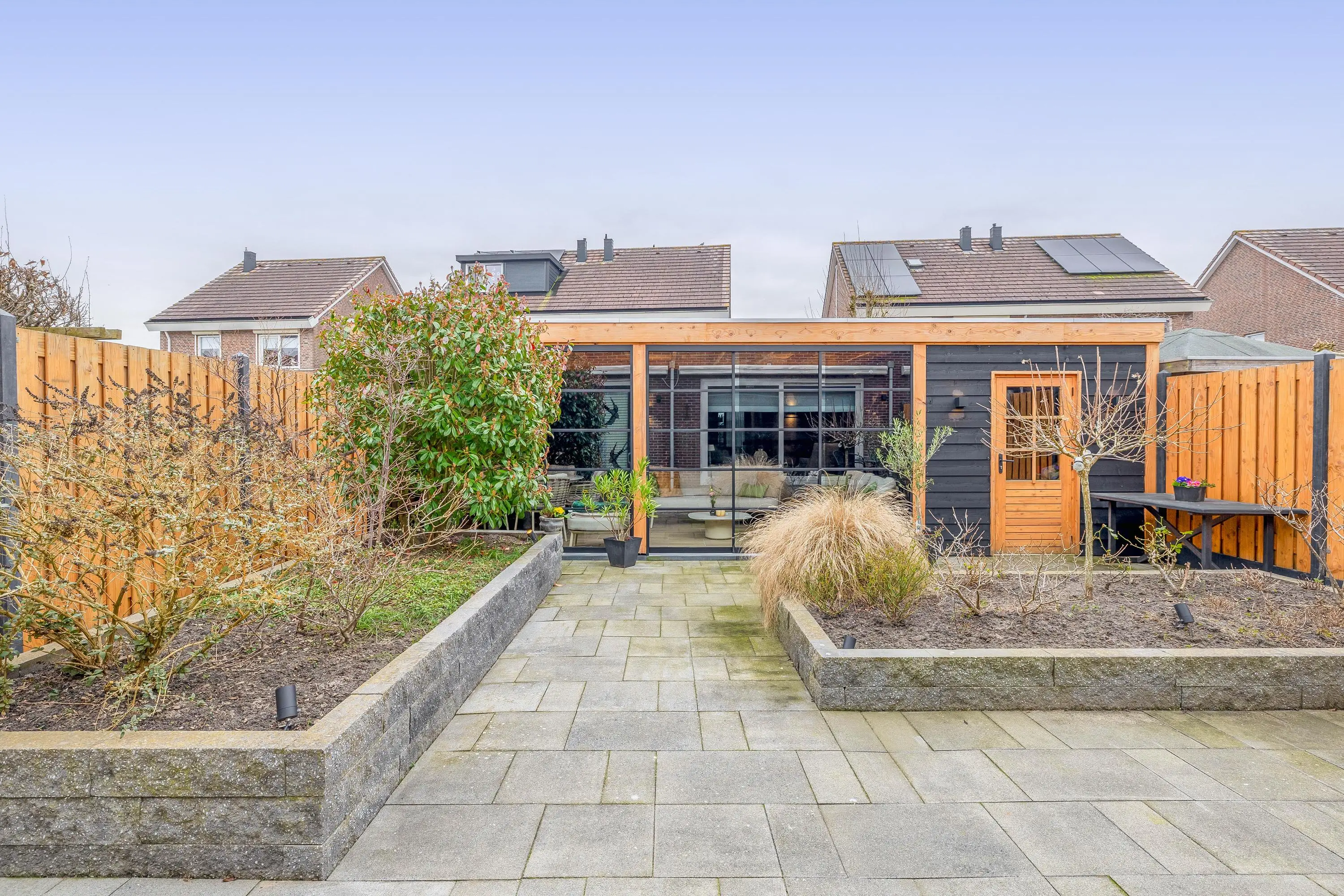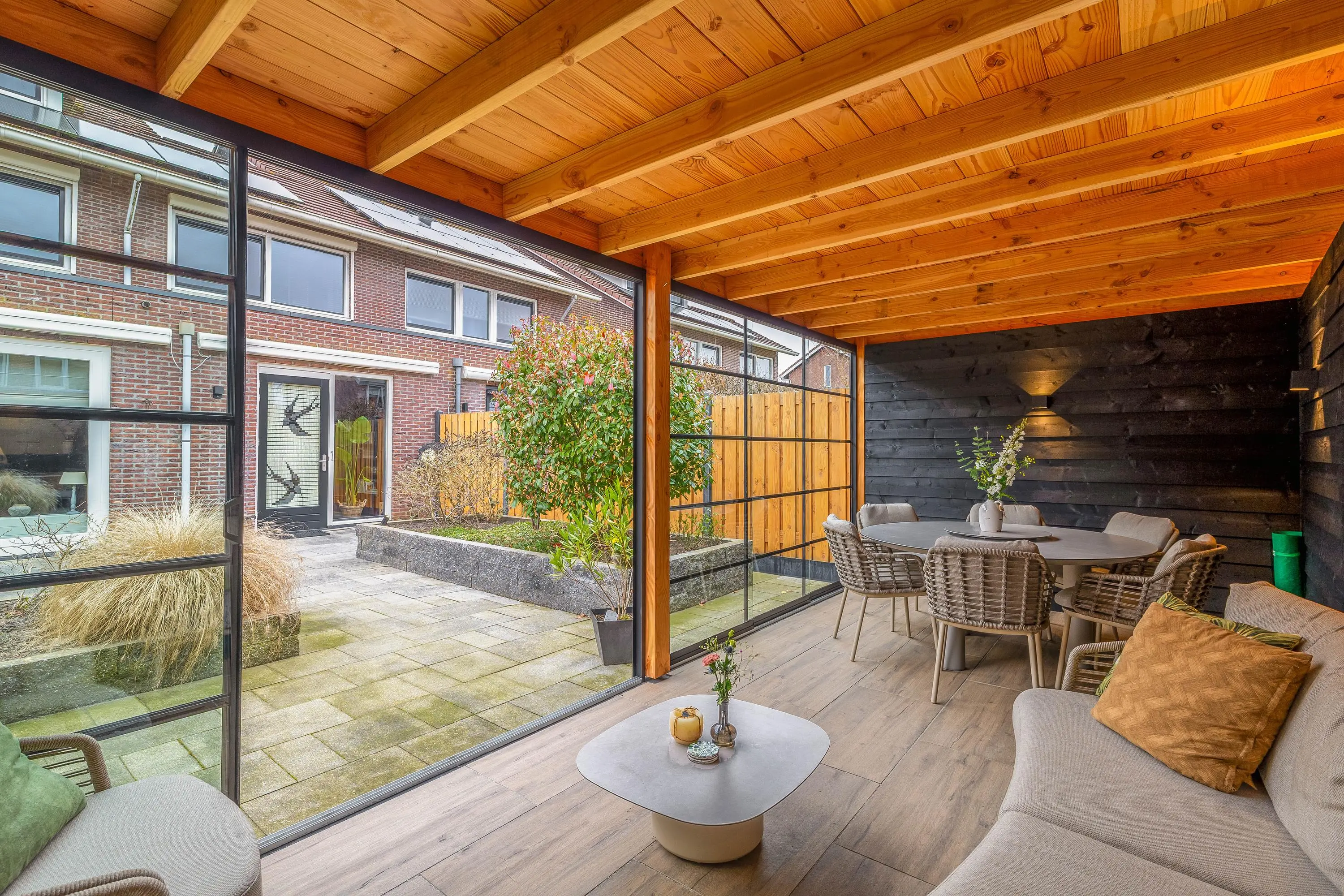 De ruime achtertuin is aangelegd met bestrating en borders en biedt volop privacy. In 2025 is een prachtige overkapping geplaatst met glazen schuifwanden, inclusief verlichting en een heater, waardoor u hier het hele jaar door comfortabel kunt zitten. De overkapping beschikt ook nog over een extra berging.