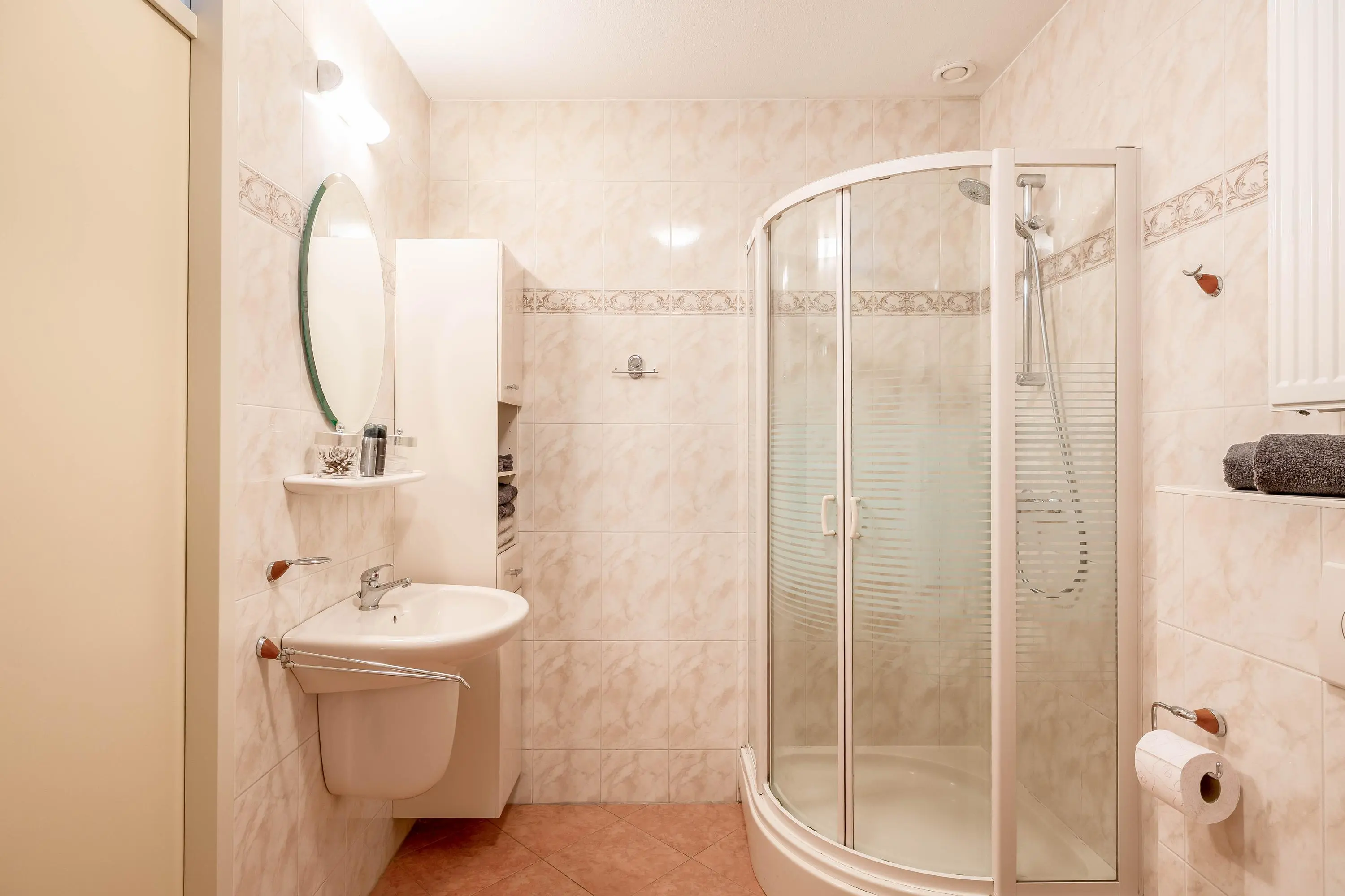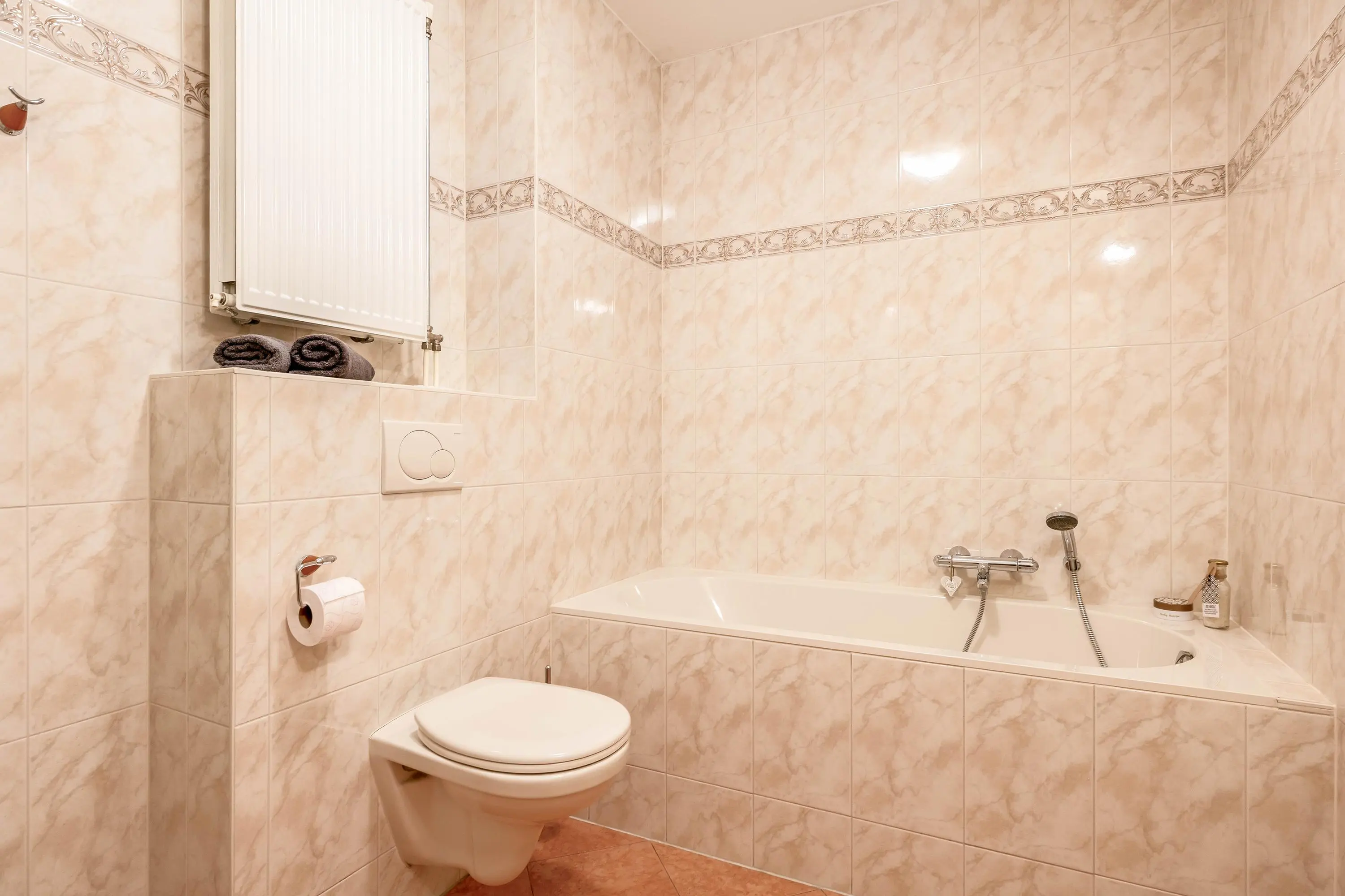De badkamer (circa 6m2) is compleet uitgevoerd met een ligbad, douchecabine, hangend toilet en wastafel.