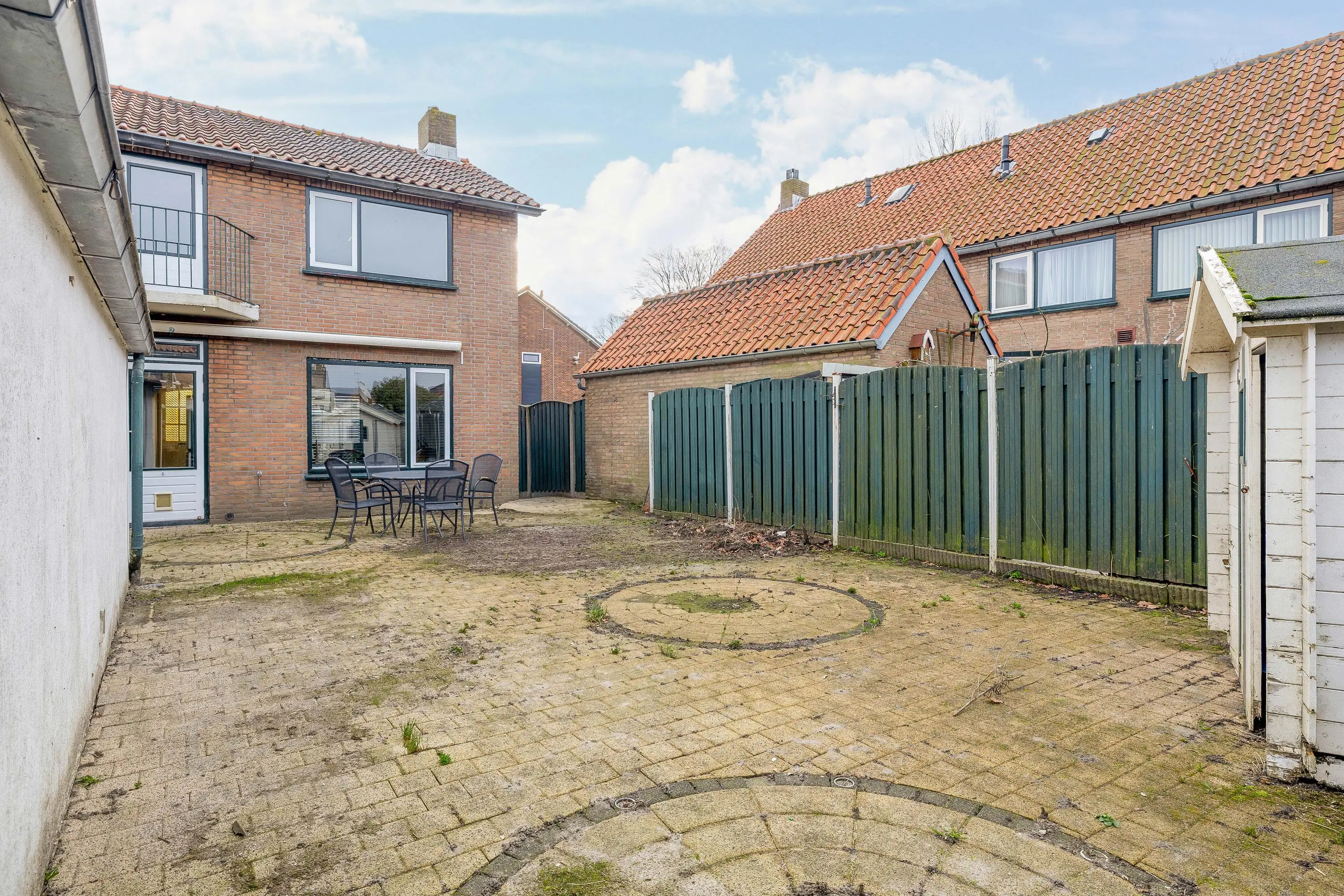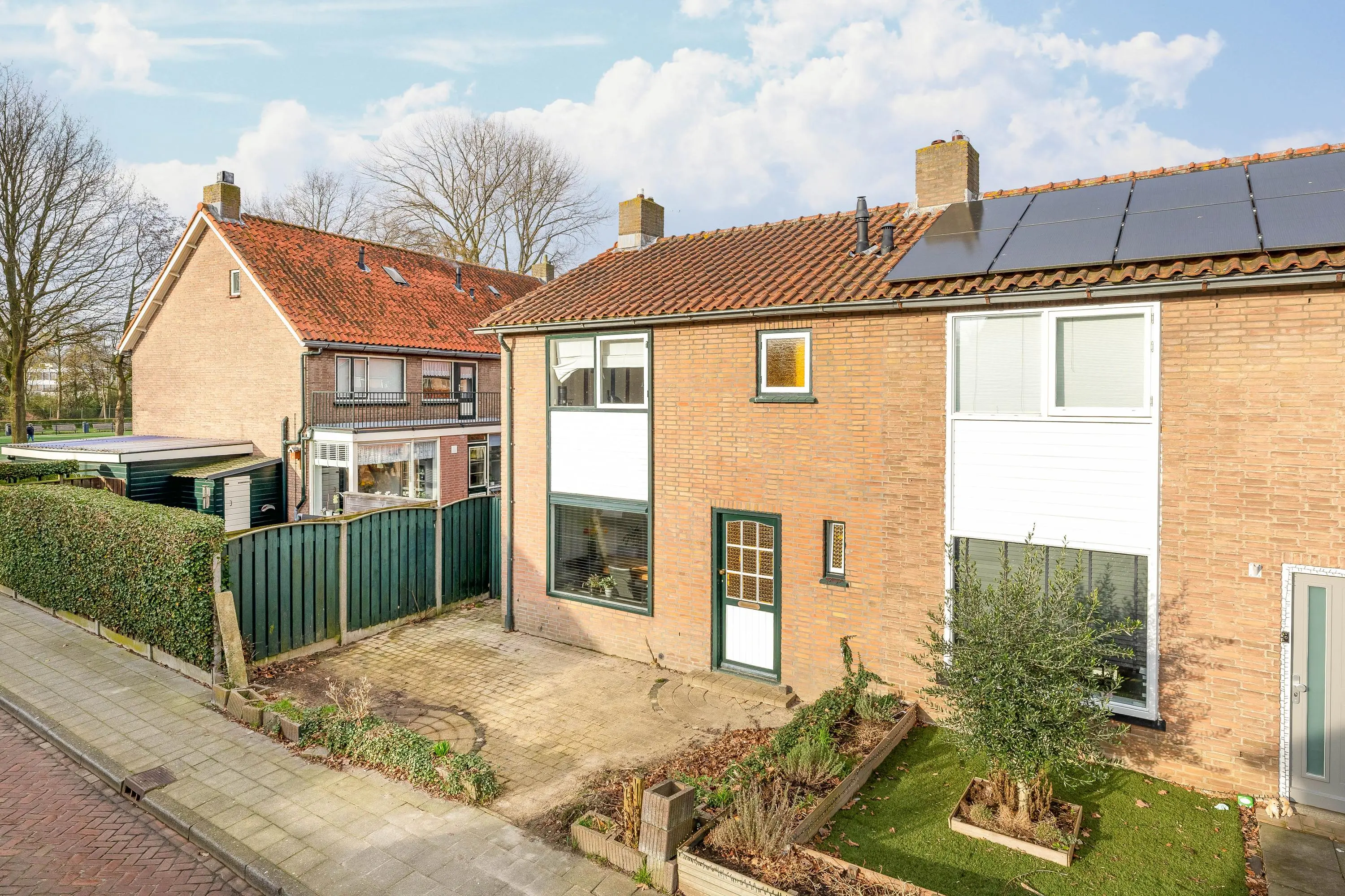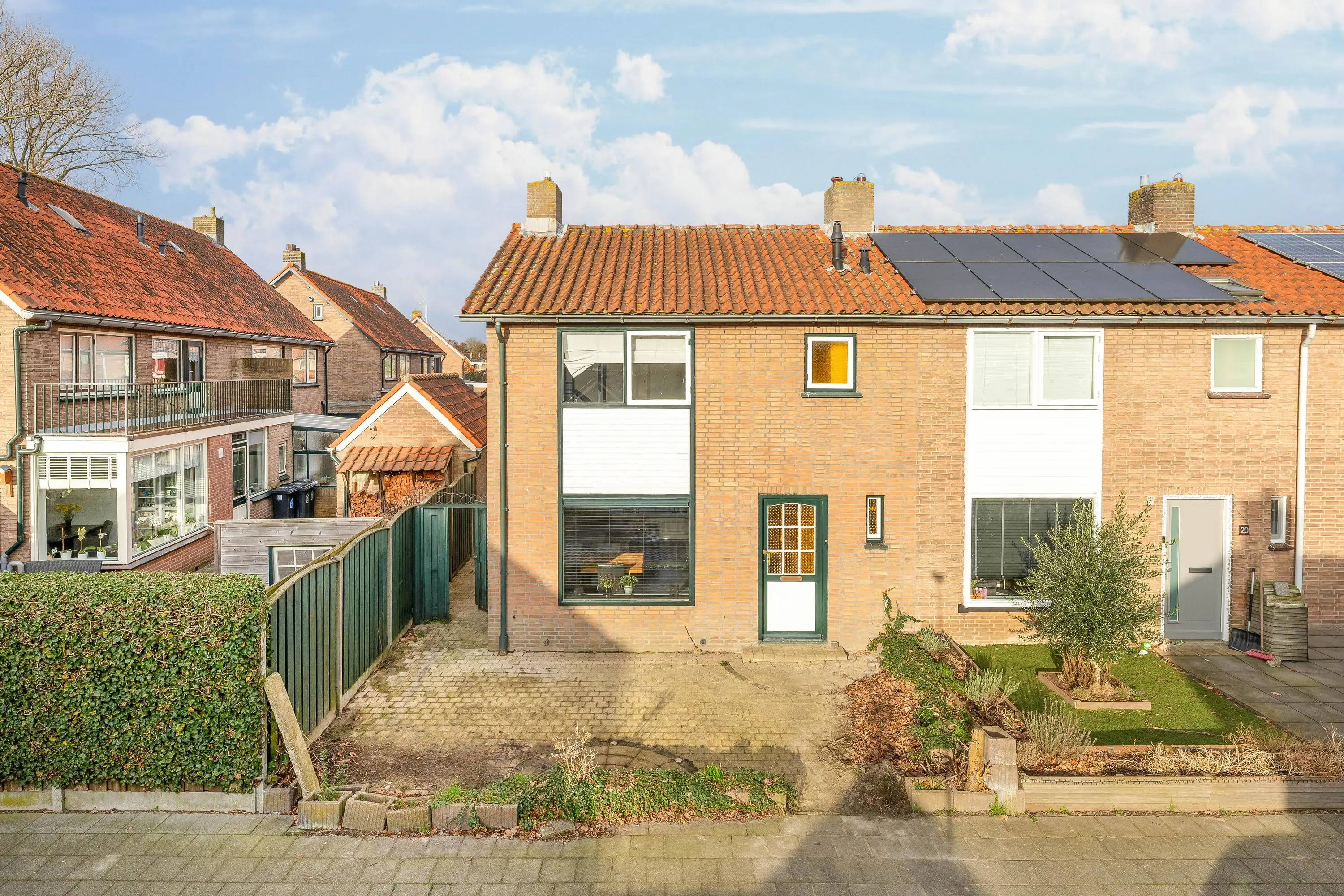 De voortuin is volledig betegeld en via de zij tuin is er een gemakkelijke doorgang naar de achtertuin.