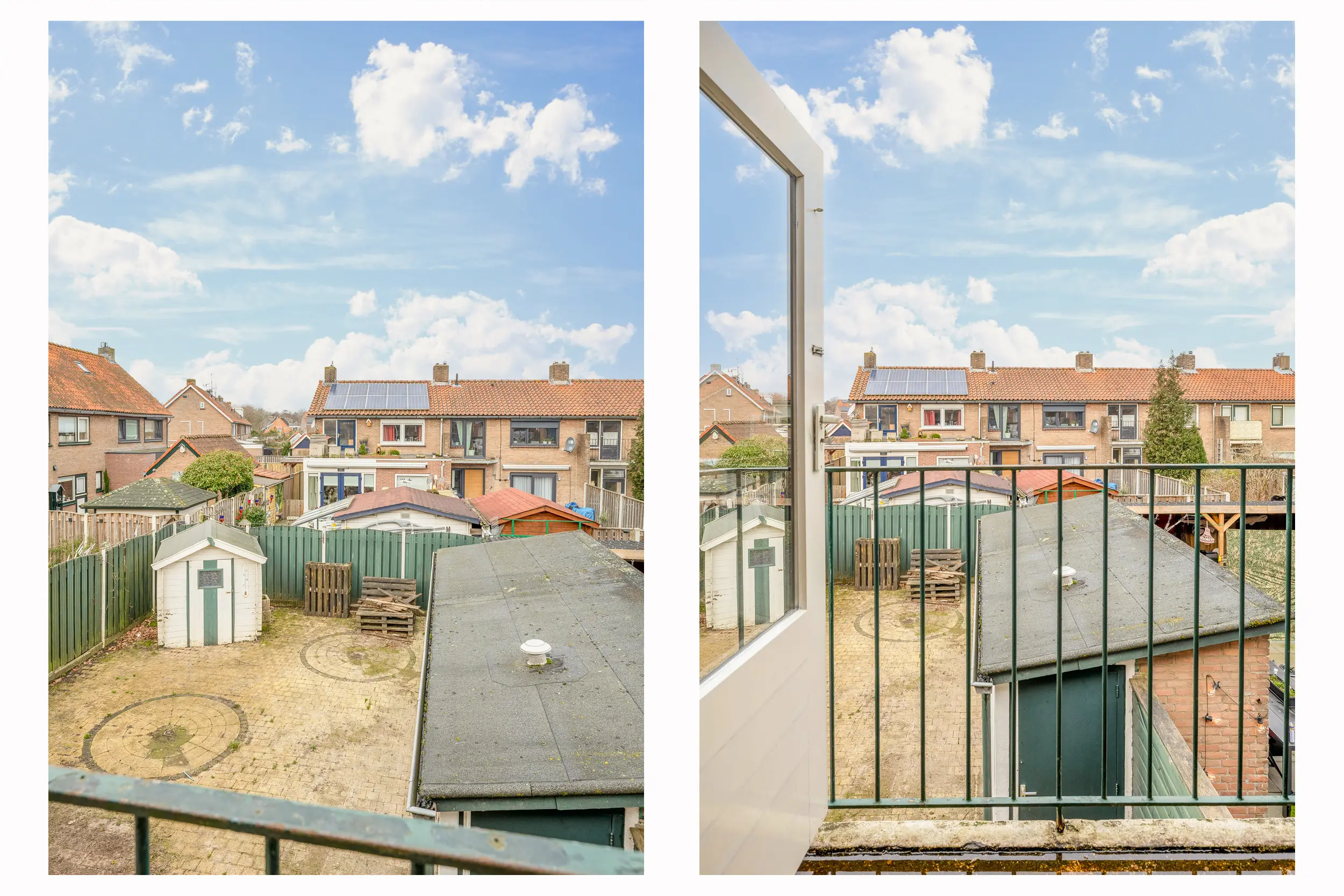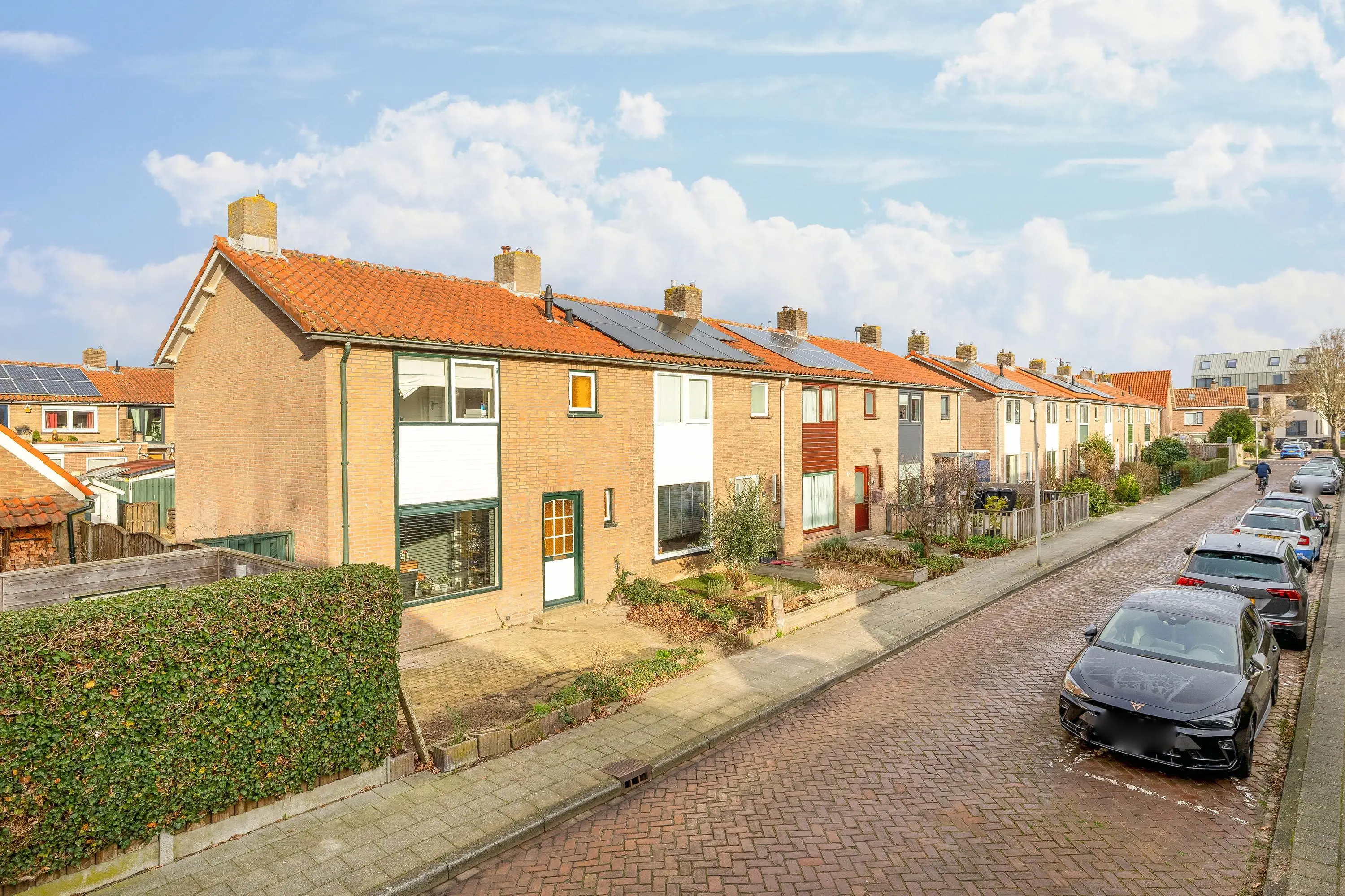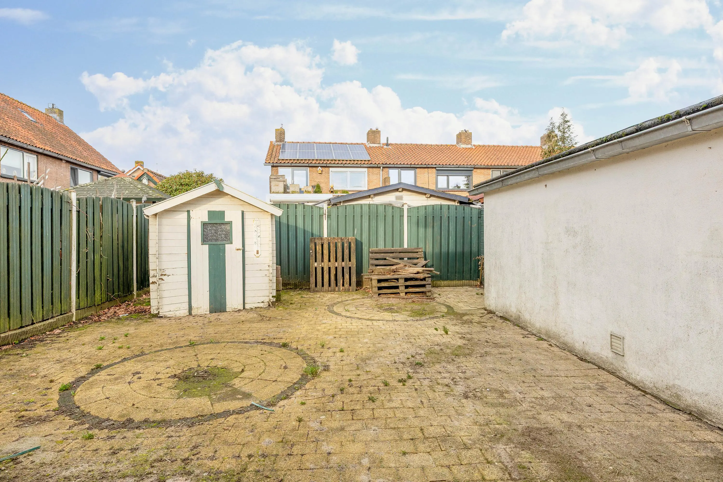 De voortuin is volledig betegeld en via de zij tuin is er een gemakkelijke doorgang naar de achtertuin.