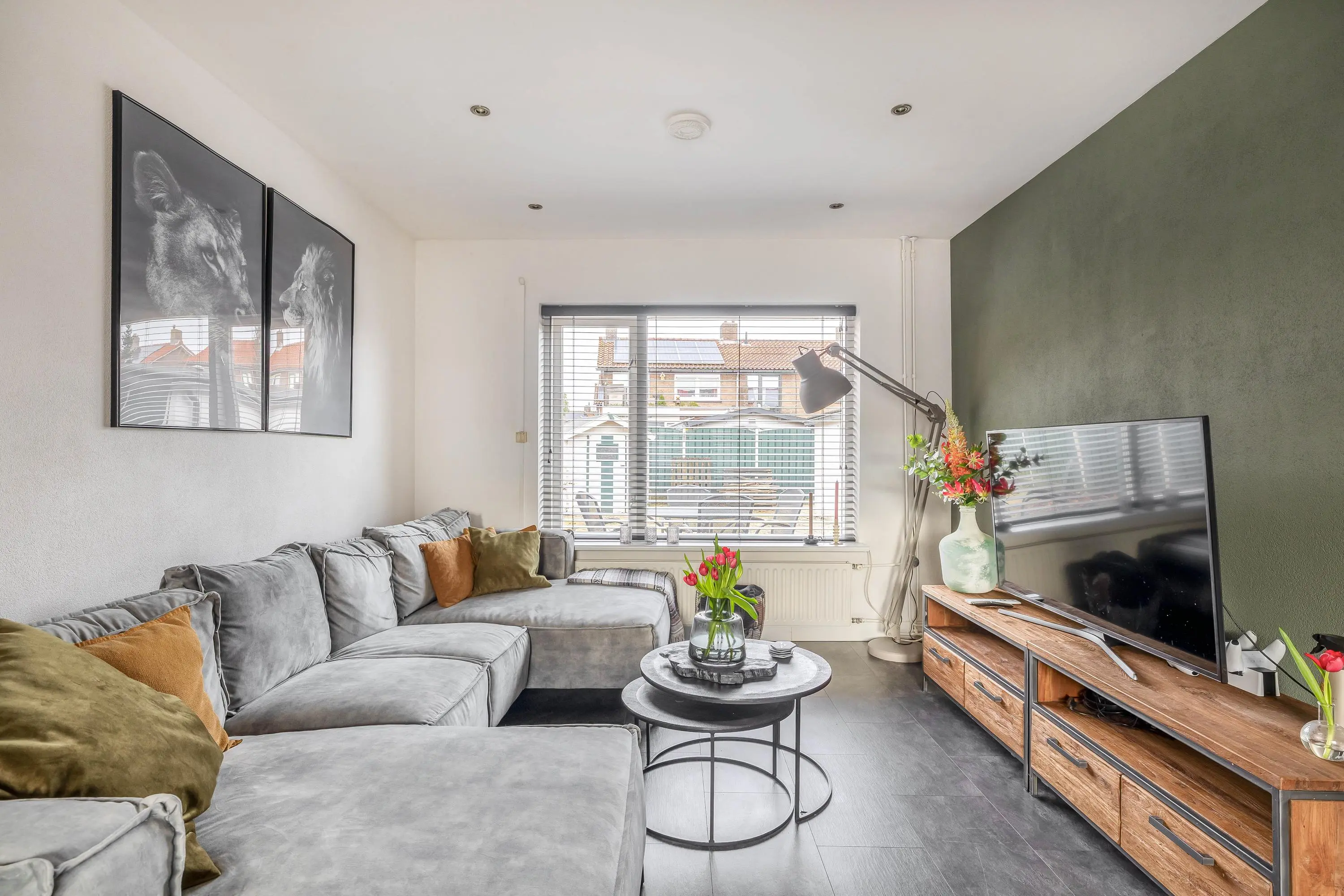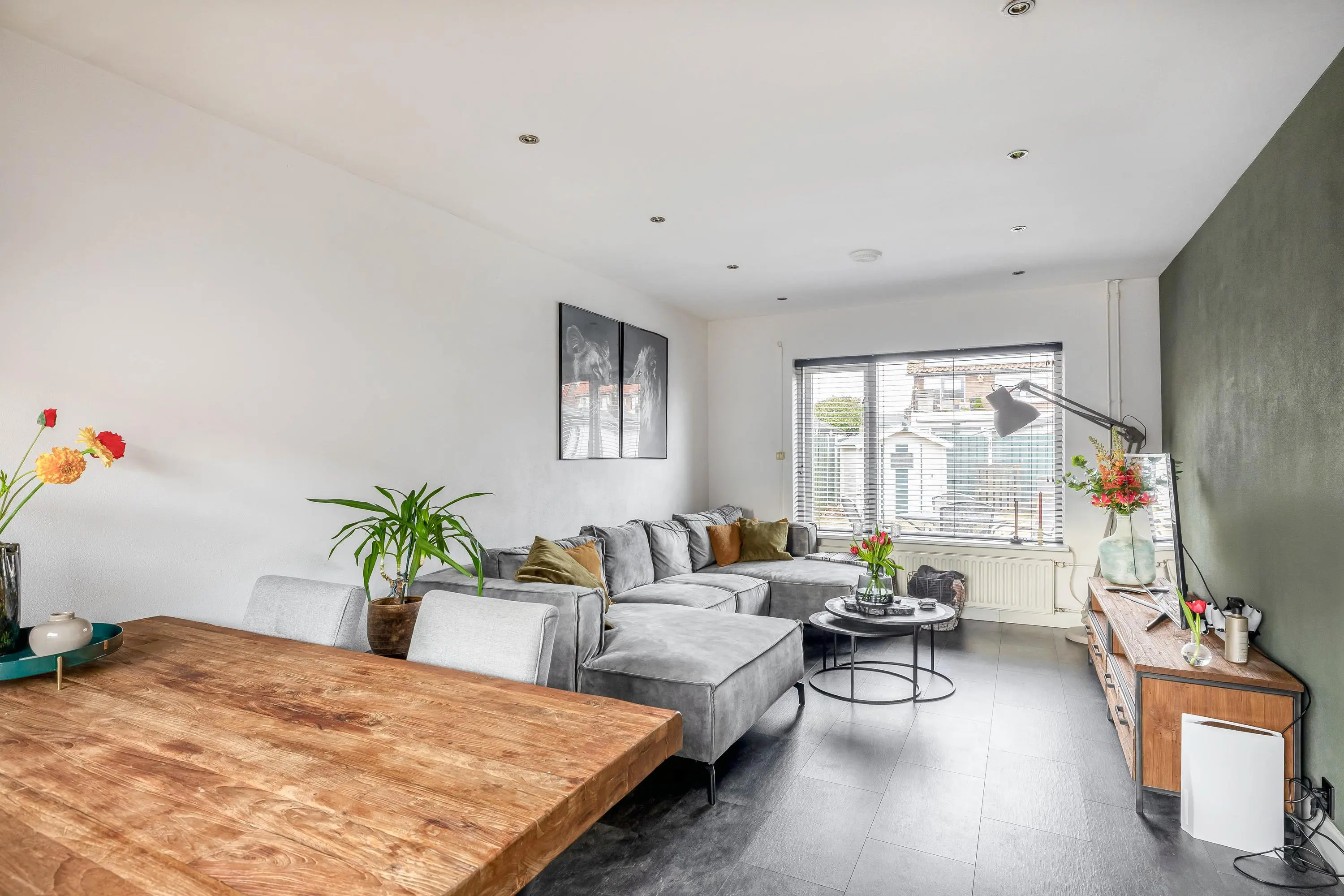 De living heeft een oppervlakte van circa 22m², waardoor er voldoende ruimte is om een gezellige zit- en eethoek te creëren. De ruimte is afgewerkt met in het plafond geïntegreerde verlichting. Dankzij de ramen aan zowel de voor- als achterzijde profiteert de woonkamer van prettig daglicht. Aan de achterzijde is een zonnescherm aanwezig, waardoor de lichtinval eenvoudig te regelen is.