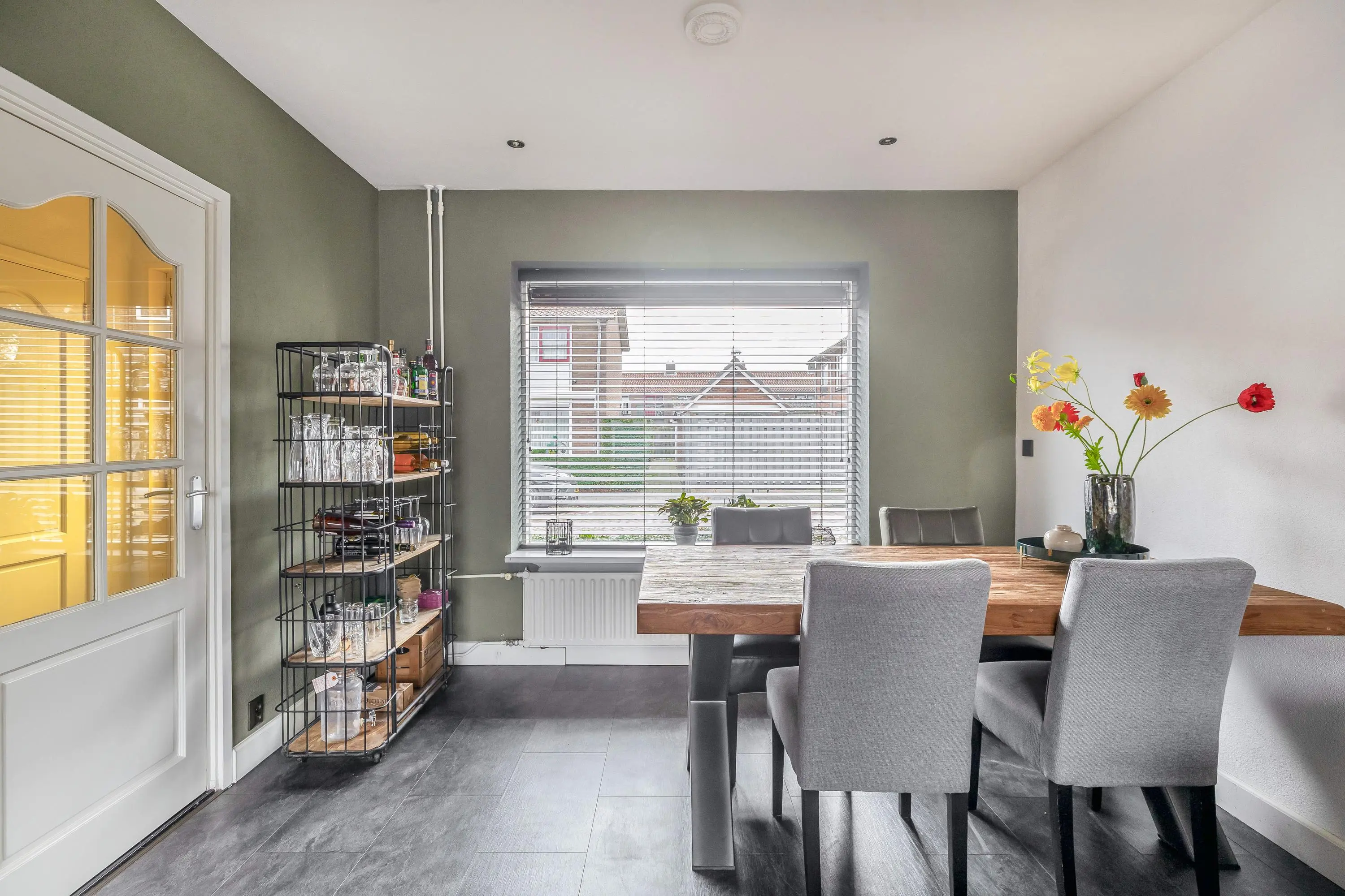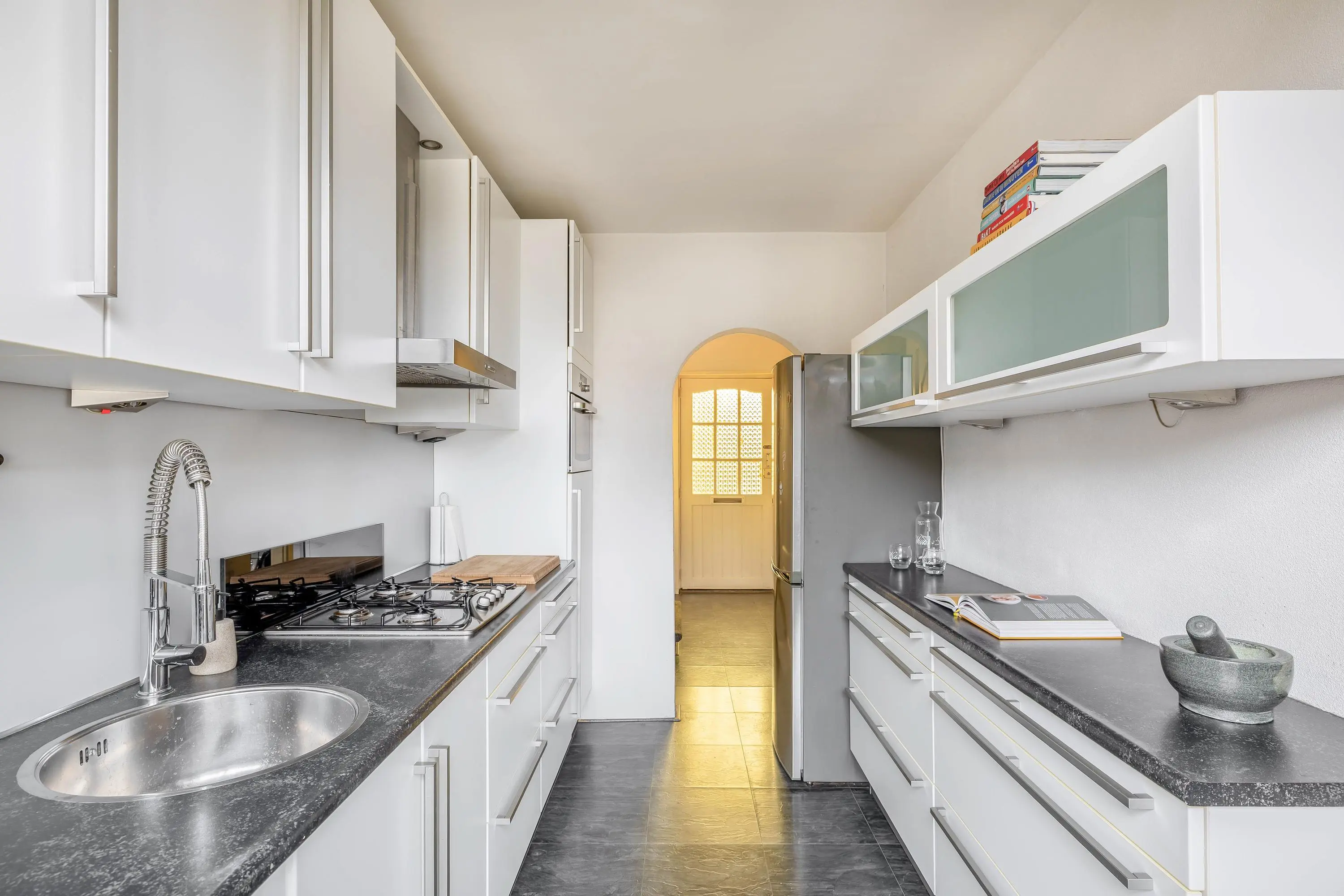 De keuken heeft een nette afwerking en is uitgerust met een 4-pits gaskookplaat, afzuigkap, combi-oven, vaatwasser en een losse koel-/vriescombinatie. Daarnaast beschikt de keuken over voldoende opbergruimte. Via een enkele deur is er toegang tot de ruime achtertuin.