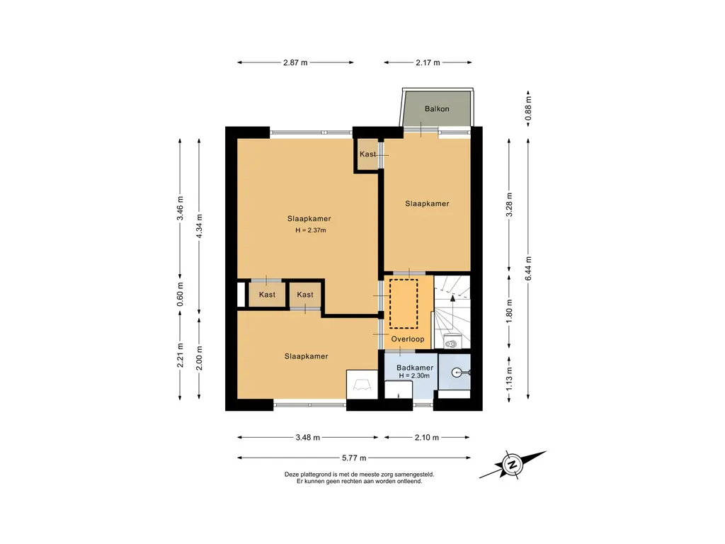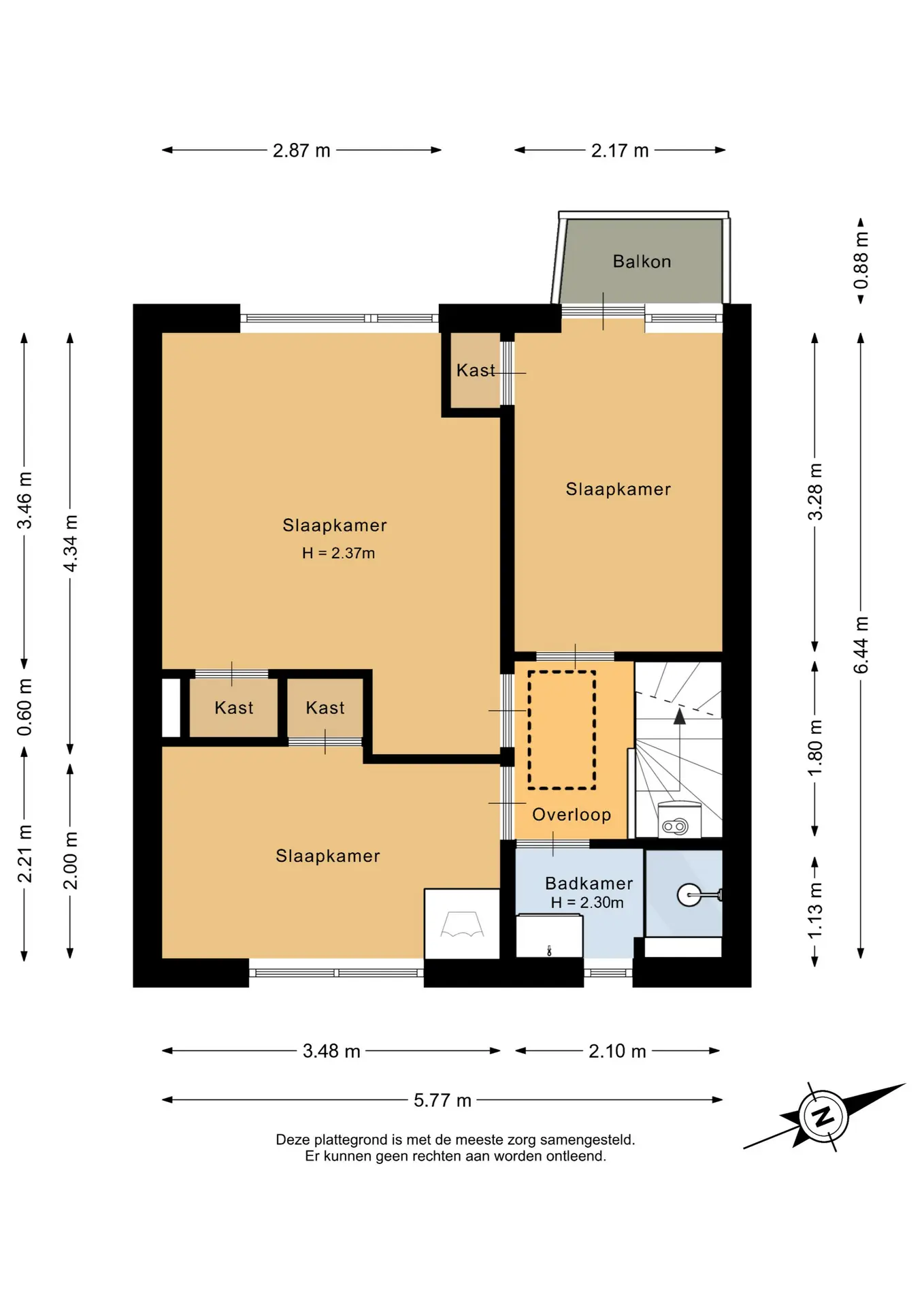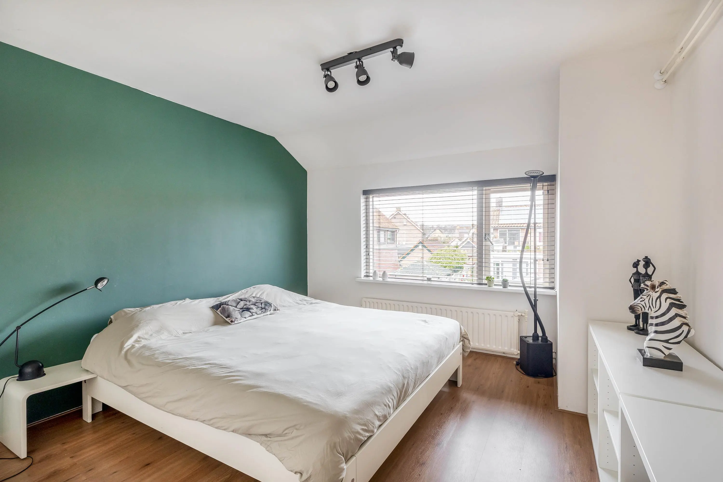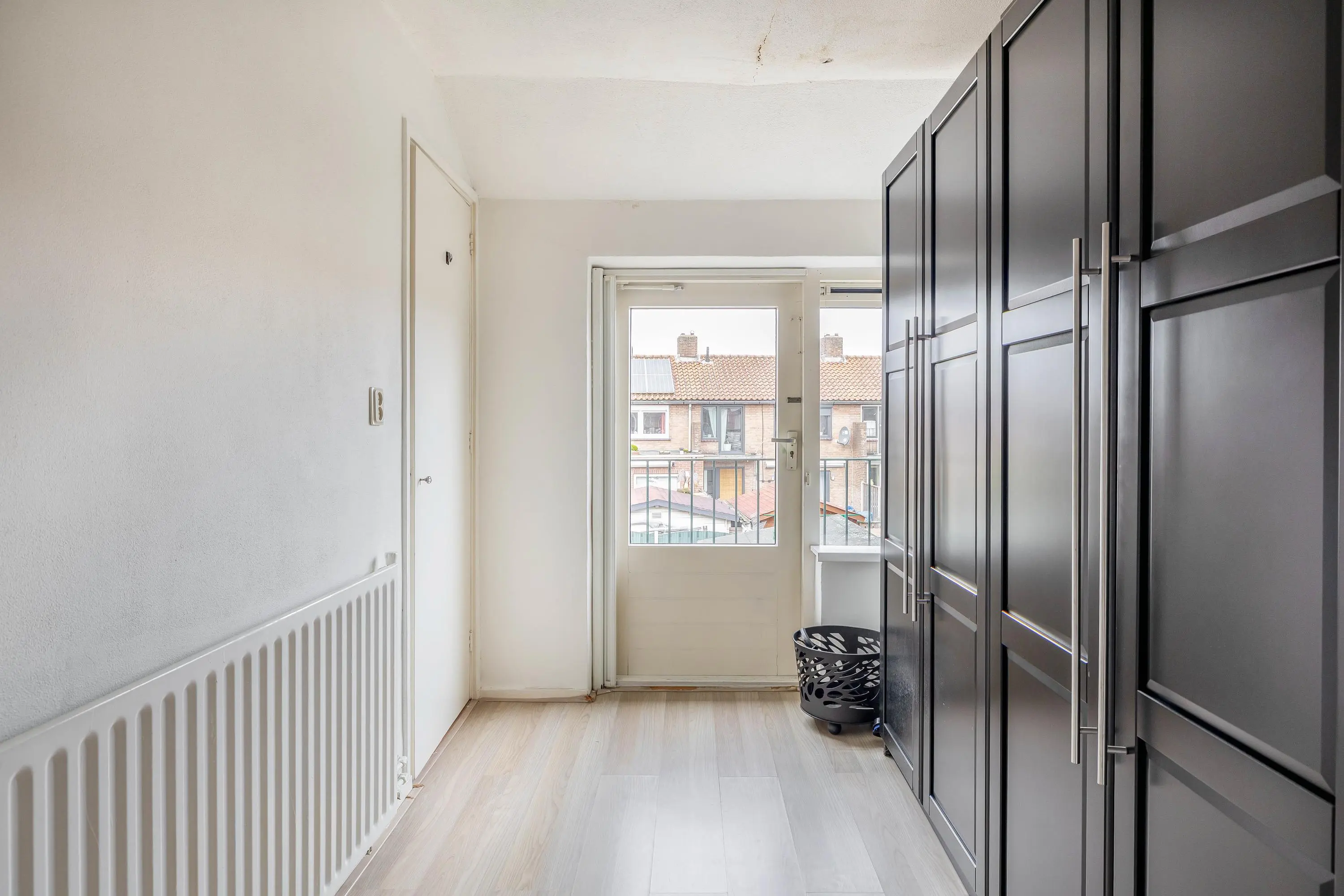De hoofdslaapkamer ligt aan de achterzijde van de woning en heeft een oppervlakte van circa 12,5m². De tweede slaapkamer bevindt zich aan de voorzijde en heeft een oppervlakte van circa 7m². Hier bevinden zich tevens de aansluitingen voor de wasmachine. De derde slaapkamer is eveneens aan de achterzijde gelegen, meet circa 7m² en beschikt over een fijn balkon op het zuidwesten. Alle kamers zijn afgewerkt met een laminaatvloer en beschikken over een praktische inbouwkast.