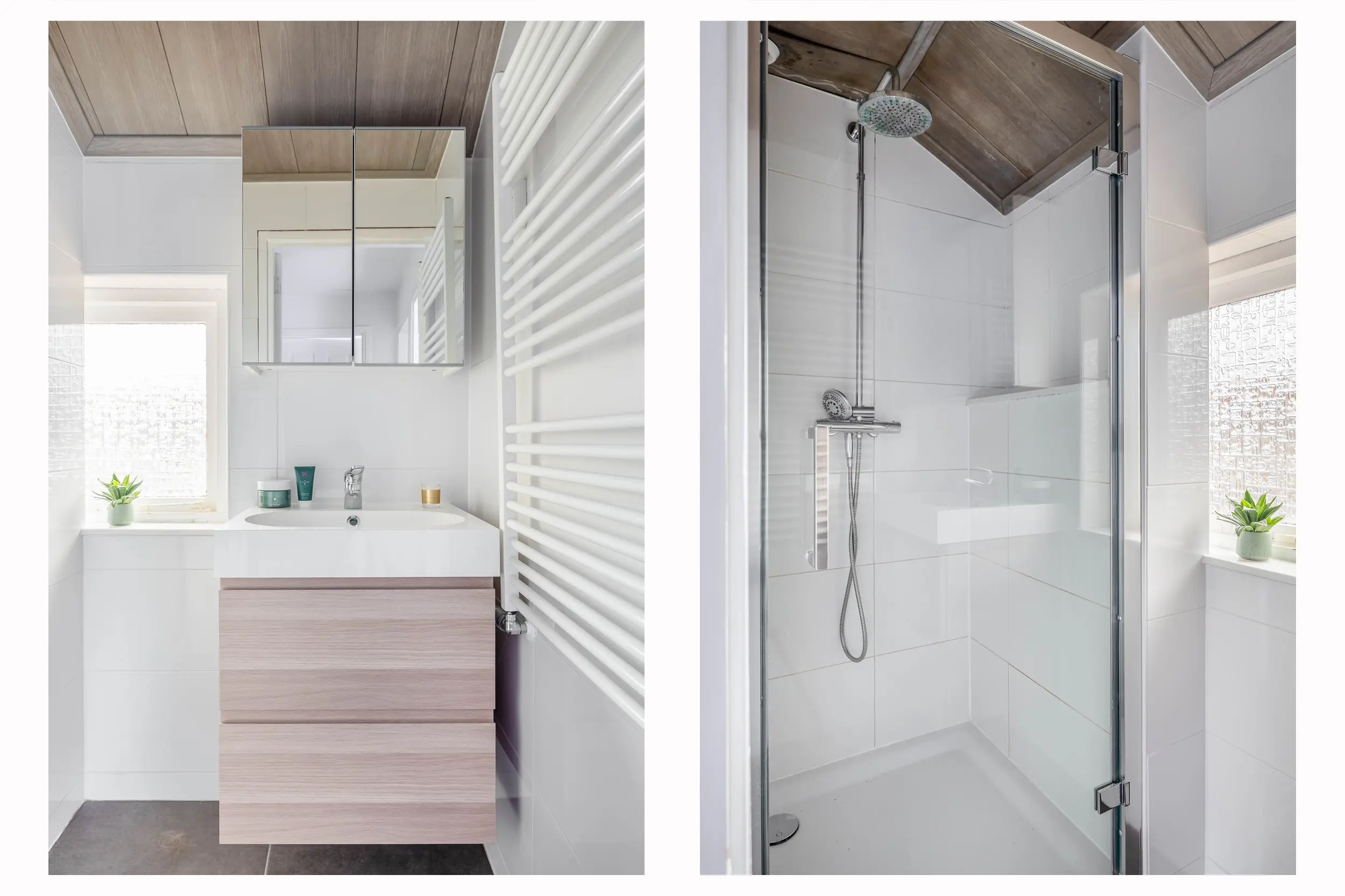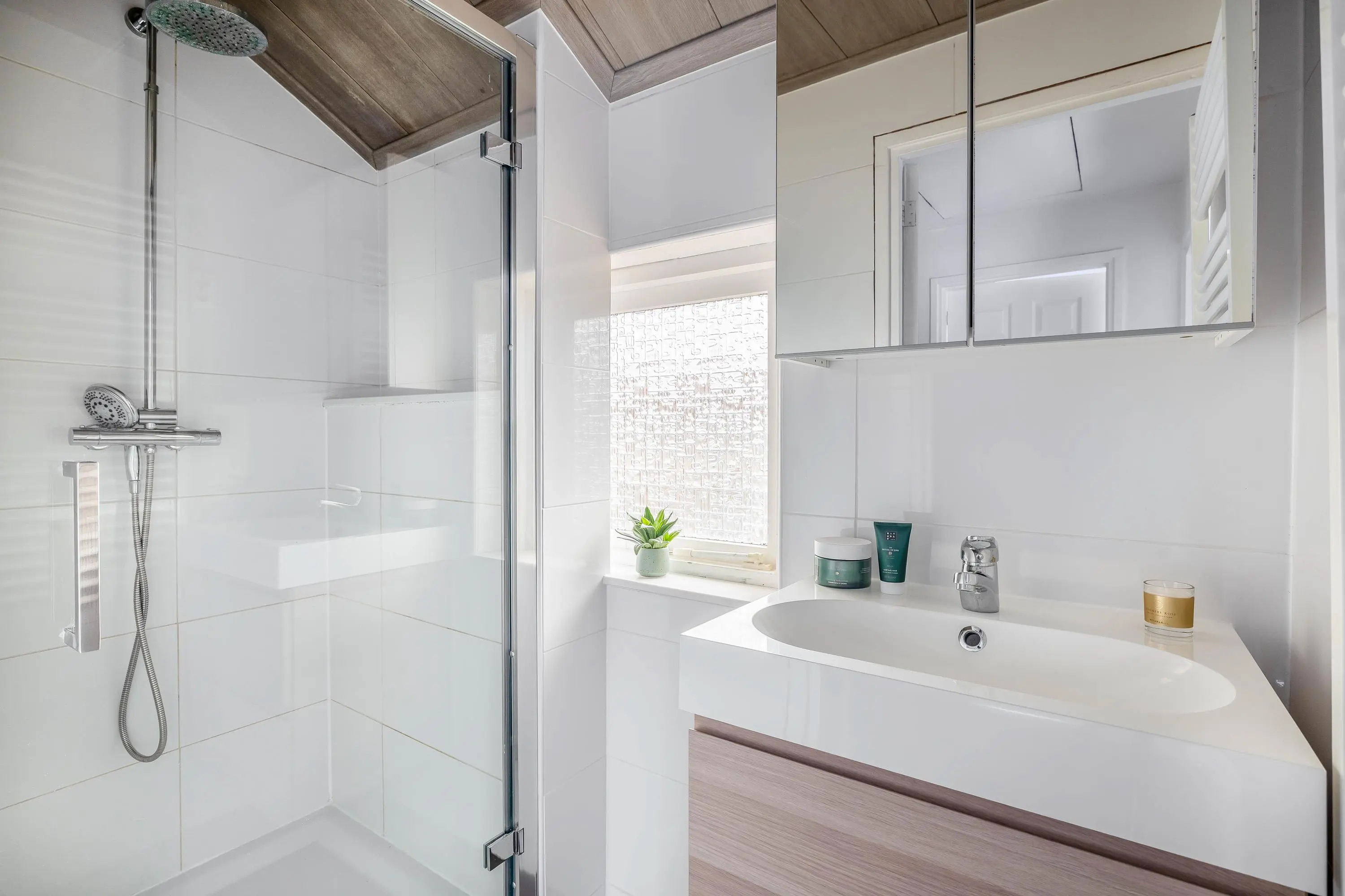 De badkamer is volledig betegeld en strak afgewerkt, met een douche, wastafelmeubel en designradiator. Het aanwezige raam zorgt voor prettige natuurlijke ventilatie.