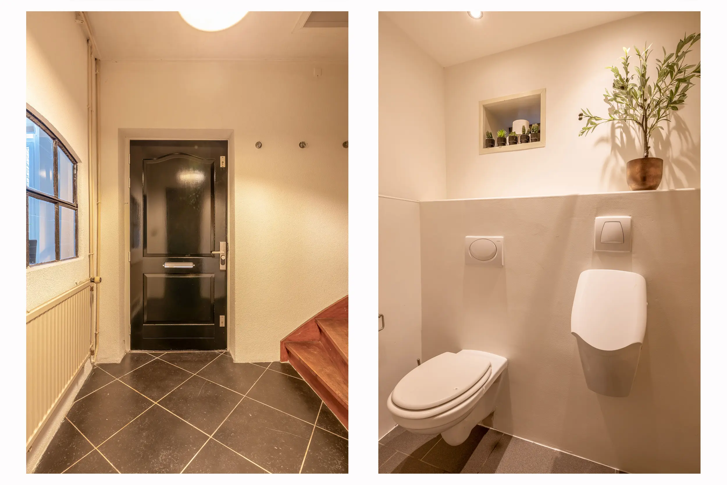 Bij binnenkomst komt u in de hal met een nette, betegelde vloer. Hier bevindt zich de vaste trap naar de eerste verdieping, inclusief handige trapkast. Via een tweede halletje bereikt u het separate toilet, voorzien van een hangend toilet, urinoir en fonteintje. Ook is hier de opstelplaats van de HR-combiketel te vinden. Vanuit de eerste hal heeft u toegang tot het leefgedeelte.