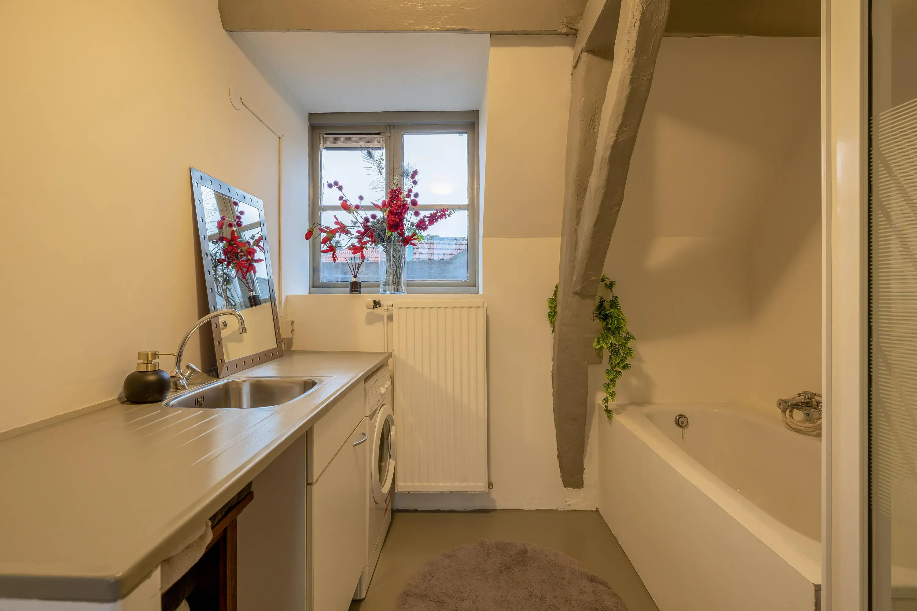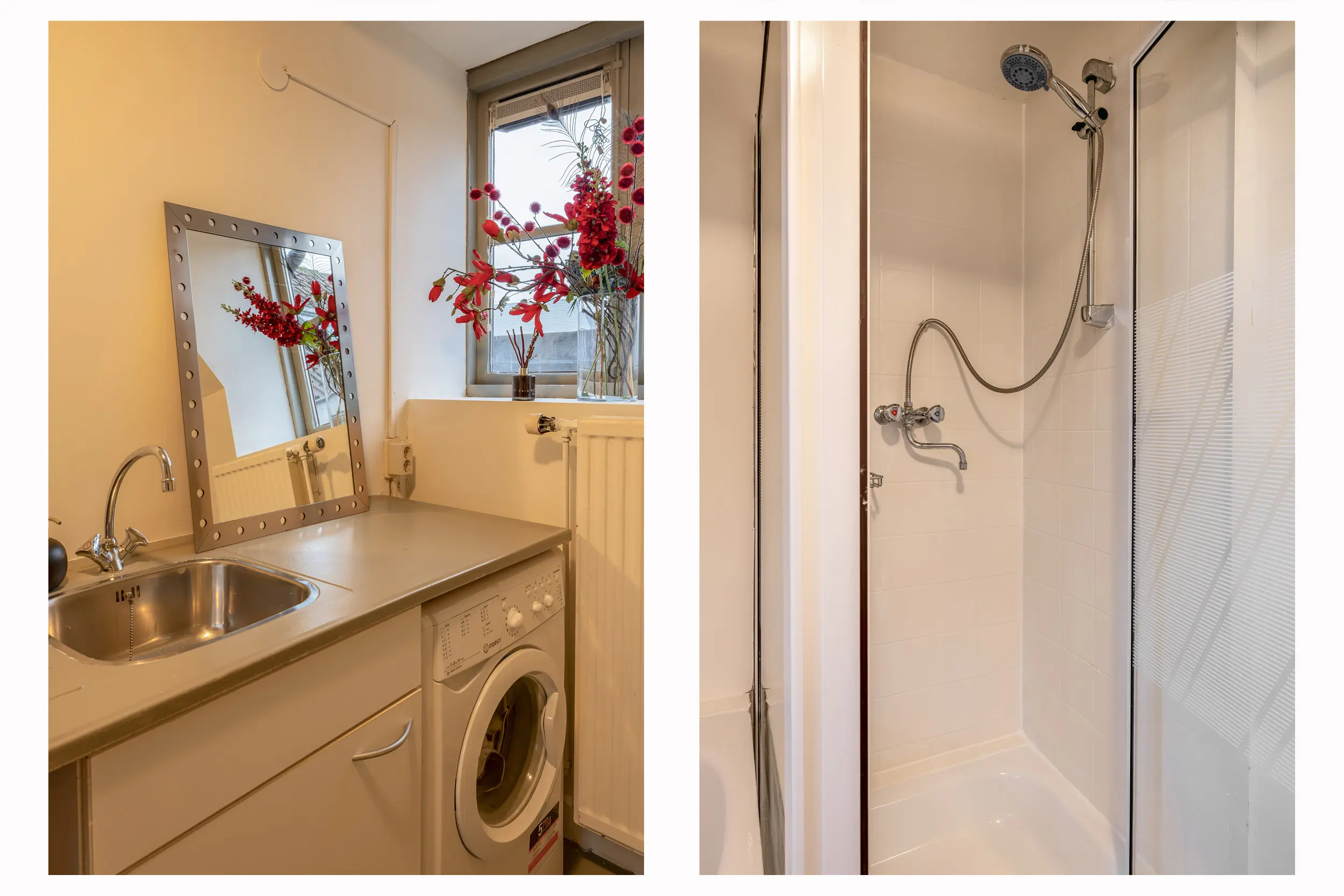 De tweede slaapkamer bevindt zich aan de achterzijde van de woning en is met circa 39m² bijzonder ruim. De kamer beschikt over een praktische inbouwkast, wat zorgt voor extra opbergruimte. In het voorste gedeelte van deze kamer zijn de badkamer en een separaat toilet gesitueerd. De badkamer is volledig betegeld en uitgerust met een ligbad, douche en wastafel. Indien gewenst is de badkamer naar eigen smaak te moderniseren.