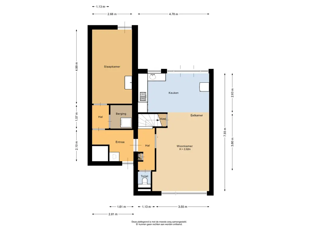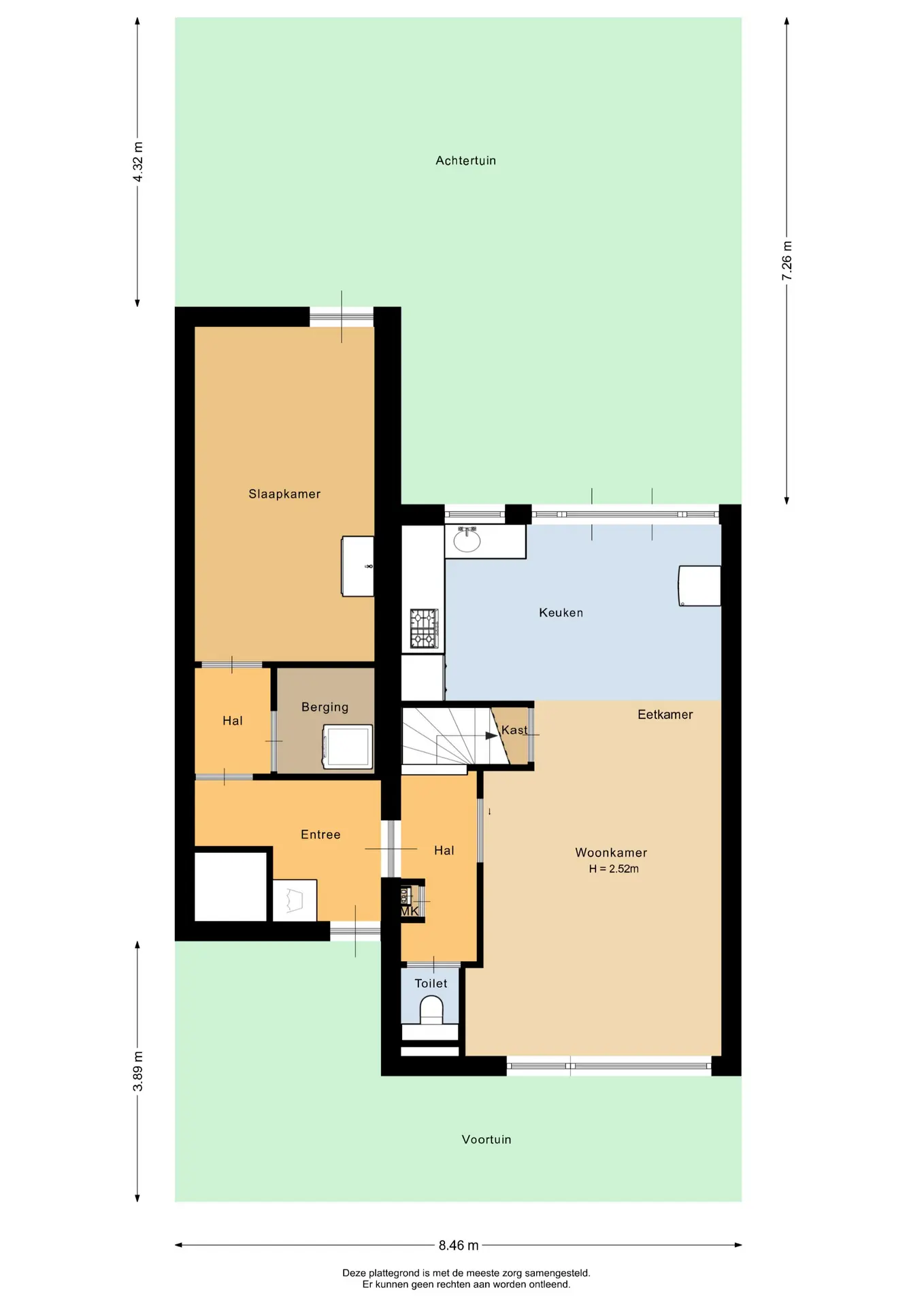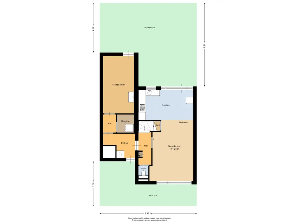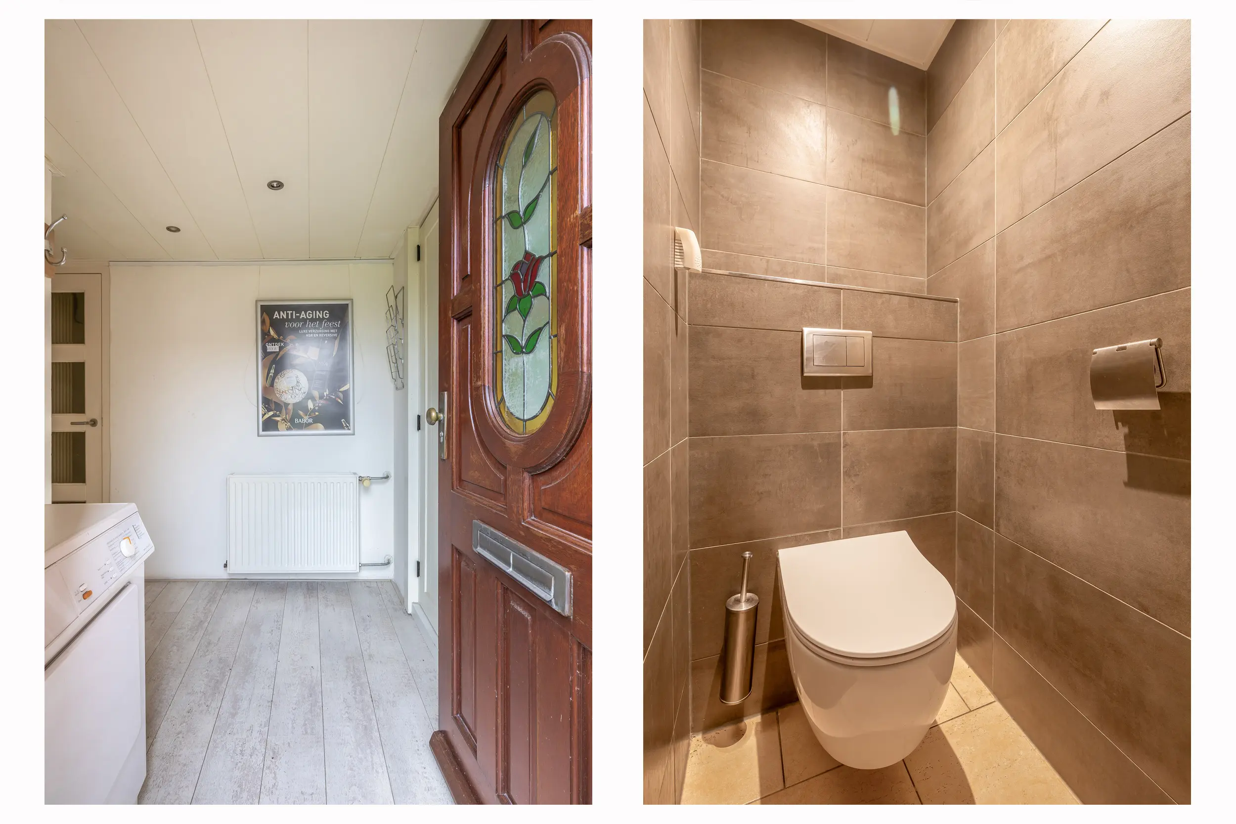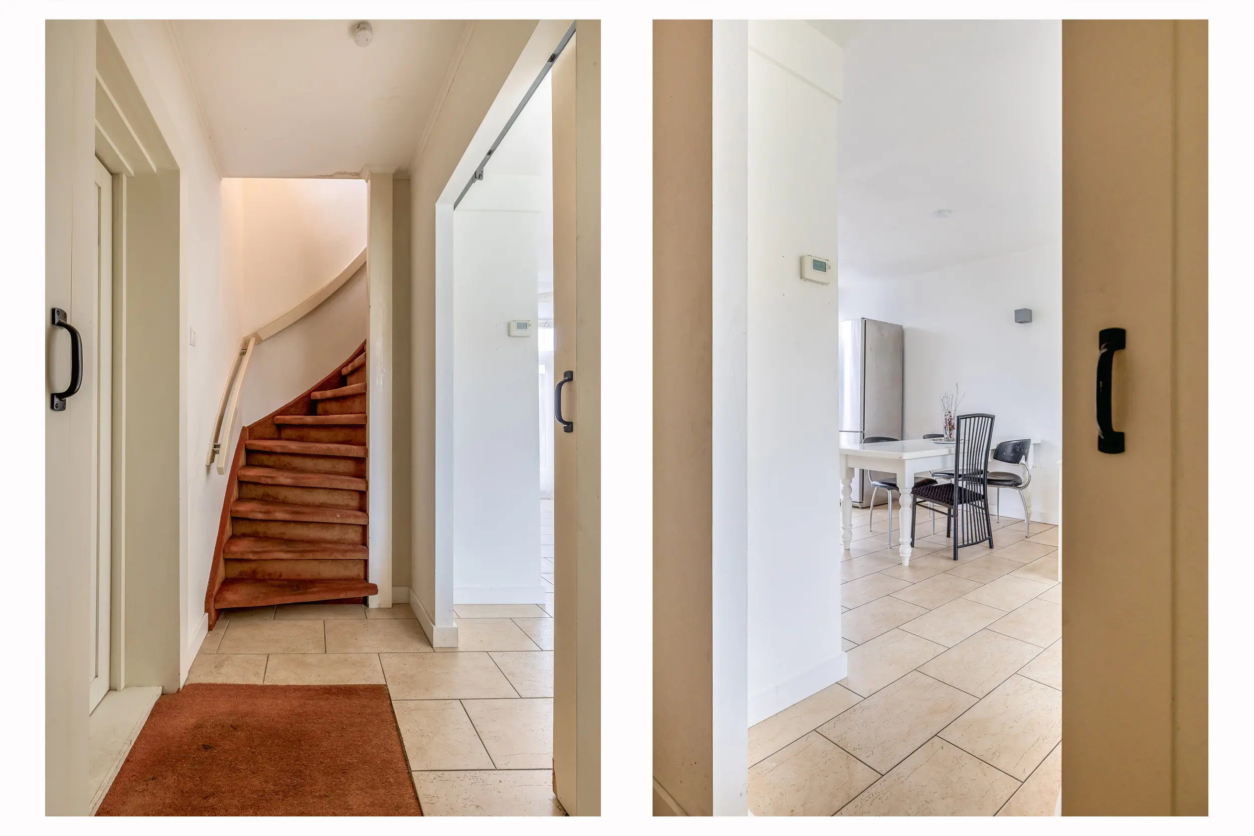 De eerste tussenhal leidt naar de leefruimte. Vanuit deze hal bereikt u het separate toilet, de meterkast en de trapopgang naar de eerste verdieping. Tevens biedt deze hal via een schuifdeur toegang tot de ruime woonkamer.