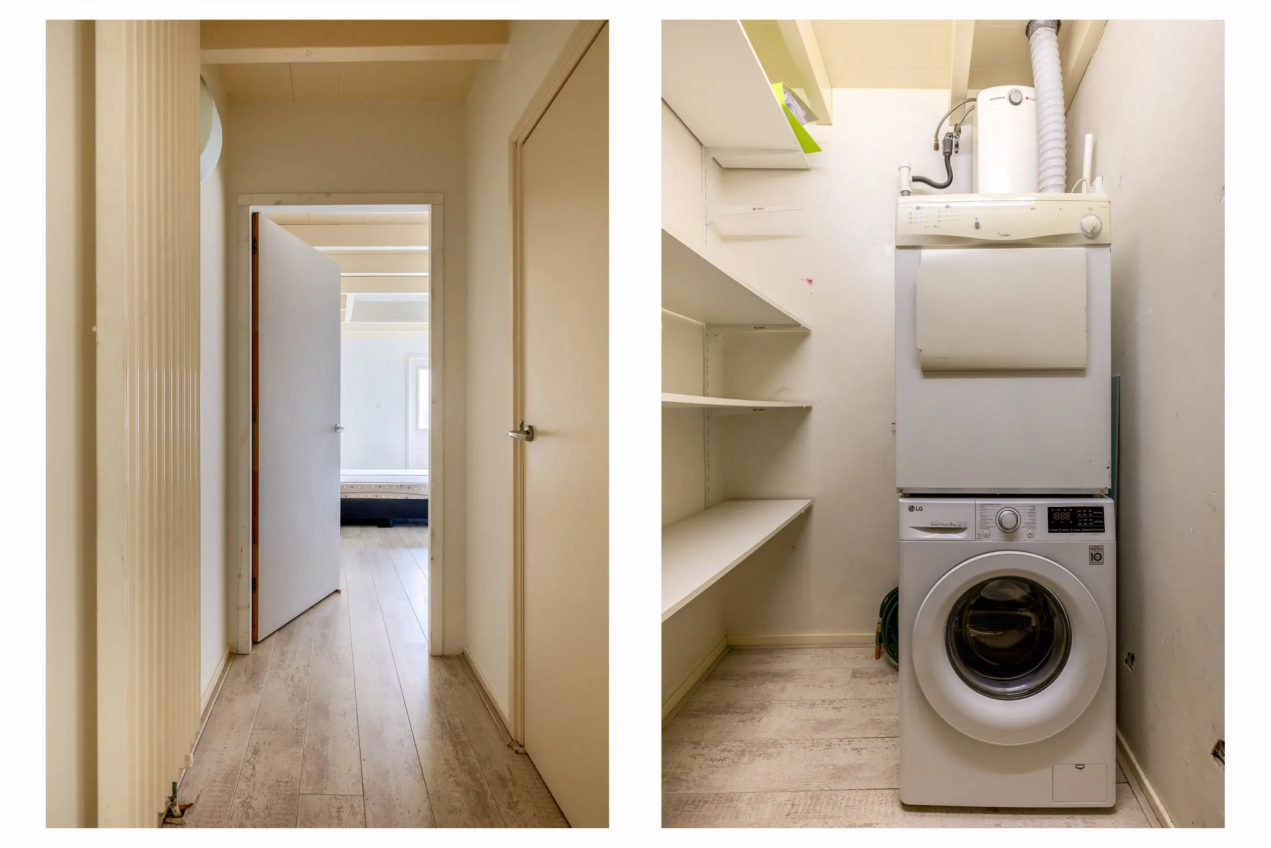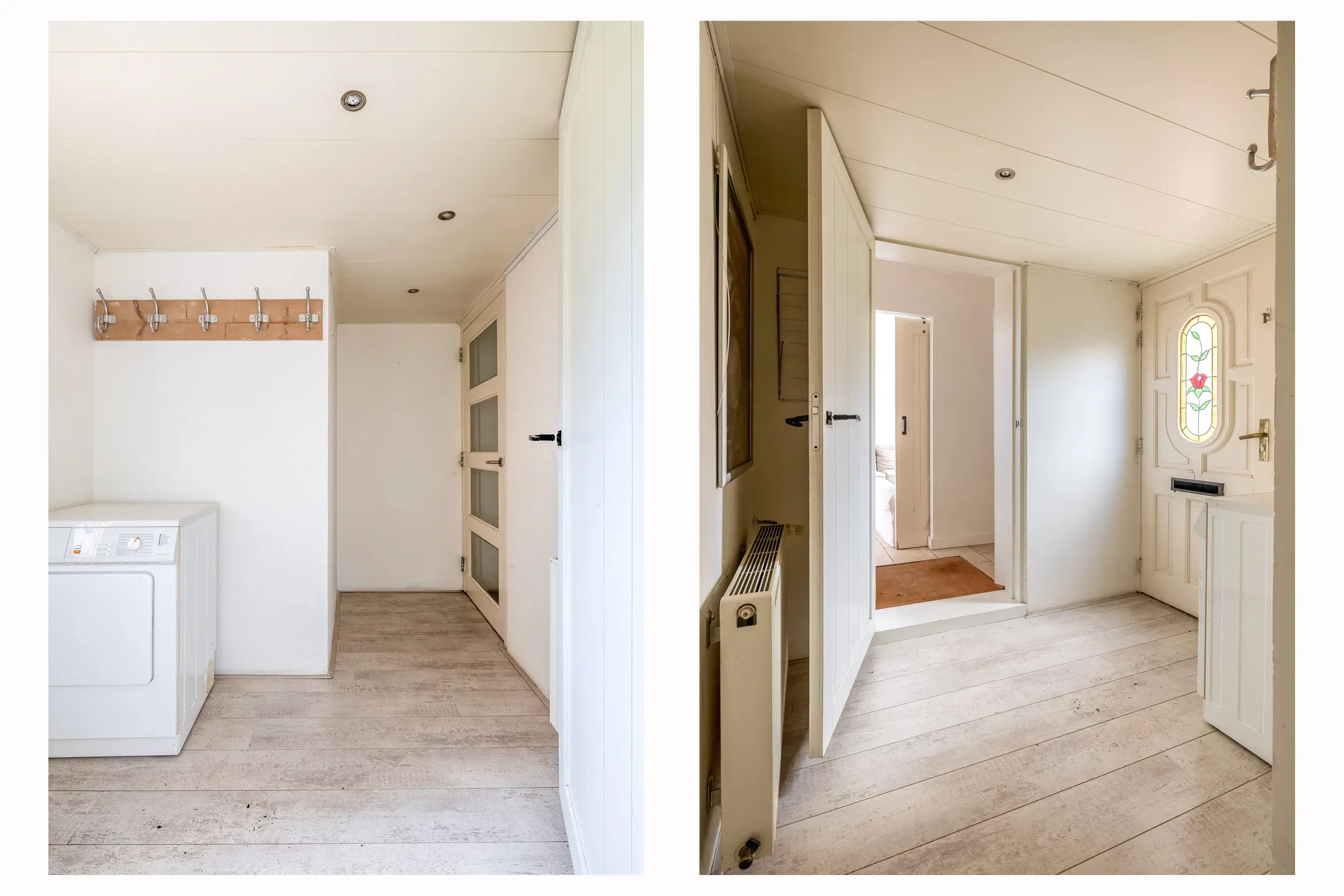 De entree/hal is afgewerkt met een laminaatvloer en beschikt over de aansluiting voor de wasmachine. Vanuit deze hal heeft u toegang tot twee tussenhallen.