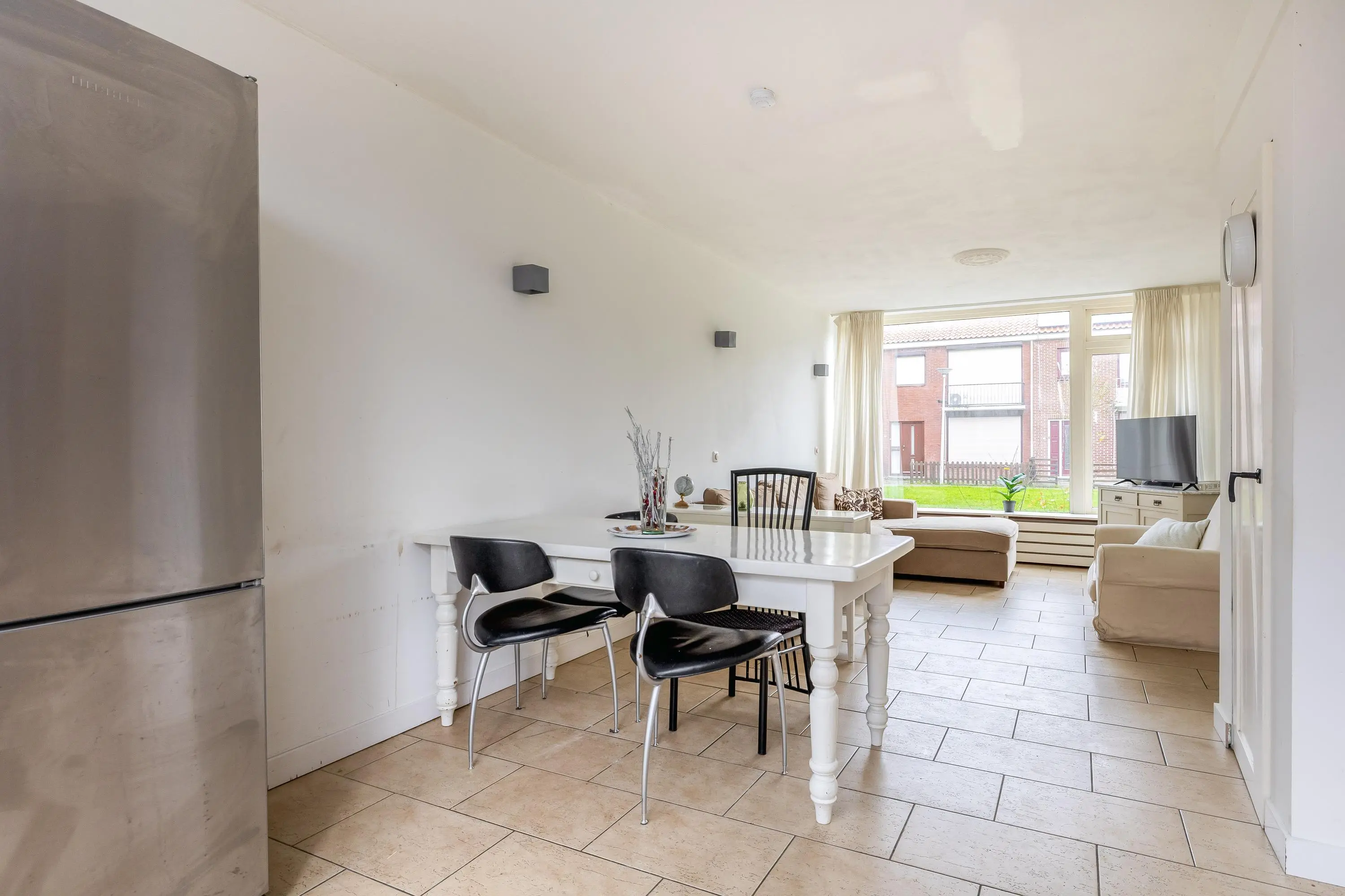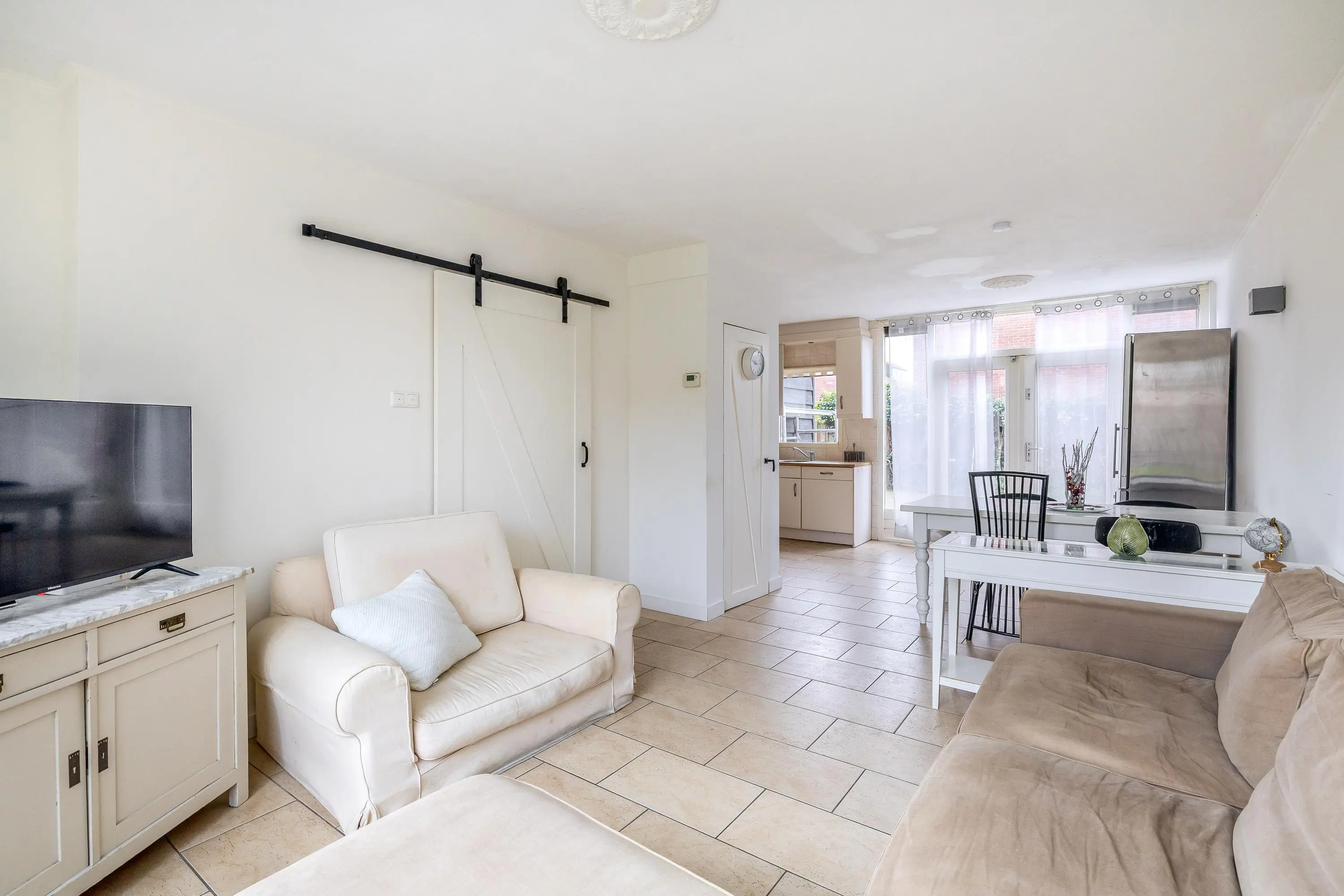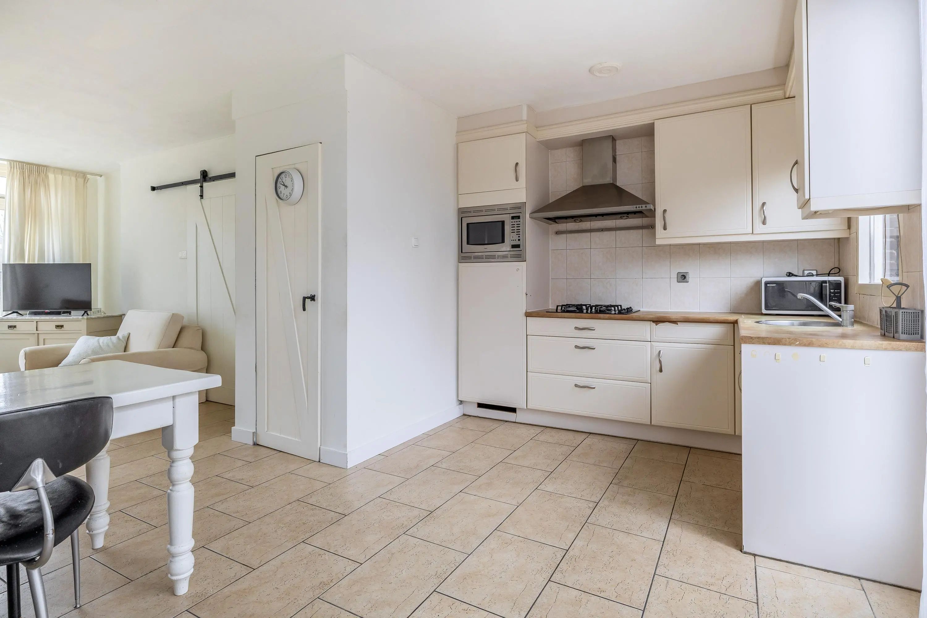 De woonkamer is voorzien van een plavuizenvloer en profiteert van veel natuurlijk licht dankzij de grote raampartijen. De ruimte biedt volop mogelijkheden voor het creëren van een comfortabele zithoek en een aparte eethoek. Daarnaast beschikt de woonkamer over een praktische provisiekast.