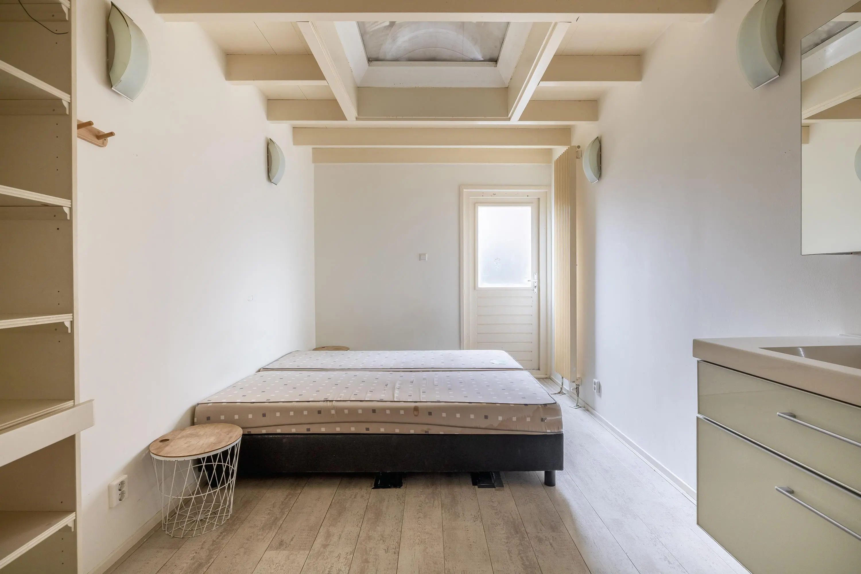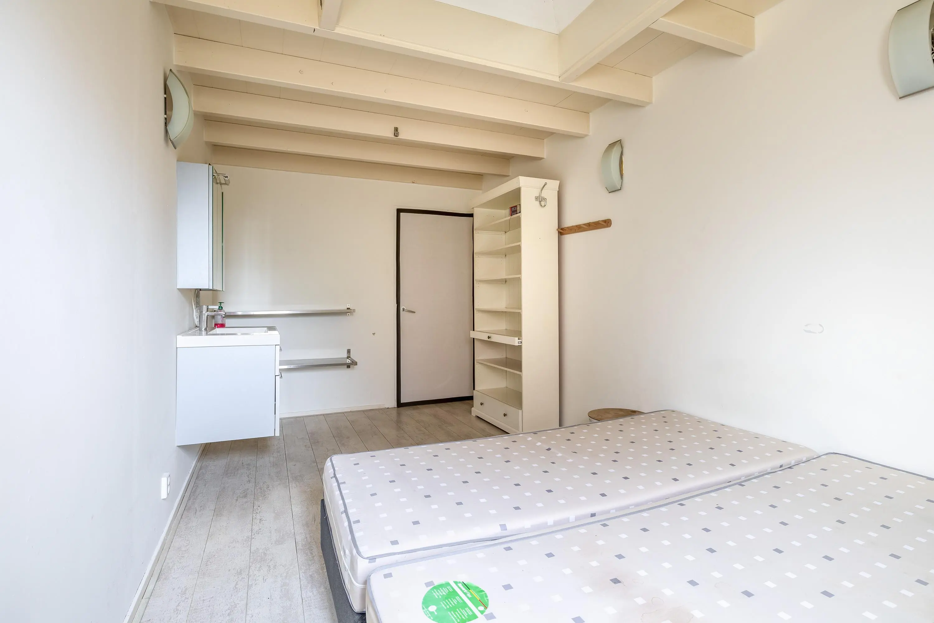 Via de tweede tussenhal bereikt u een aparte berging en een slaapkamer. In de berging bevinden zich de aansluitingen voor de wasmachine en droger. De slaapkamer is gelegen aan de achterzijde van de woning, heeft een oppervlakte van circa 13,5m² en is voorzien van een wastafelmeubel. Vanaf de slaapkamer is er middels een enkele deur toegang tot de achtertuin.