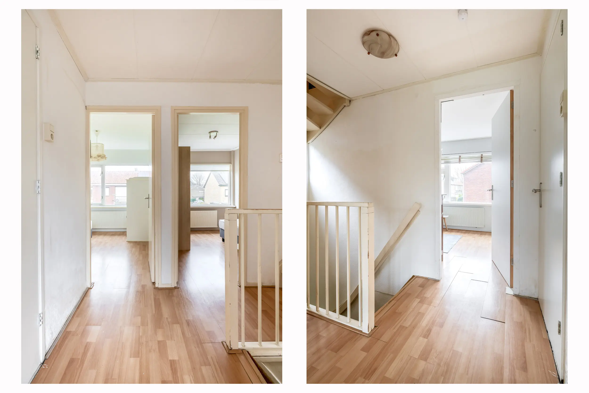 De overloop is voorzien van een laminaatvloer, die doorloopt in alle slaapkamers. Vanaf de overloop heeft u toegang tot drie slaapkamers en de badkamer.